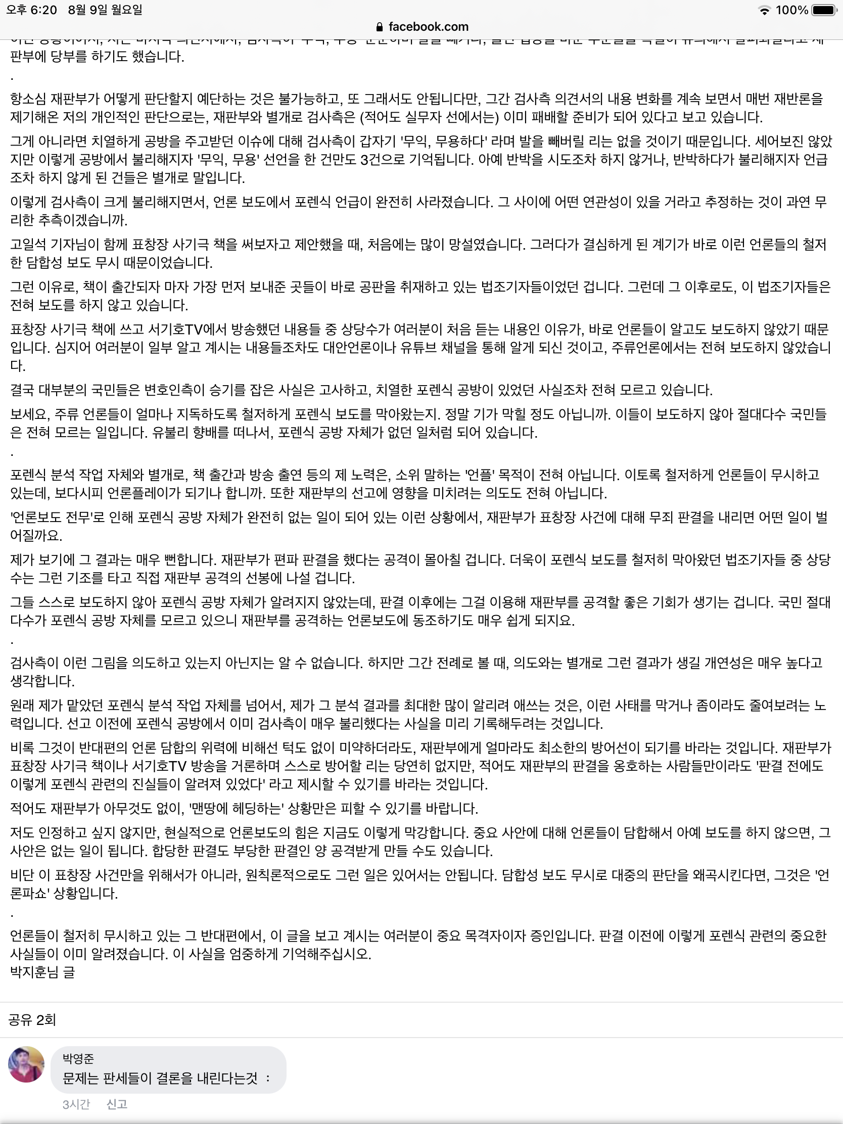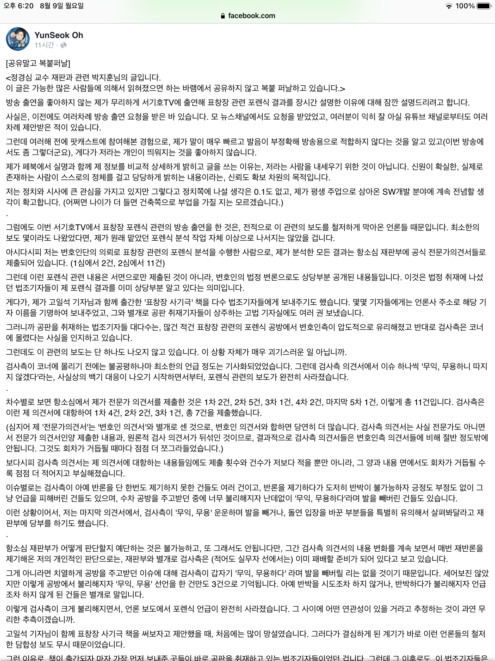 기타 [펌]정경심 재판 포렌식 관련 박지훈님의 글 by choco 2021. 8. 9. 한마디로 요약하면 검새와 기레기의 화려한 콜라보. 미친개에겐 몽둥이가 약이라는 속담이 여기에 딱이지 싶음. 로그인 또는 가입하여 보기 Facebook에서 게시물, 사진 등을 확인하세요. www.facebook.com 공유하기 게시글 관리 出 塞 관련글 전광훈과 국민의짐 일당의 똥 4탄 + 카카오 전광훈과 국민의 짐 일당의 똥 3탄 정경심 교수 최후 진술 문재인 대통령 타임지 표지