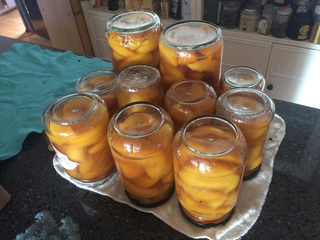 1. 병에 복숭아는 70% 정도. 시럽은 병뚜껑에 닿을 정도로 찰랑하게 채운다. 복숭아가 식으면서 시럽을 흡수하는지 꽉 채운다고 했는데도 시럽이 복숭아 아래로 내려가 있음. 서양 아줌마들 보면 이대로 식품저장고에 두고 1년 내내 먹던데 아무래도 좀 불안하기도 하고 또 냉장고에 여유가 있어서 그냥 냉장고에 넣었다. 밖에 둘 거면 저장성을 위해서 꼭 푹 잠기게 해야할듯.