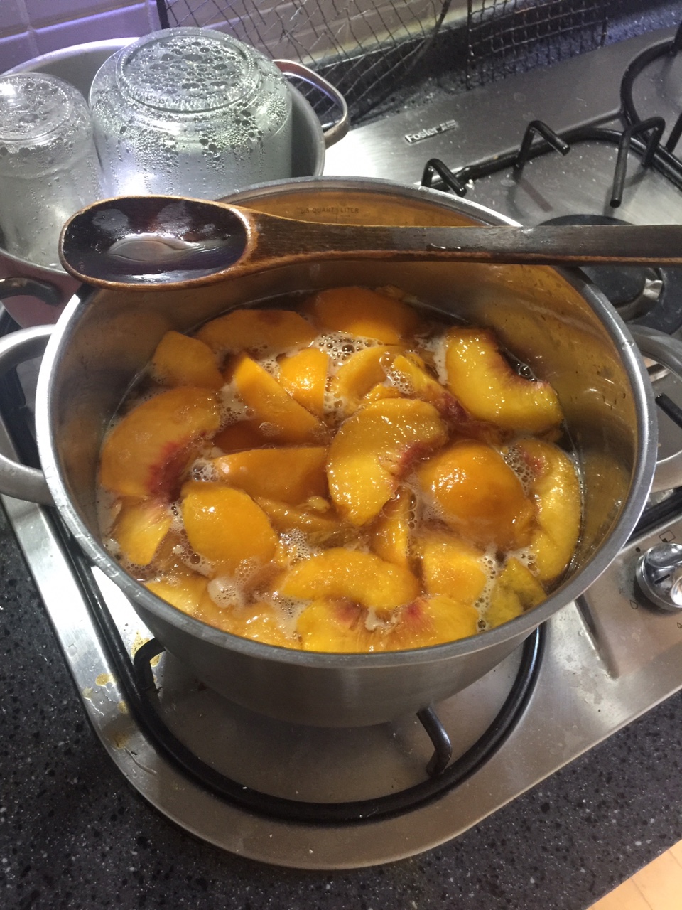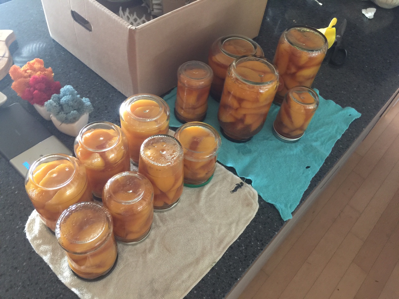 그러나.... 복숭아 한 상자는 도저히 혼자 할 작업은 아니지 싶어서 결국 이상한 짓을 많이 해본 일머리가 있는 내가 시럽 끓이기, 병 소독, 복숭아 조림 병에 담기 등 60%, 동생이 40% 정도 분담.