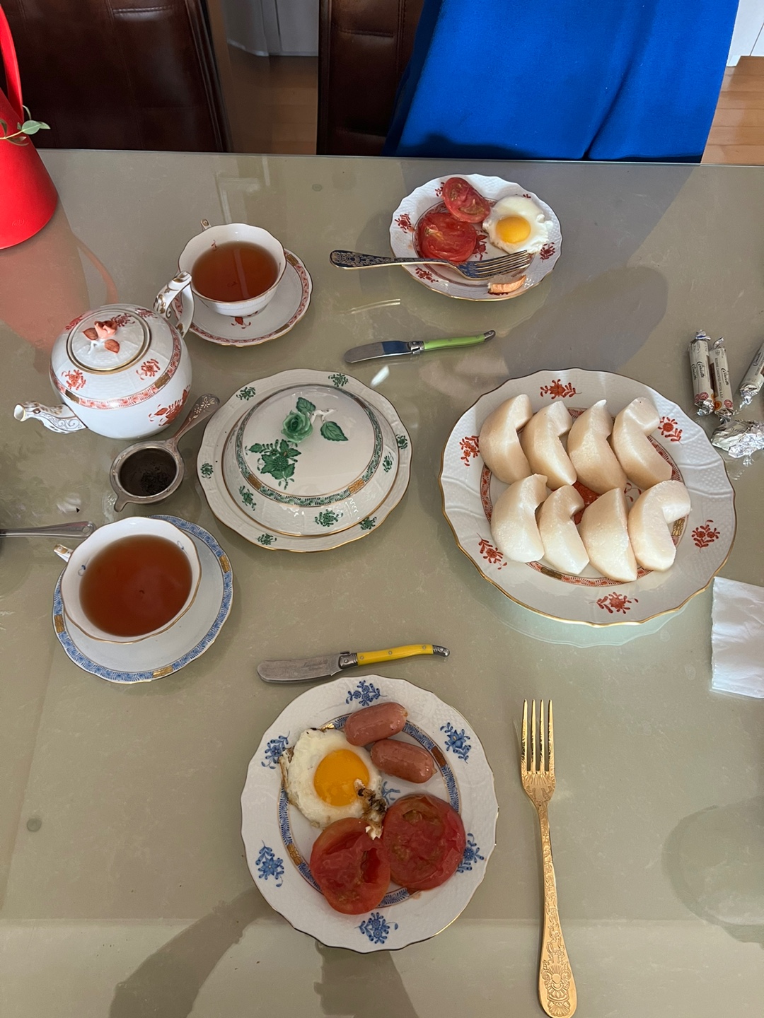 간만에 헤렌드 아포니를 써보고 싶어서 차린 날인듯. 토스트와 달걀, 소시지 등 전형적인 잉글리쉬 브렉퍼스트~ 차도 아마 그런 영국차 계열이었던 걸로 기억. 아포니는 참 단아하니 예쁨.