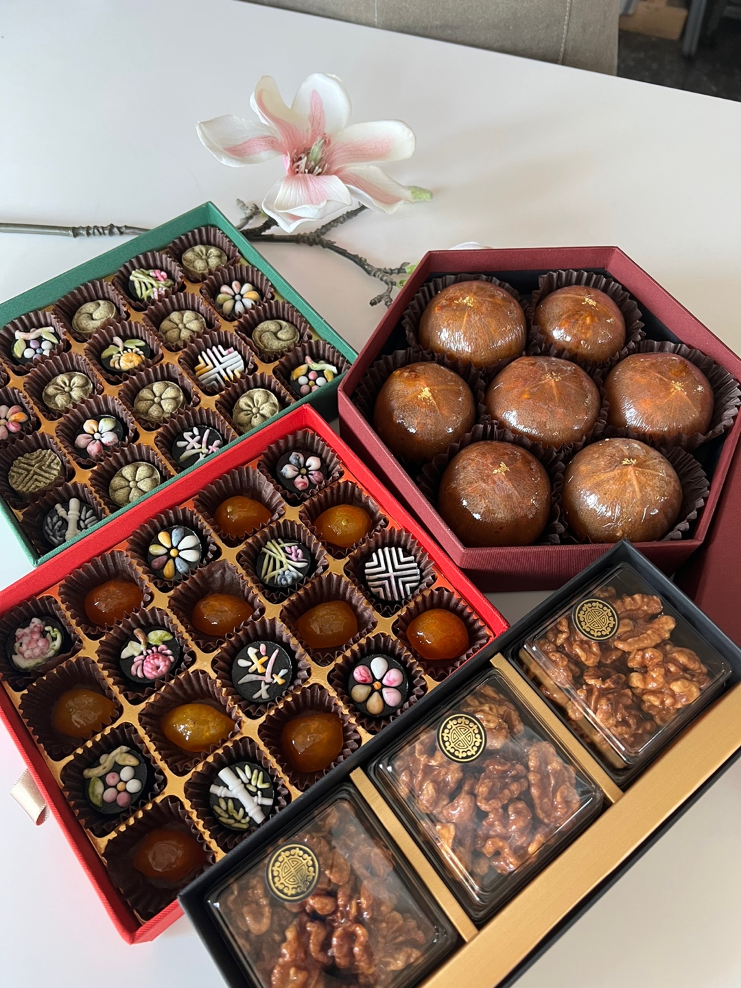흑임자와 서리태 다식 두종류, 호두와 금귤 정과 두종류. 호두 정과는 한없이 들어가기 때문에 자제해야지 안 그러면 느끼해서 고생함. 다 예쁘고 맛있음~