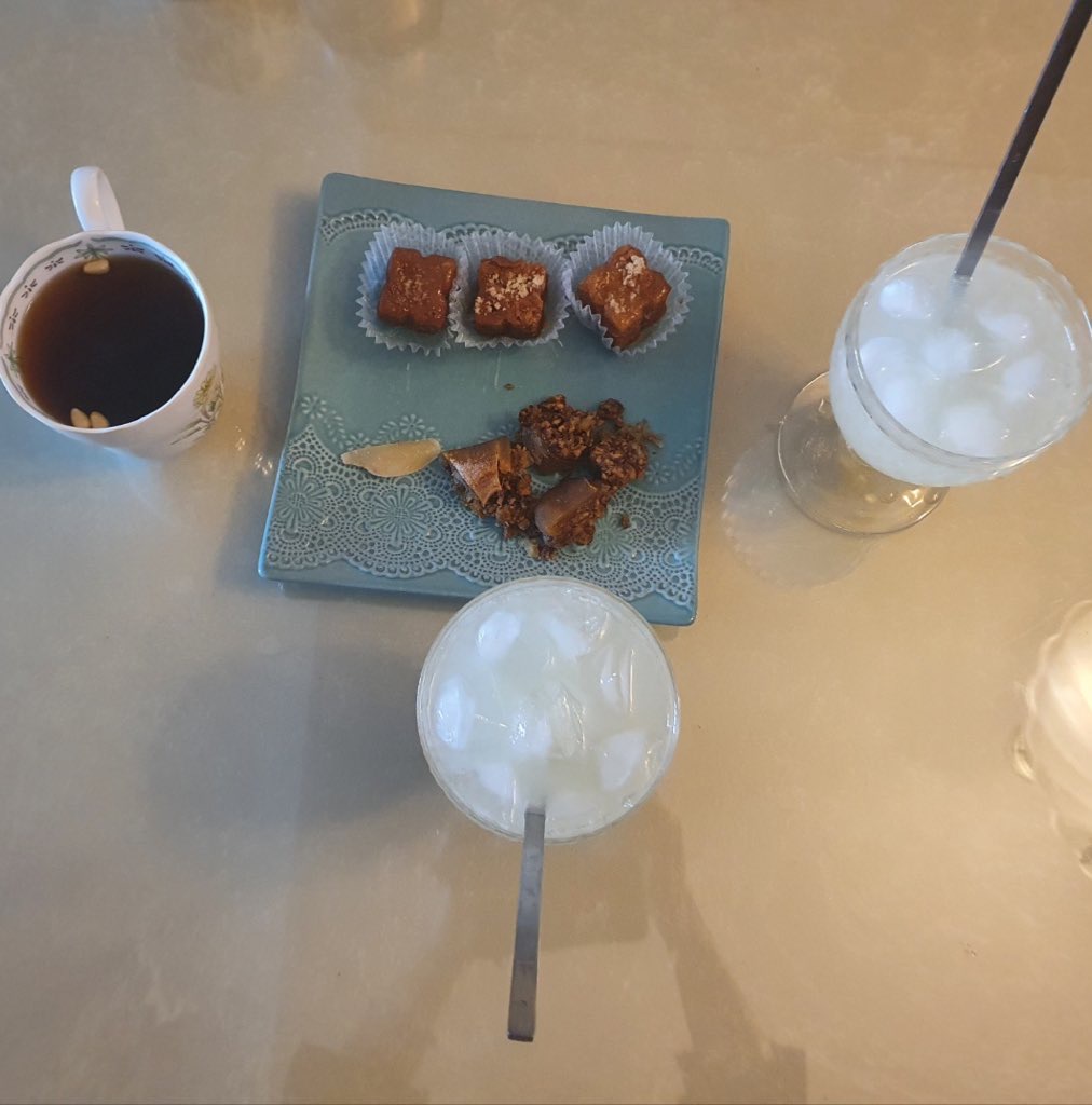 코로나로 몇년 만에 친구들과 하나에서 점심 먹고 우리 집에서 티타임. 도라지청이며 곁들임 다식을 보니 6월 11일이나 18일 정도이지 싶다. 코로나 검사까지 받아보고 온 감기 환자는 뜨거운 도라지청차, 멀쩡한 두 사람은 레몬생강청을 탄 탄산으로~