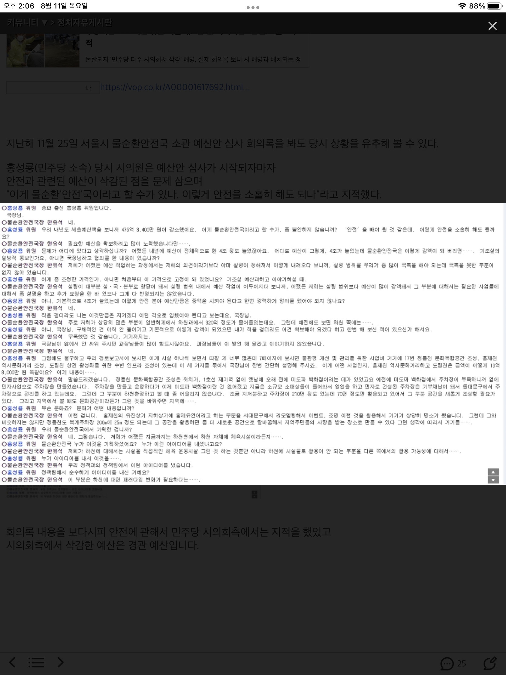 수방 예산 줄여거 제출하고 그나마도 겉에 보이는 부분에만 쓰는 거 지적한 시의회 회의록. 민주당 시의회가 예산 깎았네 어쩌네 하면서 또 기레기들 시켜서 언플 하던데 이런 자료 공개되는 시대가 참 싫을듯. 대통령실처럼 다 비공개하고 싶어 호시탐탐 기회만 노리지 싶긴 함.