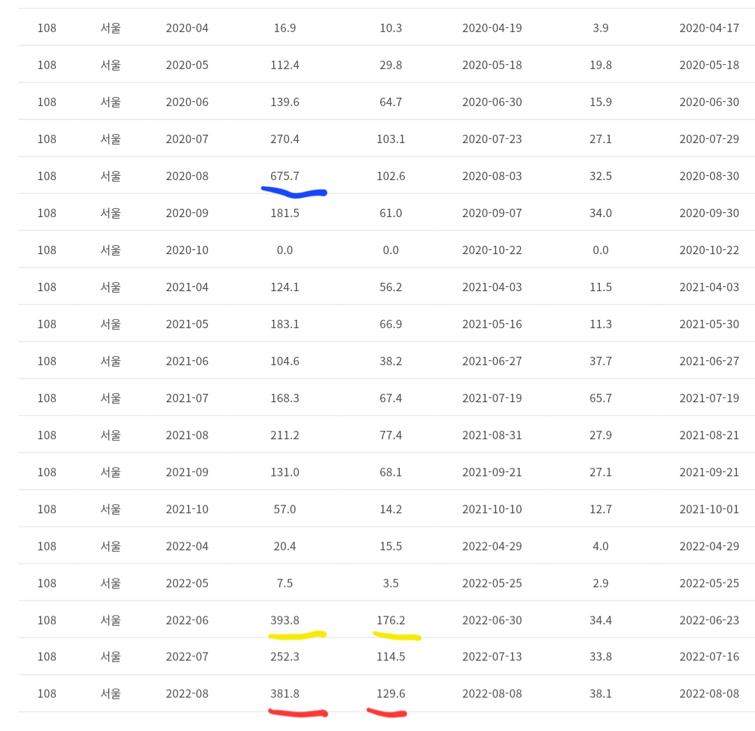 115년만의 호우 어쩌고하는 거짓말로 불가항력의 천재로 몰아 미친듯이 정부 편을 들어주려는 기레기들에게 현혹당하지 않기 위한 기록. 2020년에는 2배 정도 더 내렸고 지난 6월도 이번보다 더 왔다. 예산은 다 날리면서 곁만 빤지르르하게 만들고 하수로 정비 같은 기본 중의 기본도 안한 오세훈과 윤석열과 그것들 찍어준 인간들의 콜라보.