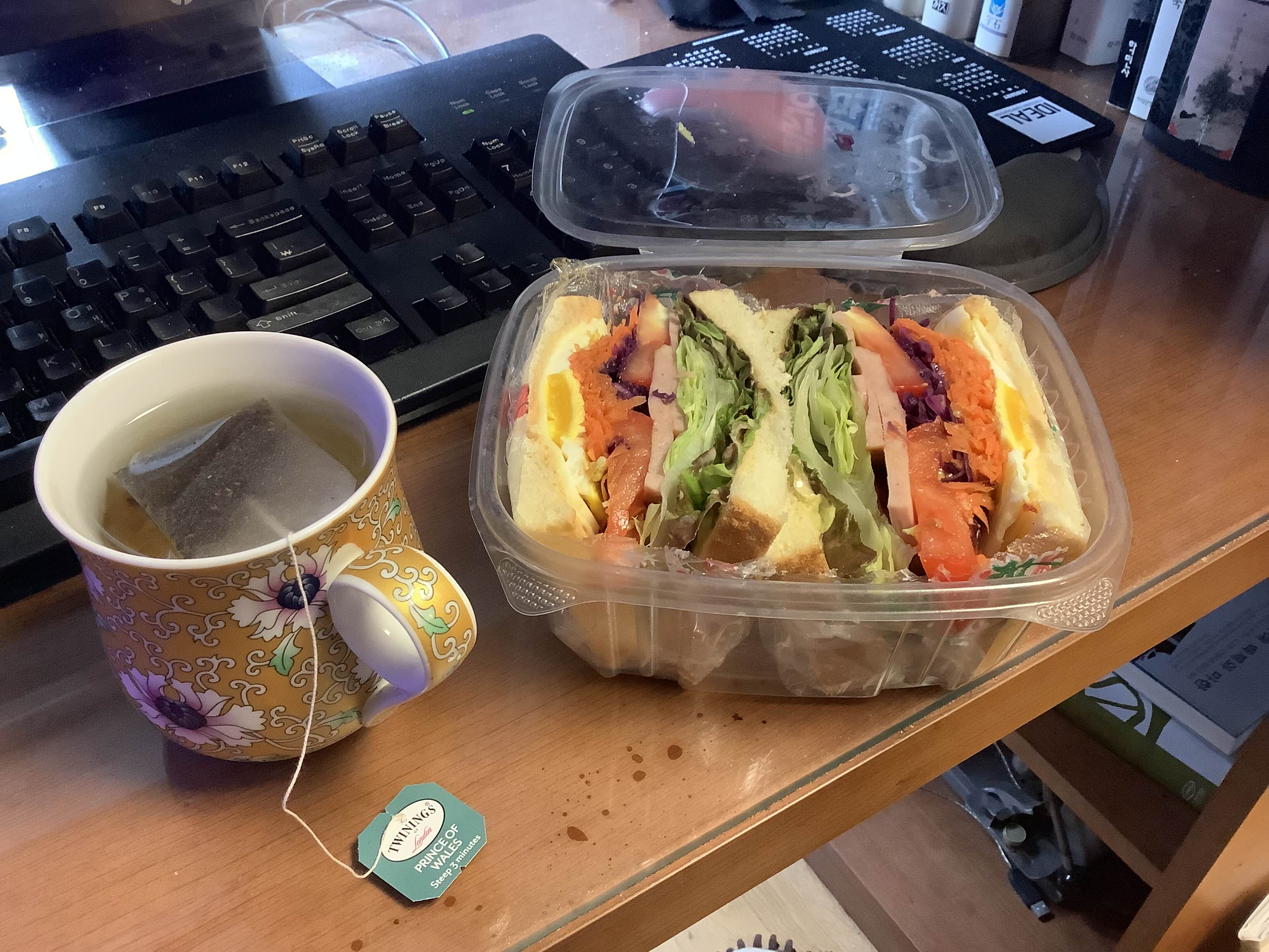 냉장고에서 시들거리는, 세일로 사와서 열심히 먹고 남은 보라양배추와 한상자 토마토 산 날, 단골 달걀 농장에서 달걀 주문할 때 선물로 예상치 않은 토마토가 함께 와서 열심히 먹어야 하는 관계로 만든 채소 빵빵 햄치즈 샌드위치. 오랜만에 만들었더니 감이 떨어져서 빵빵함이 좀 덜하긴 하지만 그럭저럭 모양은 갖춘. 딜마의 블퍼를 우릴 예정이었으나 다 마셨는지 안 보여서 트와이닝의 프린스 오브 웨일즈. 은은한 훈연향이 햄 샌드위치와 잘 어울렸다.