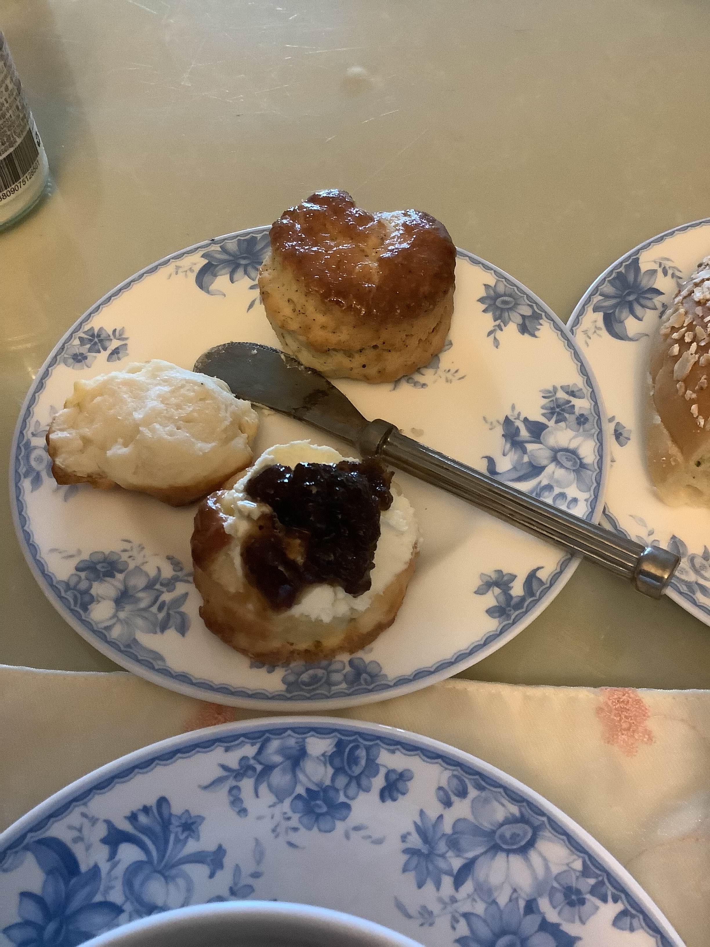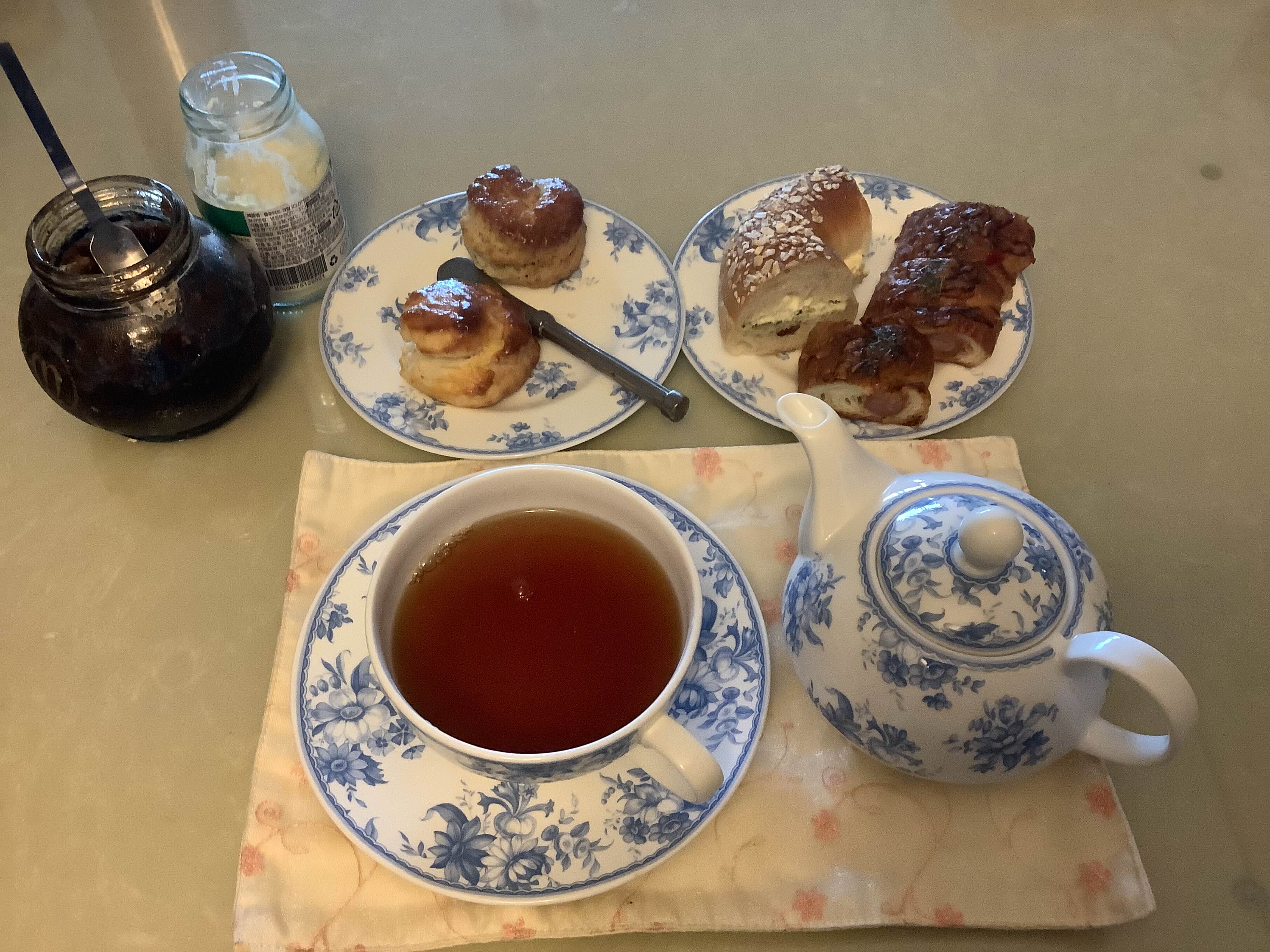 구워놓은 플레인, 얼그레이 스콘과 클로티드 크림, 장미잼. 브래드05의 소세지 패스트리. 비가 와서 뜨거운 차와 스콘 등등 따뜻한 티푸드가 잘 어울렸던 날로 기억함. 머그에 대충 우리는 건 싫으나 티포트와 찻잔까진 꺼내기 귀찮아서 오래 전 영국에서 사온 위타드의 티포원과 접시들이 간만에 일을 했음.