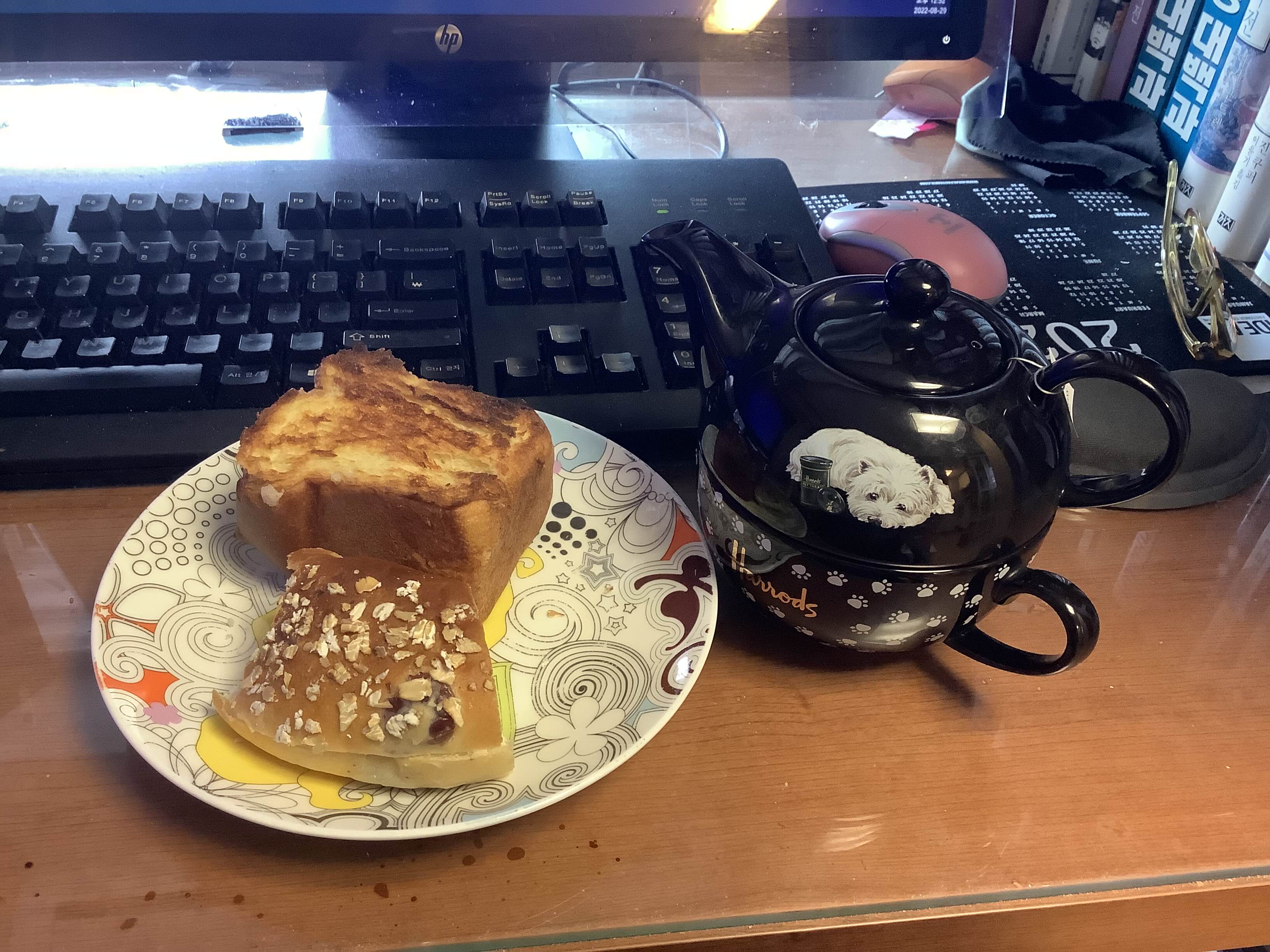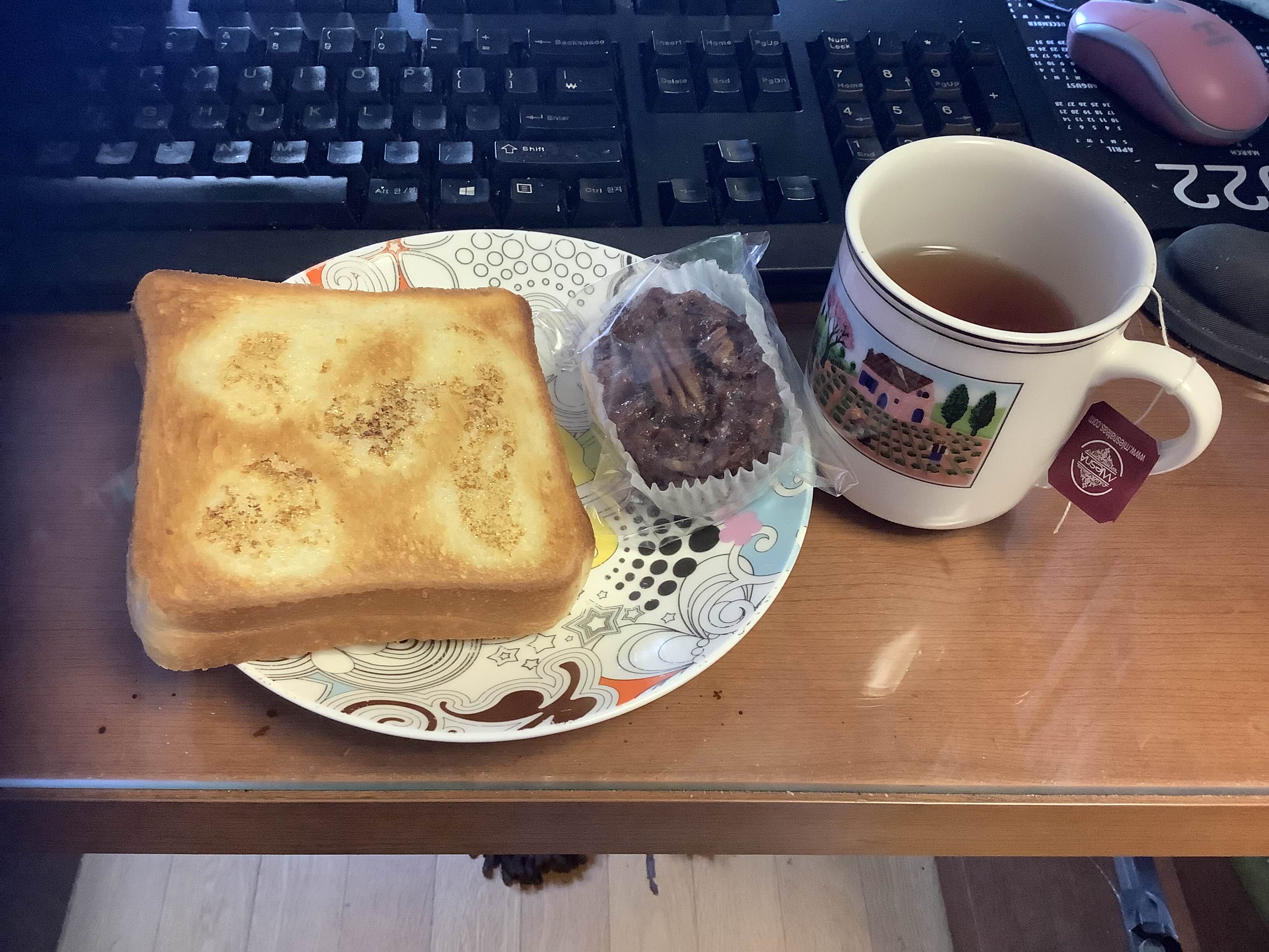 오늘 점심 티타임. 믈레스나 홍차에 버터 토스트와 피칸파이. 근데 다른 거 먹느라 피칸파이는 그냥 다시 냉장고로~