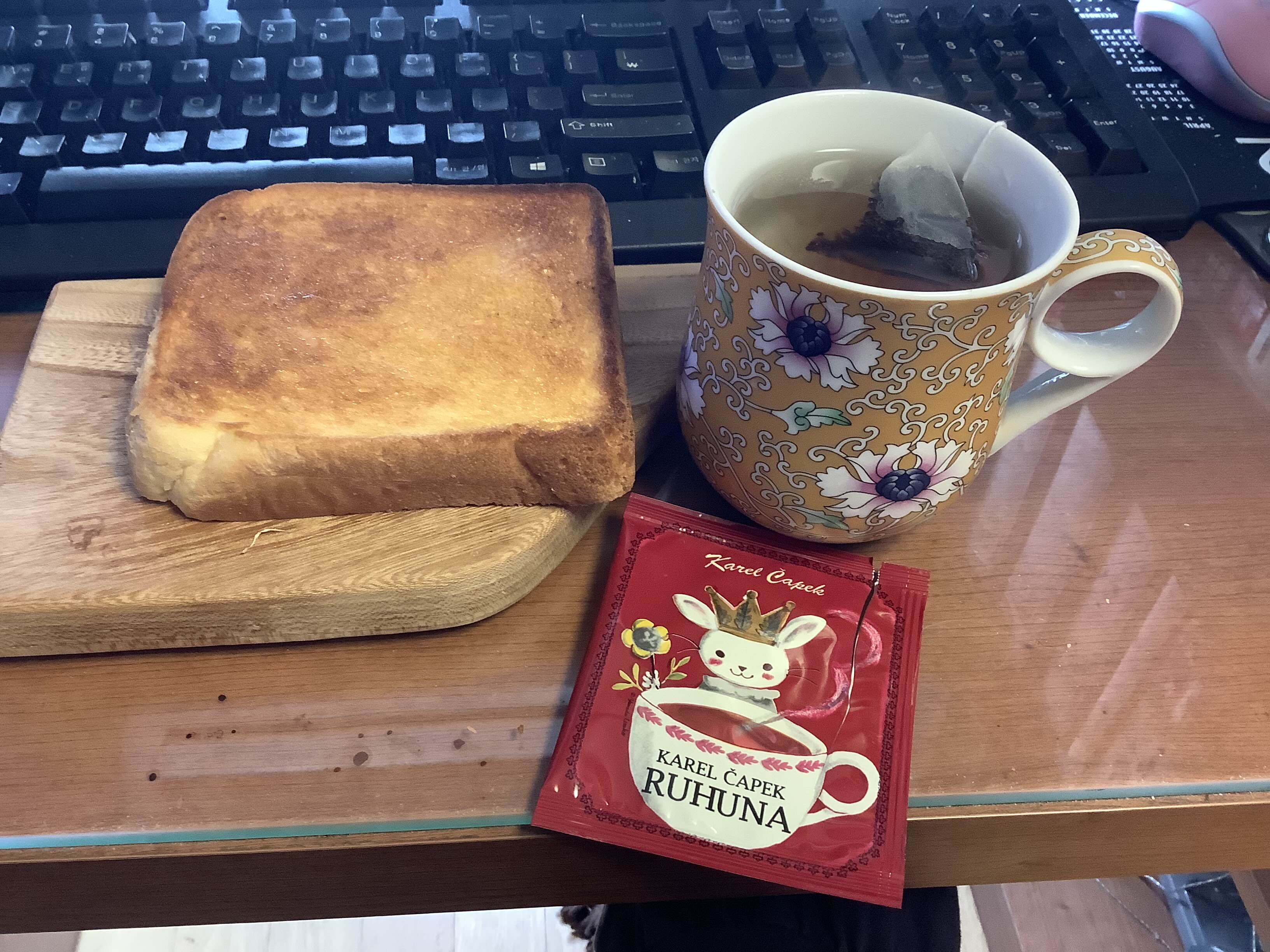 올해는 더위가 일찍 끝나서 8월 중하순부터 물을 끓이기 시작했다. 8월 중하순의 어느날인듯. 올해는 더위가 빨리 물러가서 뜨신 차를 이르게 시작~ 제인 오스틴의 티타임을 흉내 낸 두툼한 버터 토스트와 홍차. ㅌ님이 나눠주신 카렐. 얘네 티백은 세월이 흐를수록 더 예뻐지는듯.
