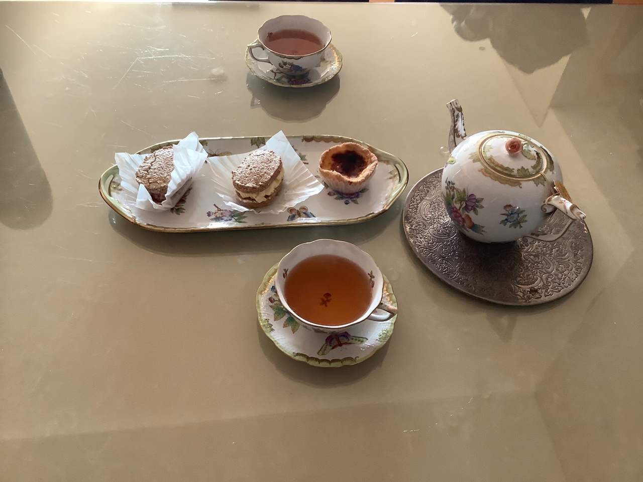 세팅된 디저트는 동생의 다쿠아즈와 에그 타르트. 당연히 맛있다~ 차는 성탄 시즌을 맞아 마리아쥬 프레르 노엘을 개봉했는데 달달한 디저트와는 좀 아니었음. 차에 설탕이 들어간 건 아니지만 달게 느껴지는 시나몬, 정향 등등의 향에 티푸드까지 다니까 깔끔하게 씻어주는 힘이 약했다. 단 디저트에는 클래식 블렌딩이나 스트레이트 티! 라는 조합을 기억해야겠음.