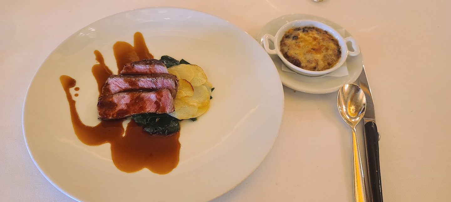 점심 메뉴의 메인은 토마호크 스테이크. 통으로 구운 걸 썰어서 내기 때문에 선택의 여지 없이 미디움 정도. 촉촉하니 잘 구워서 맛있고 옆에 있는 그라탕도 프랑스 소시지가 진하니 맛있음.