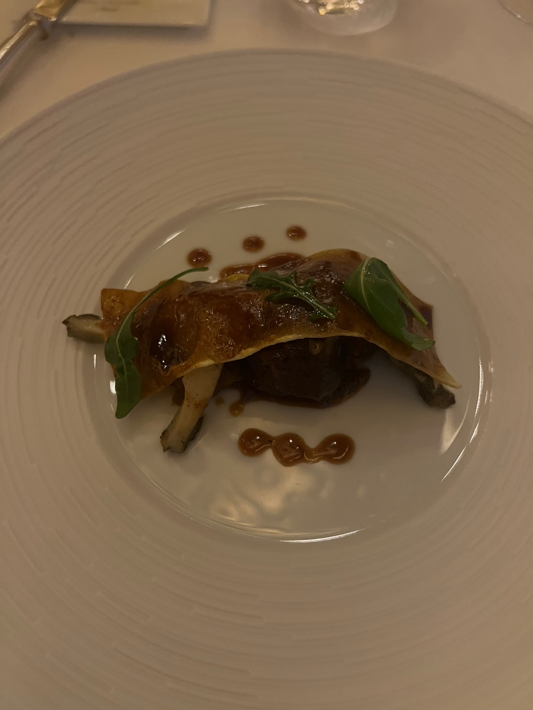 전복, 돼지볼살을 위에 라자냐로 덮은 건데... 이 자체로는 나쁘지 않았으나 메인과 이어지는 직전 요리로는 확실히 에러.  강약 조절이 안 되었다고 해야하나?  비슷한 느낌의 요리가 이어져서 메인이 죽어버렸다.