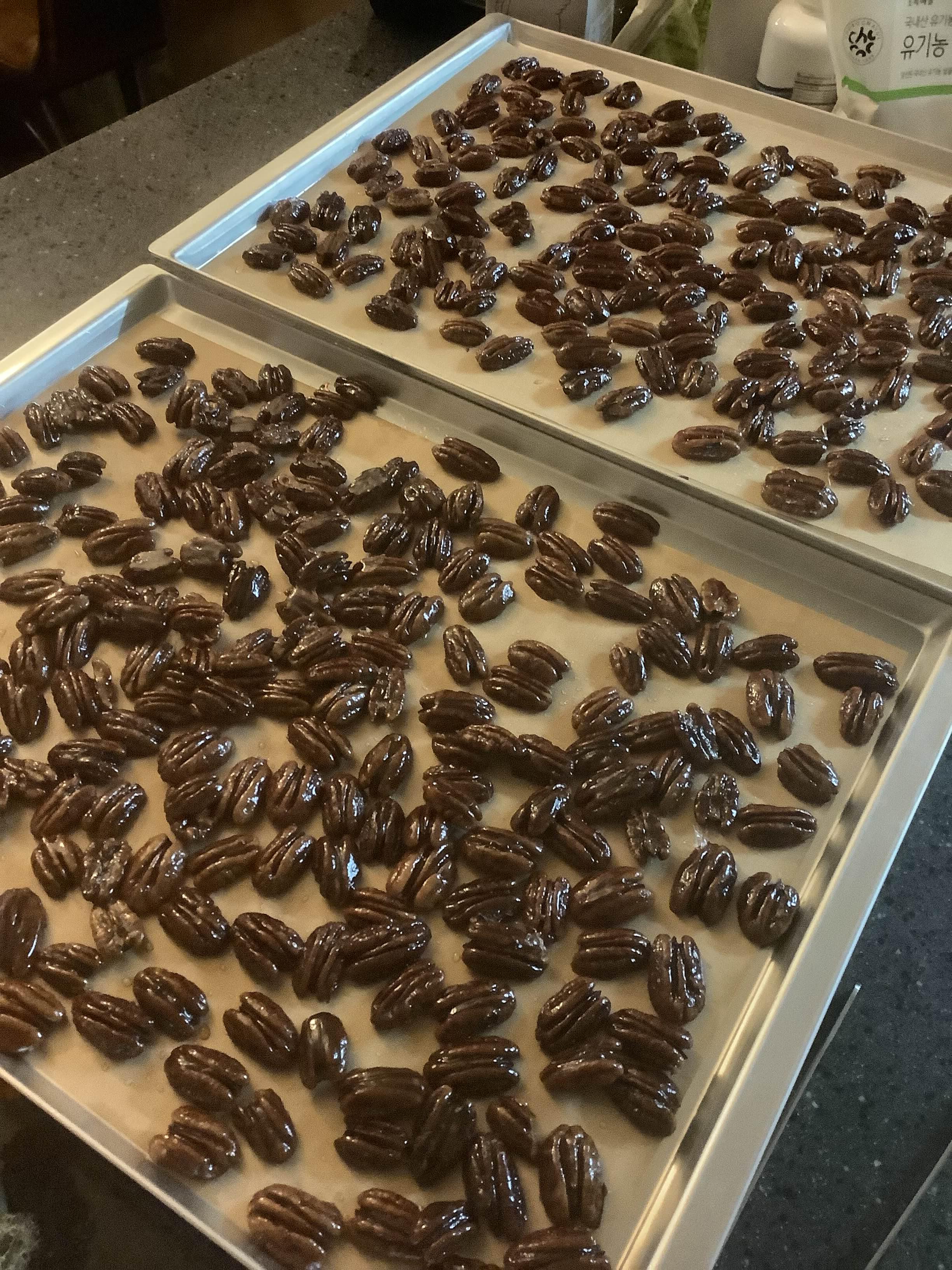 차례상에 올리고 선물도 할 겸해서 작년 세일 때 왕창 사놓은 거 날이 더워지기 전에 소진하려고 럭셔리한 피칸 강정을 제작. (호두보다 3배 정도 비싼데 부친은 지금까지 피칸이 더 싼 걸로 알고 계셨다고... ^^;;;;)