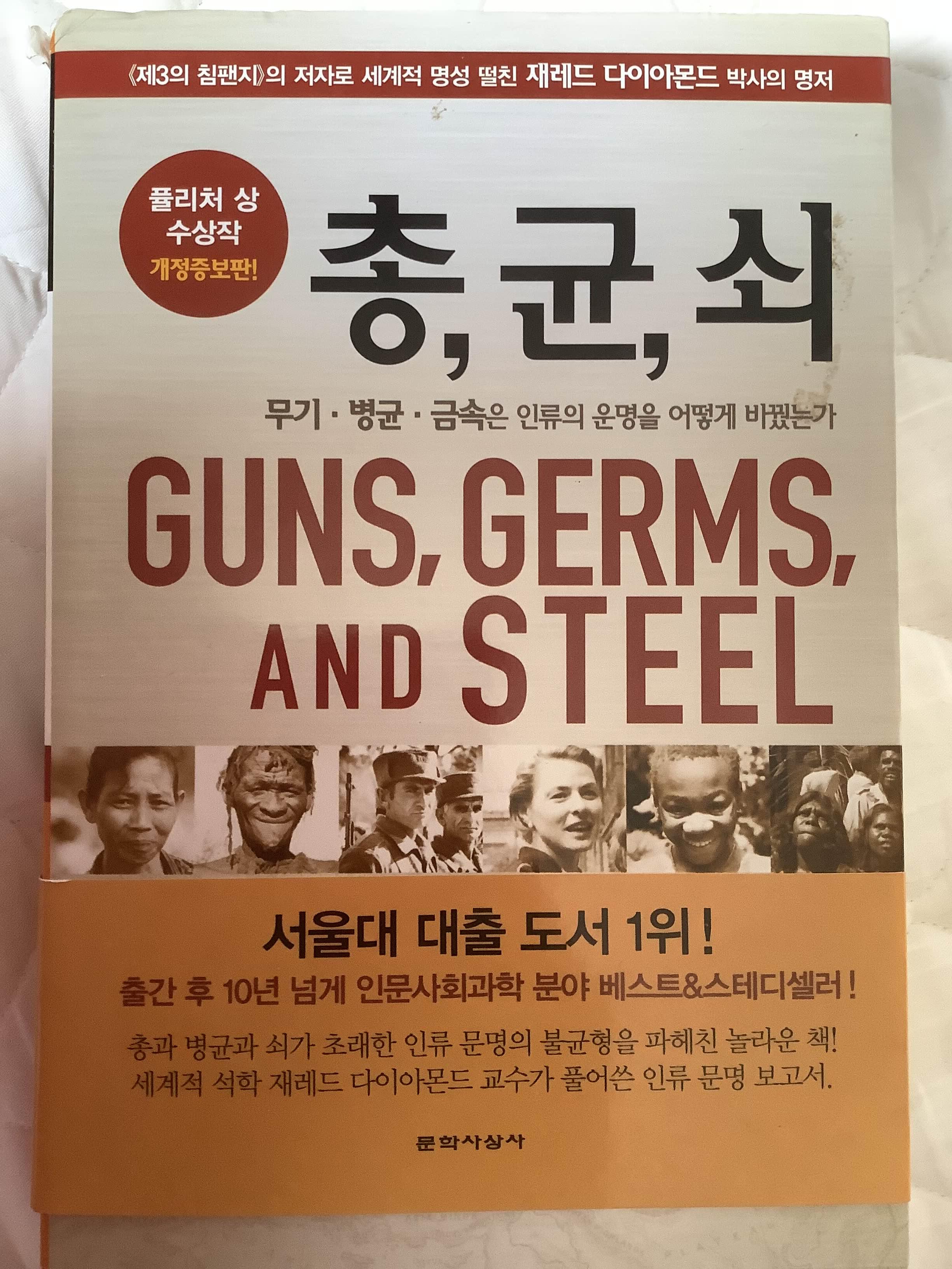 각설하고, 이 책은 처음에 나왔을 때는 온갖 환호를, 그 이후부터는 지나친 축약과 비약이 심하다는 비판을 꾸준히 달고 다녔고 유일하게 열심히 하는 SNS가 트위터인 내 경우는 비판의 비중이 60~70%가 높은 평가를 접해왔다. 그래서 시작할 때 약간 거리감이 있었고 또 비판할 자세가 잡혀 있었지만 읽으면서 '스테디셀러인 베스트셀러는 이유가 있다.'는 결론에 도달. 저자 스스로 책에서 인정했듯이 13000년에 걸친 모든 대륙의 역사를 600쪽 정도에 압축하려면 간략할 수밖에 없다는 걸 인정해야 하고, 그걸 제대로 해냈다는 것에 나는 박수를 보냄.