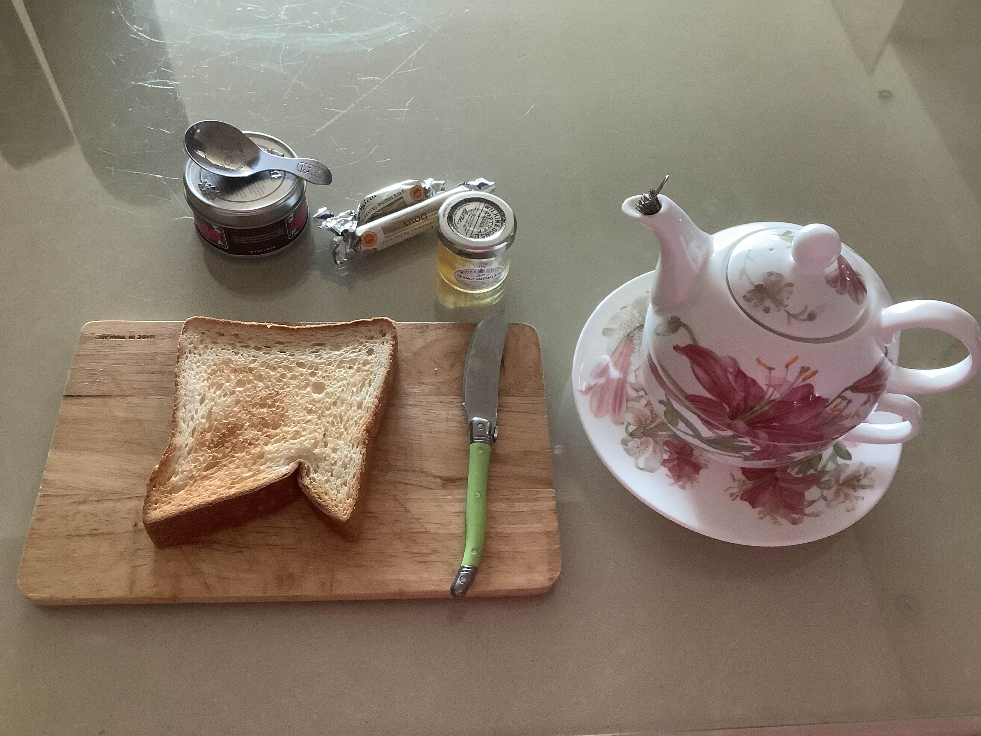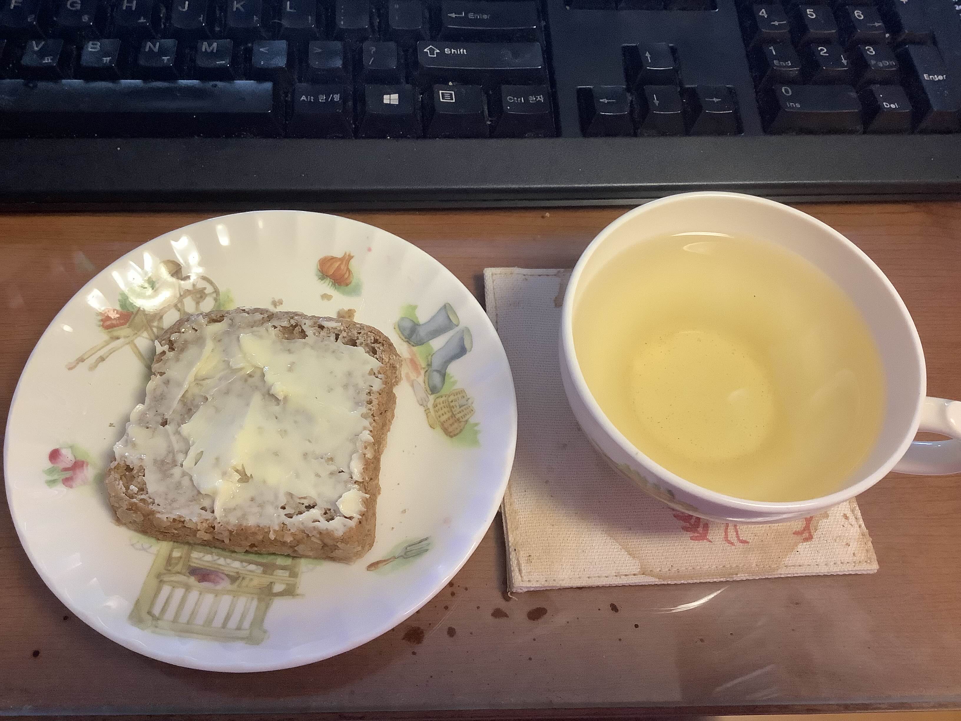 쿠스미의 초콜릿 에픽에 맞춰서 밀도 리치 식빵 버터 토스트. 대상포진백신 맞고 골골하던 때라 솔직히 맛도 모르겠었고... 약을 먹기 위해 뭐든 뱃속에 넣어야 한다는 일념으로 택한 가장 간단한 점심. 😗