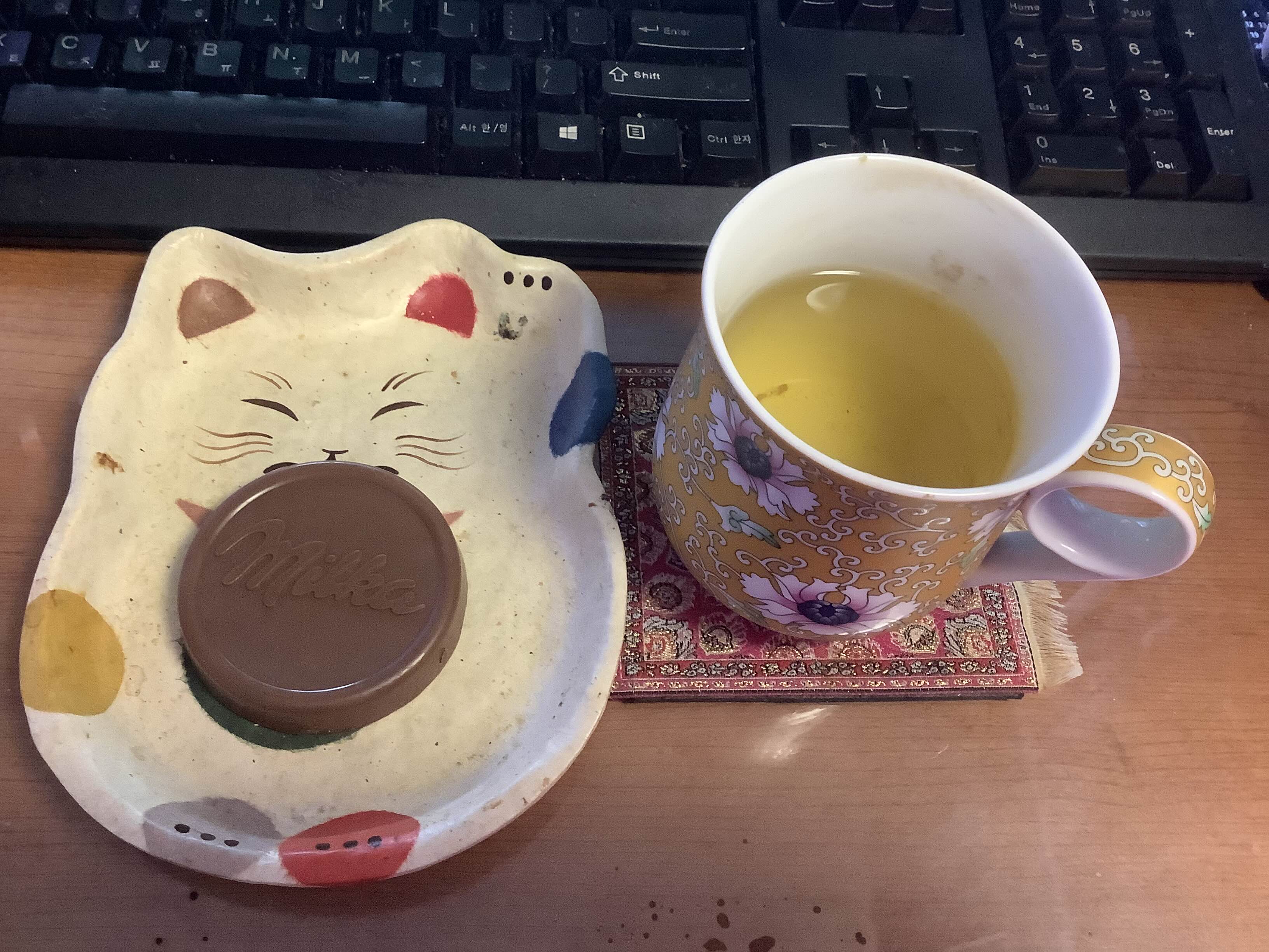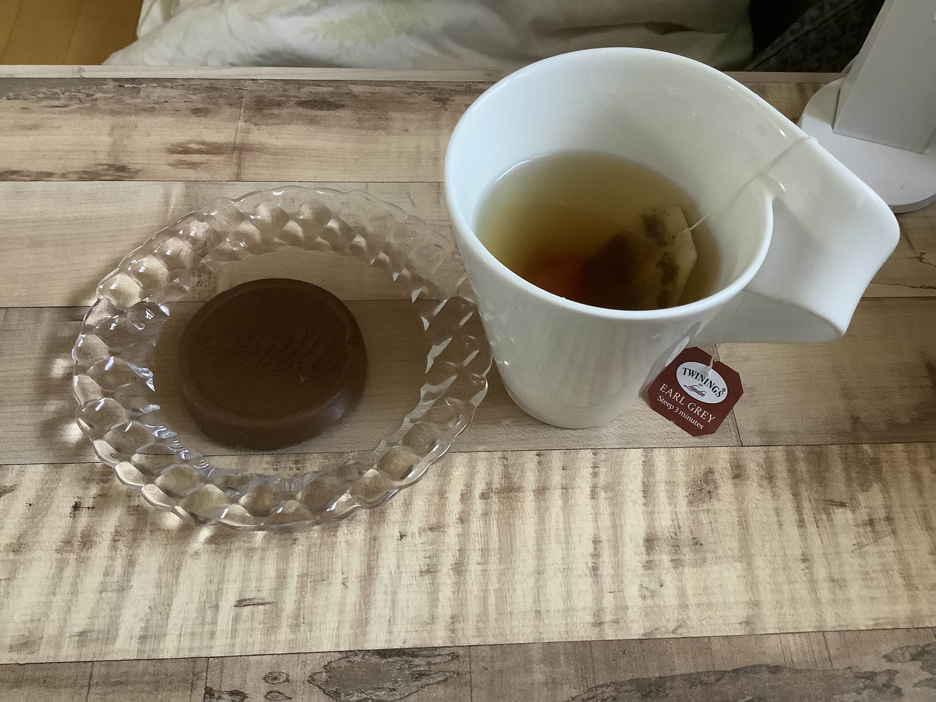 일요일 오후의 홍차. 트와이닝 얼그레이와 밀카의 초코 웨하스. 귀찮아서 점심을 끓여놓은, 보온병에서 좀 식은 물을 썼더니 향이...🙄 제대로 즐기려면 역시 부지런해야 함.