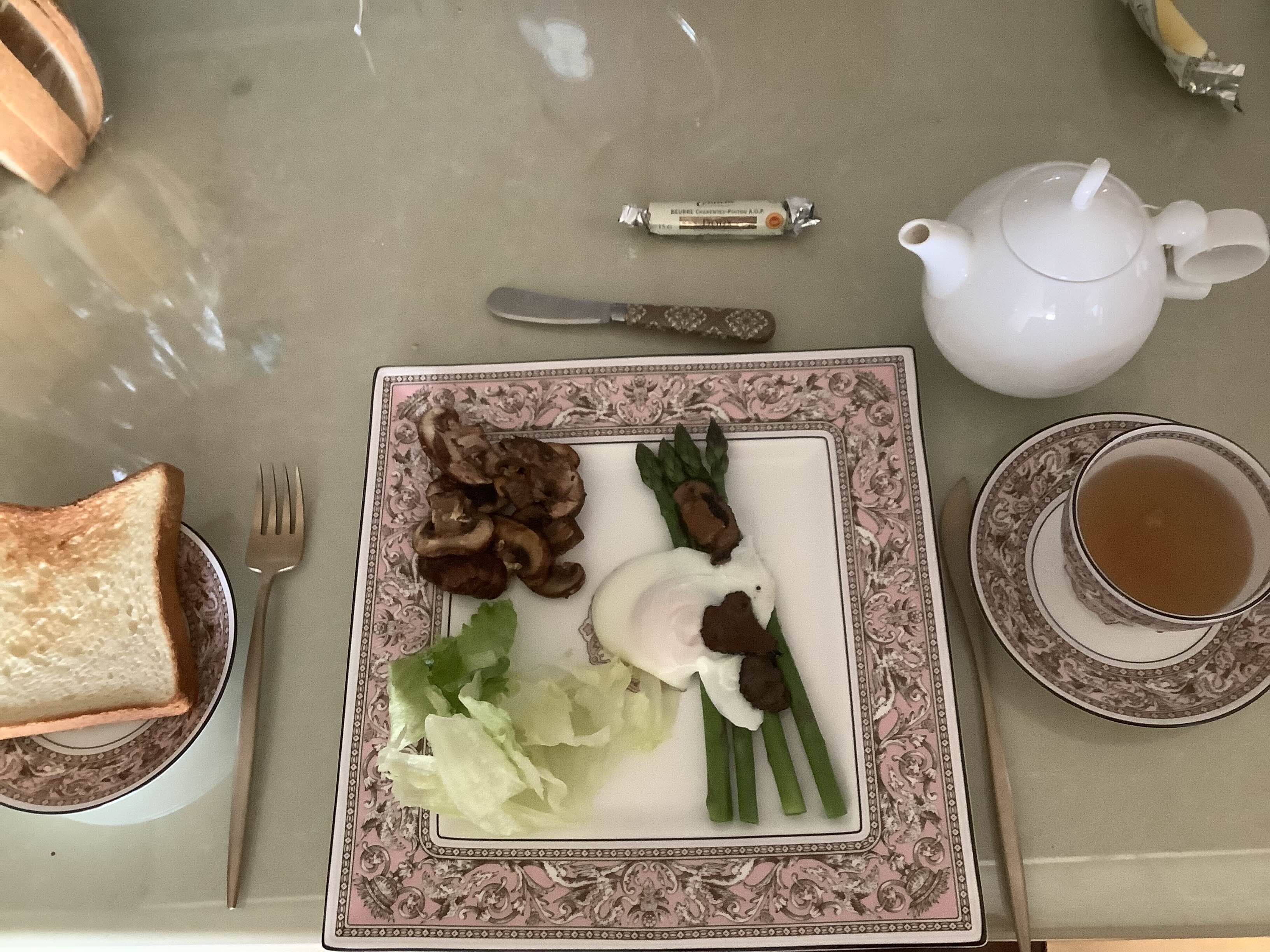 어글리어스에서 온 아스파라거스와 수란과 트러플 버섯을 올린 브런치. 홍차는 마리아쥬 프레르 얼그레이 임페리얼. 트러플 올릴 생각을 하면서 왜 버섯을 또 볶았는지... 잠깐 정신이 나갔었나 보다. 😅