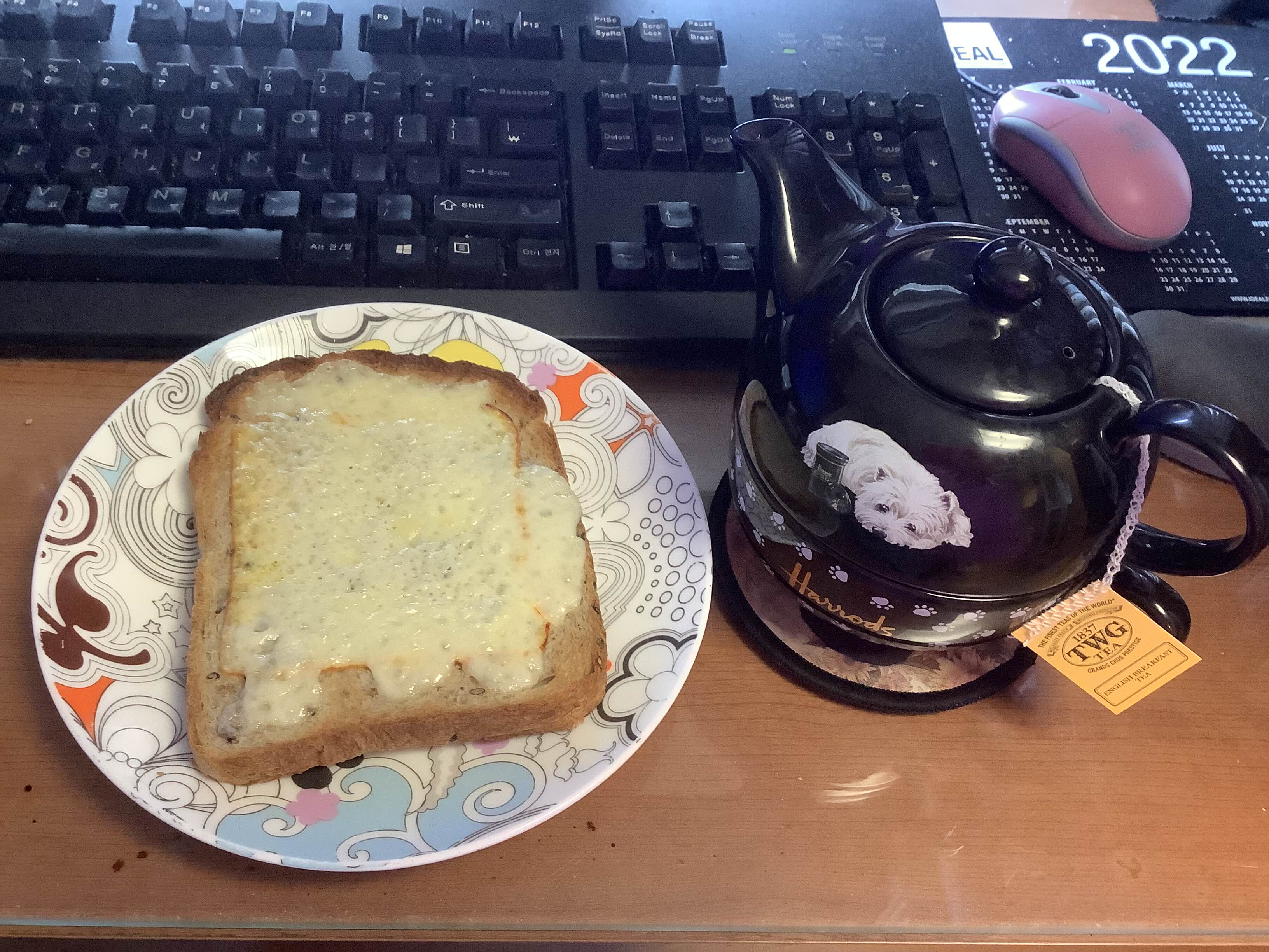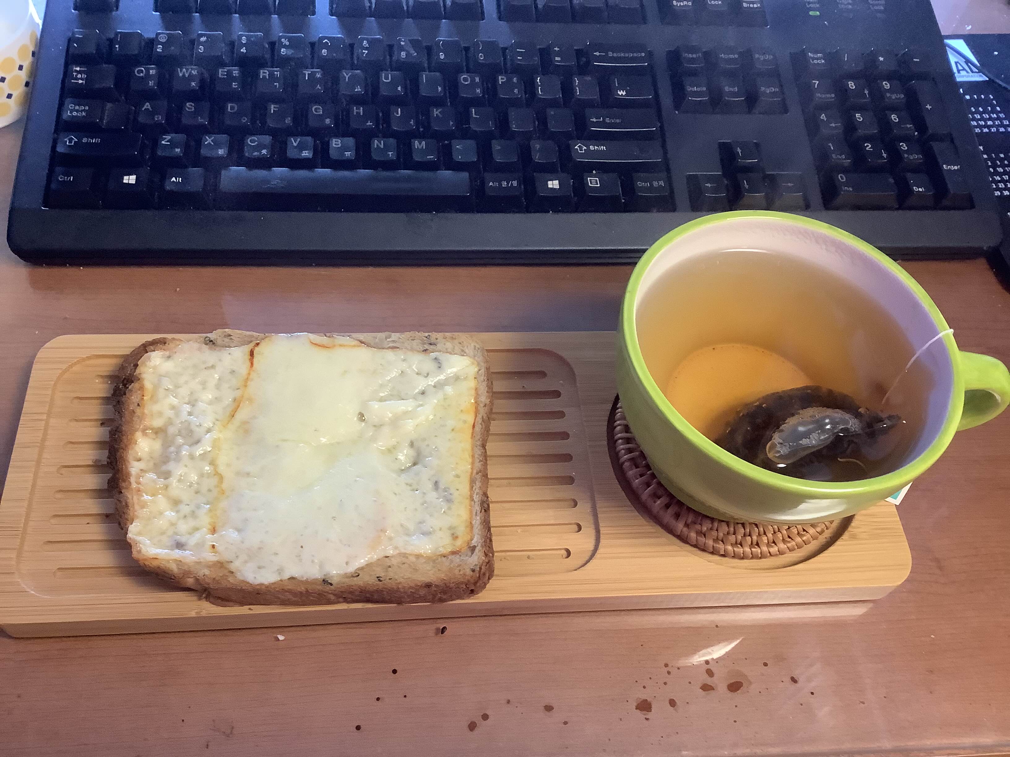 식빵에 치즈 올려서 구운 초간단 치즈 토스트~ 귀찮을 때 최고의 선택. 차는 우롱차였지 싶다.