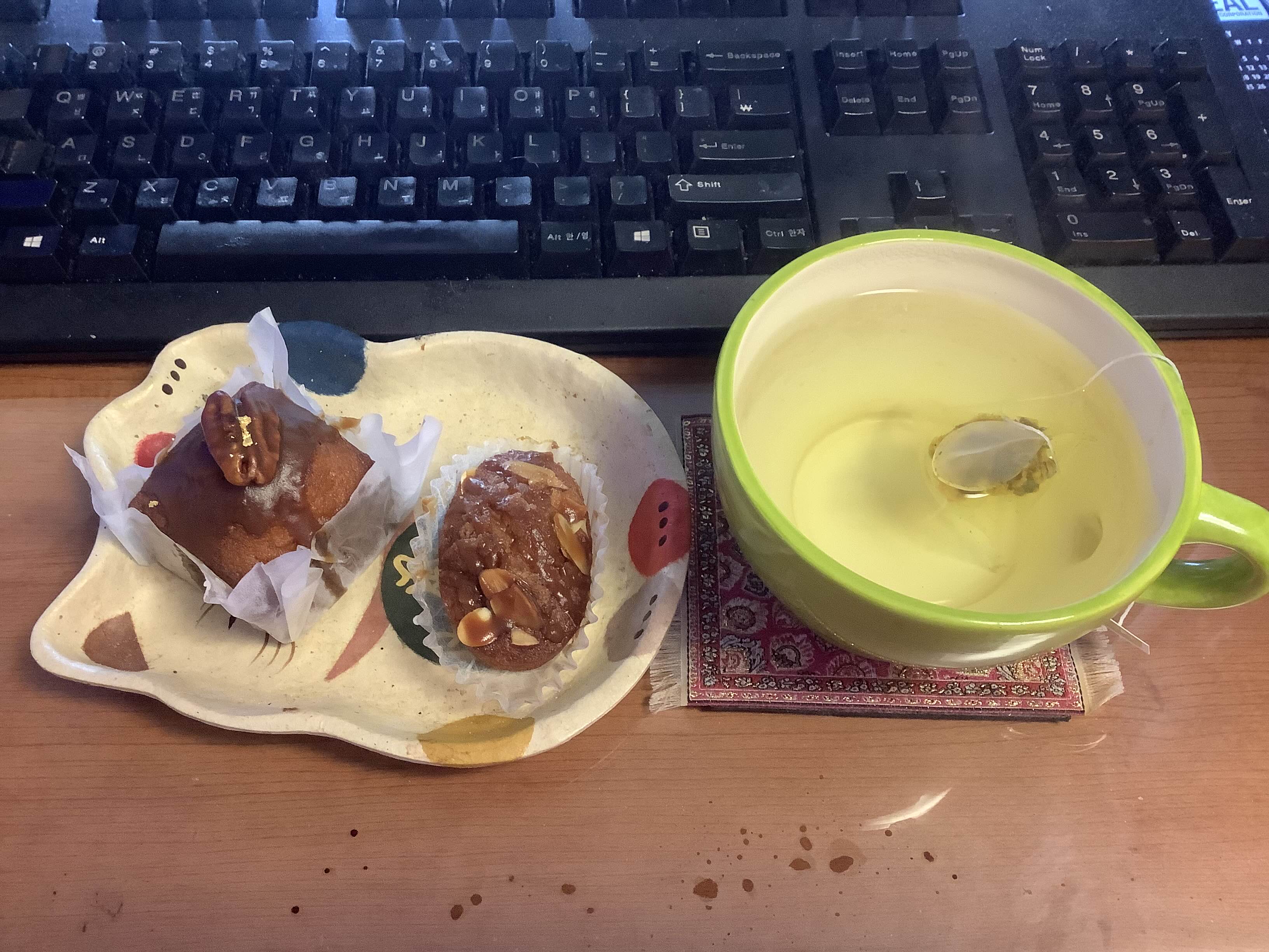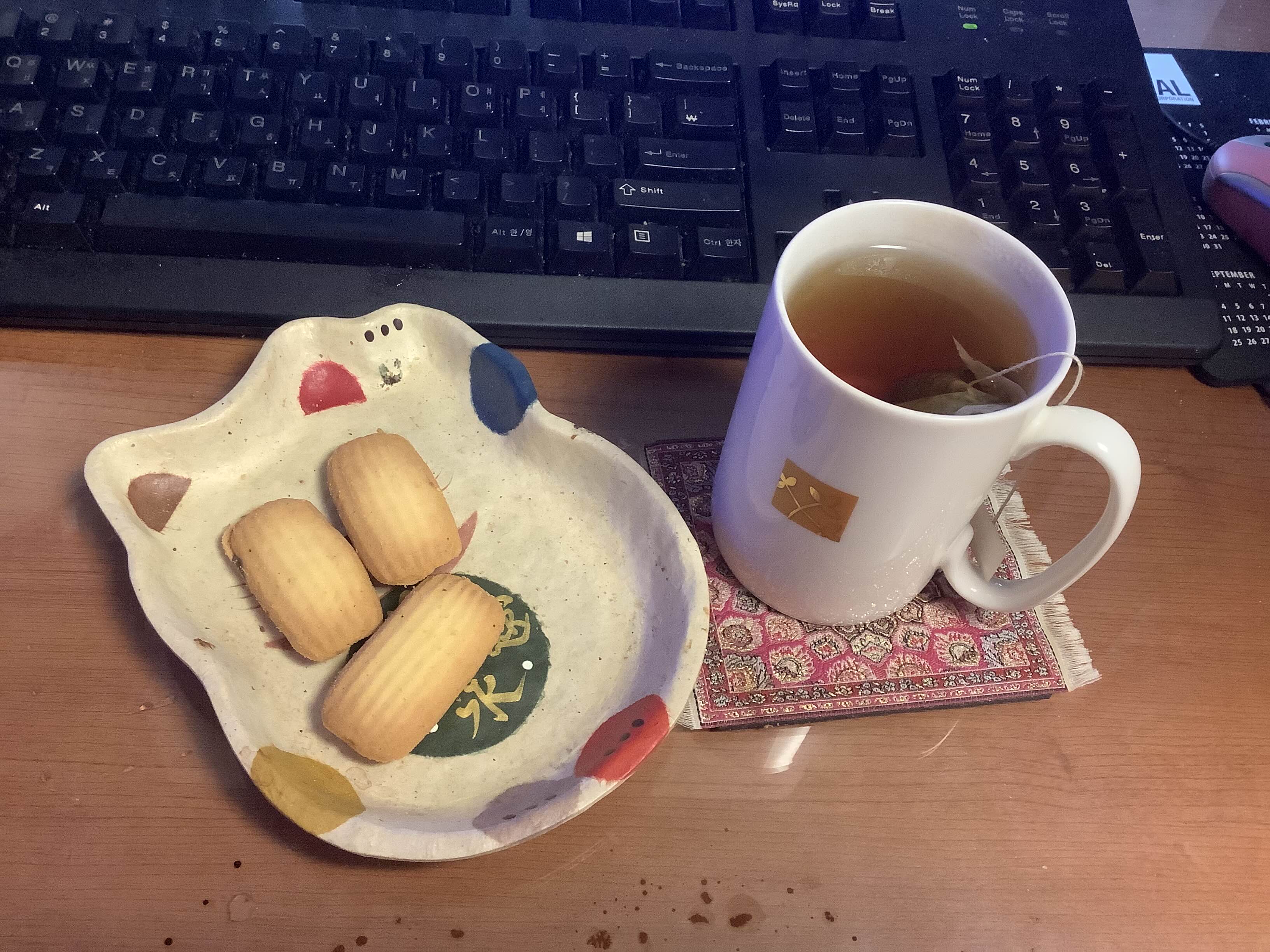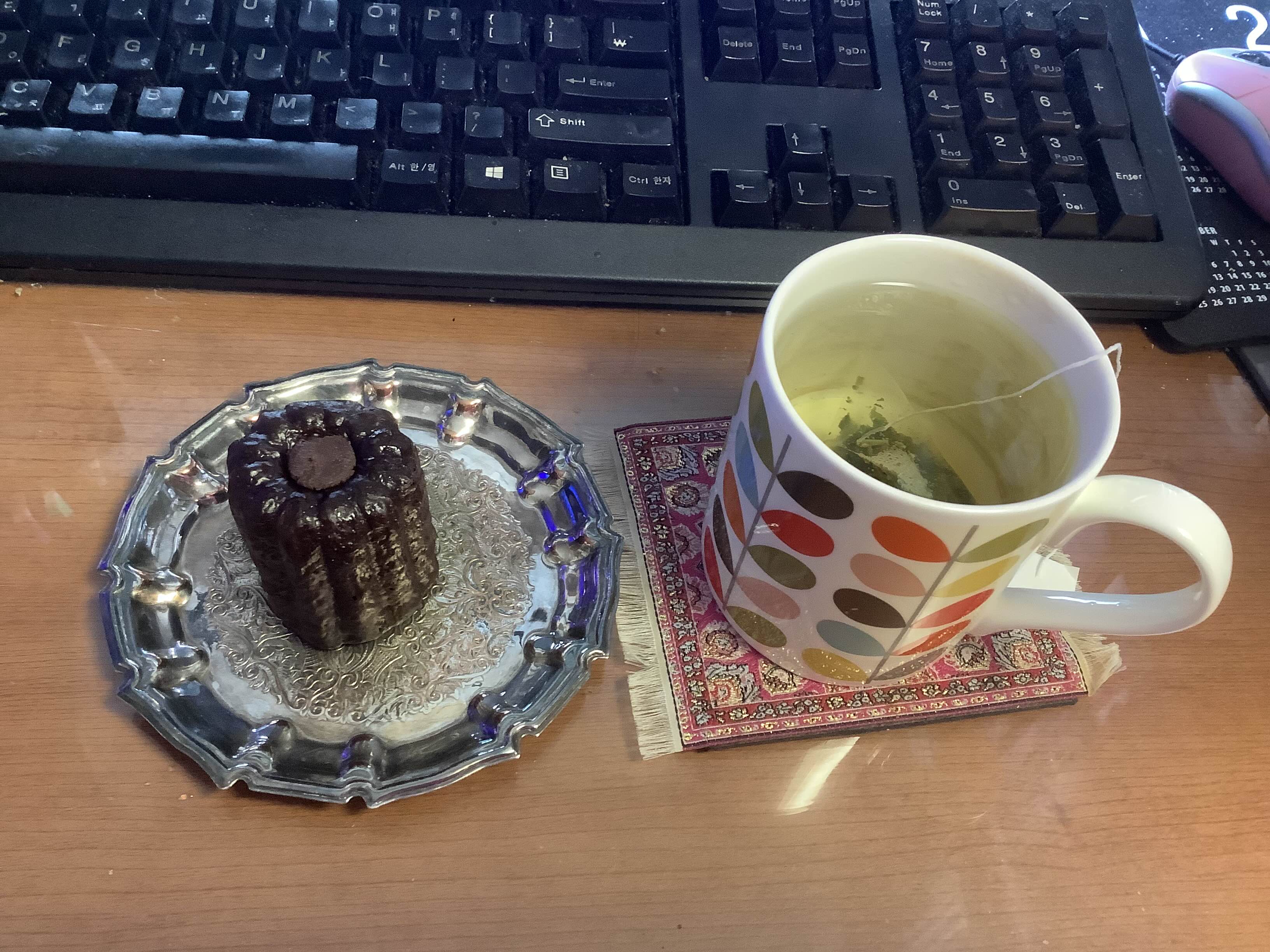 녹차에 동생표 피칸 캐러멜 티케이크와 피낭시에.