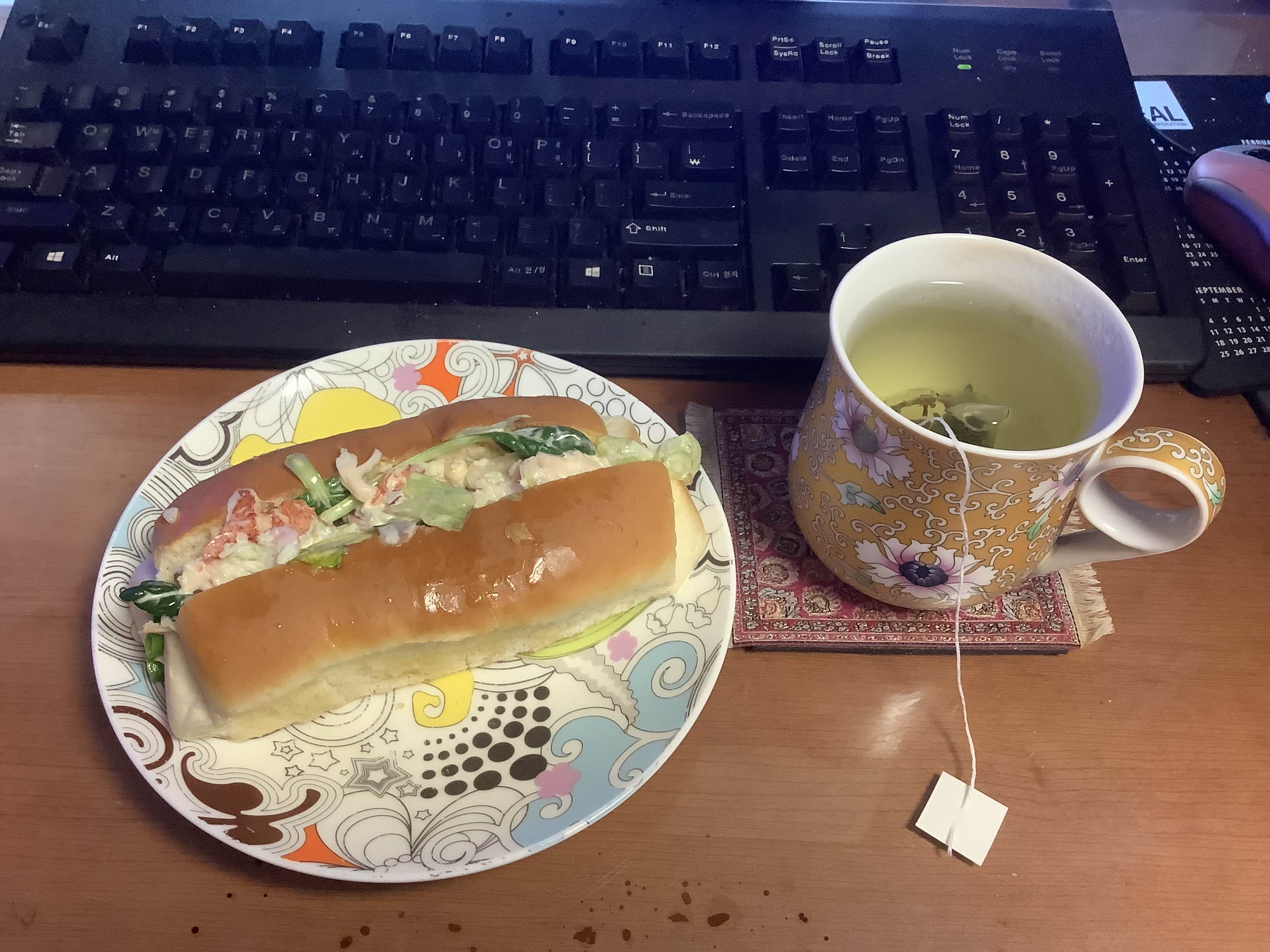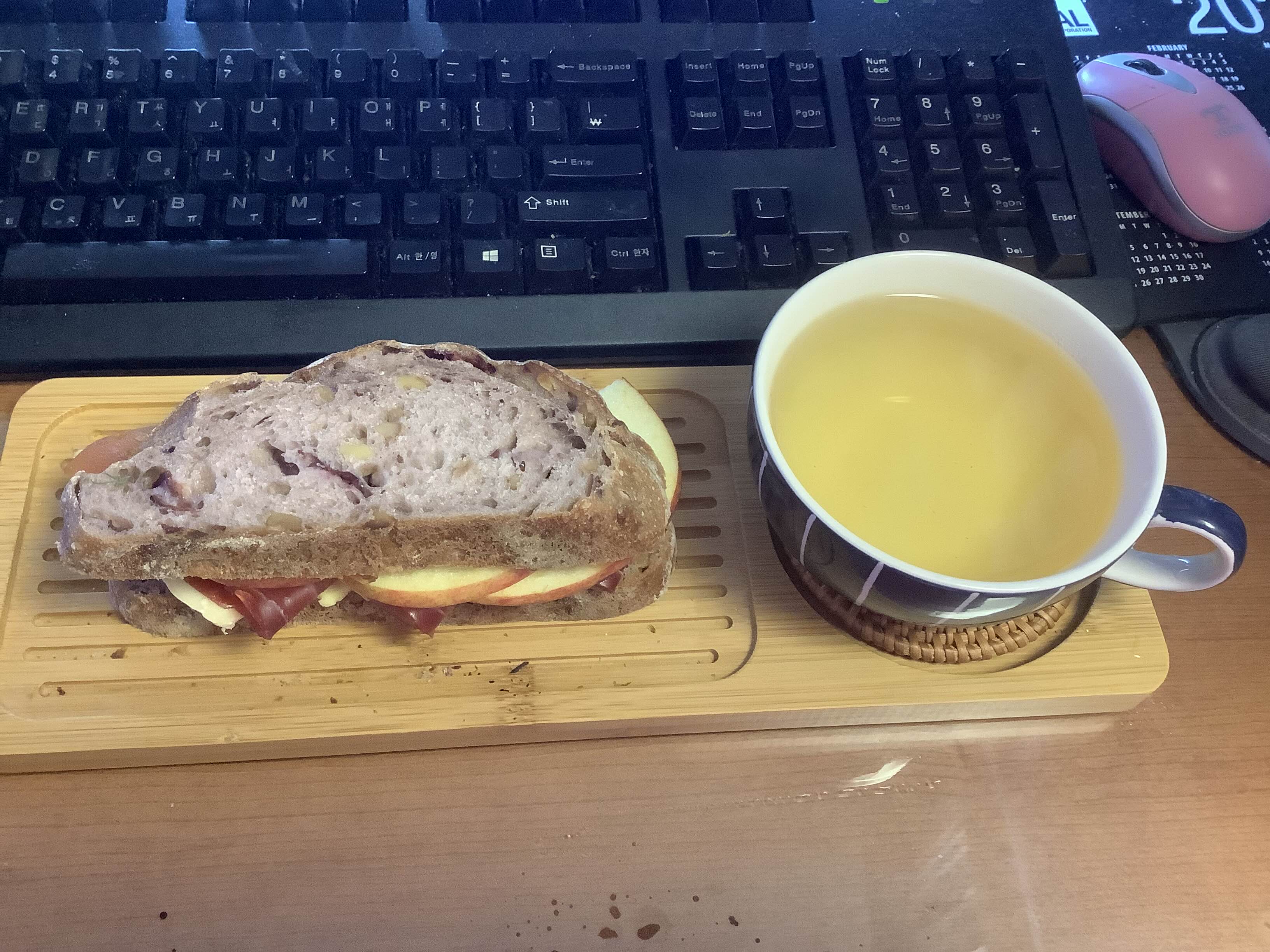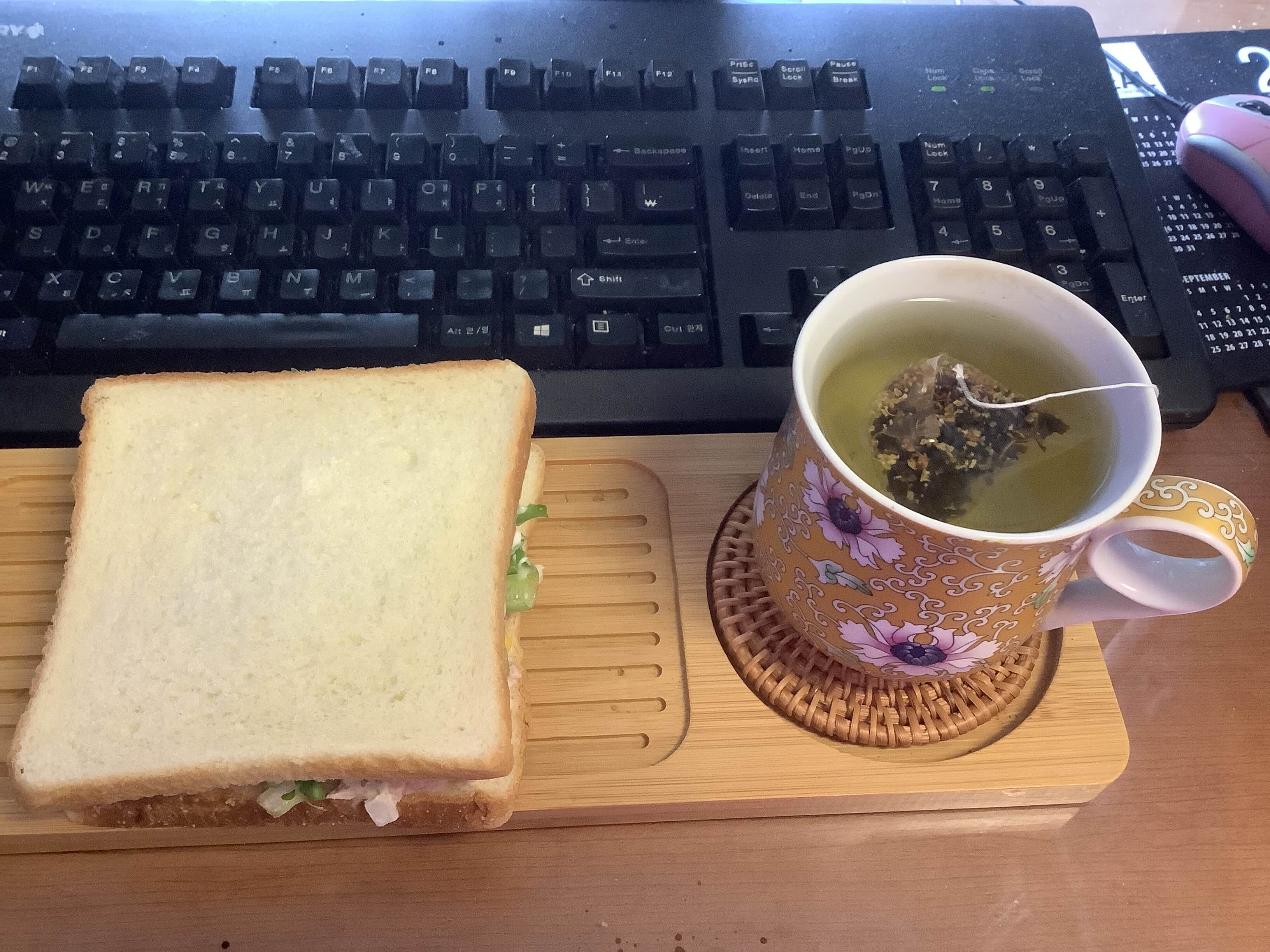 옥수수 병조림 뜯은 걸 빨리 처리하기 위한 참치샐러드 샌드위치와 계화 우롱차.