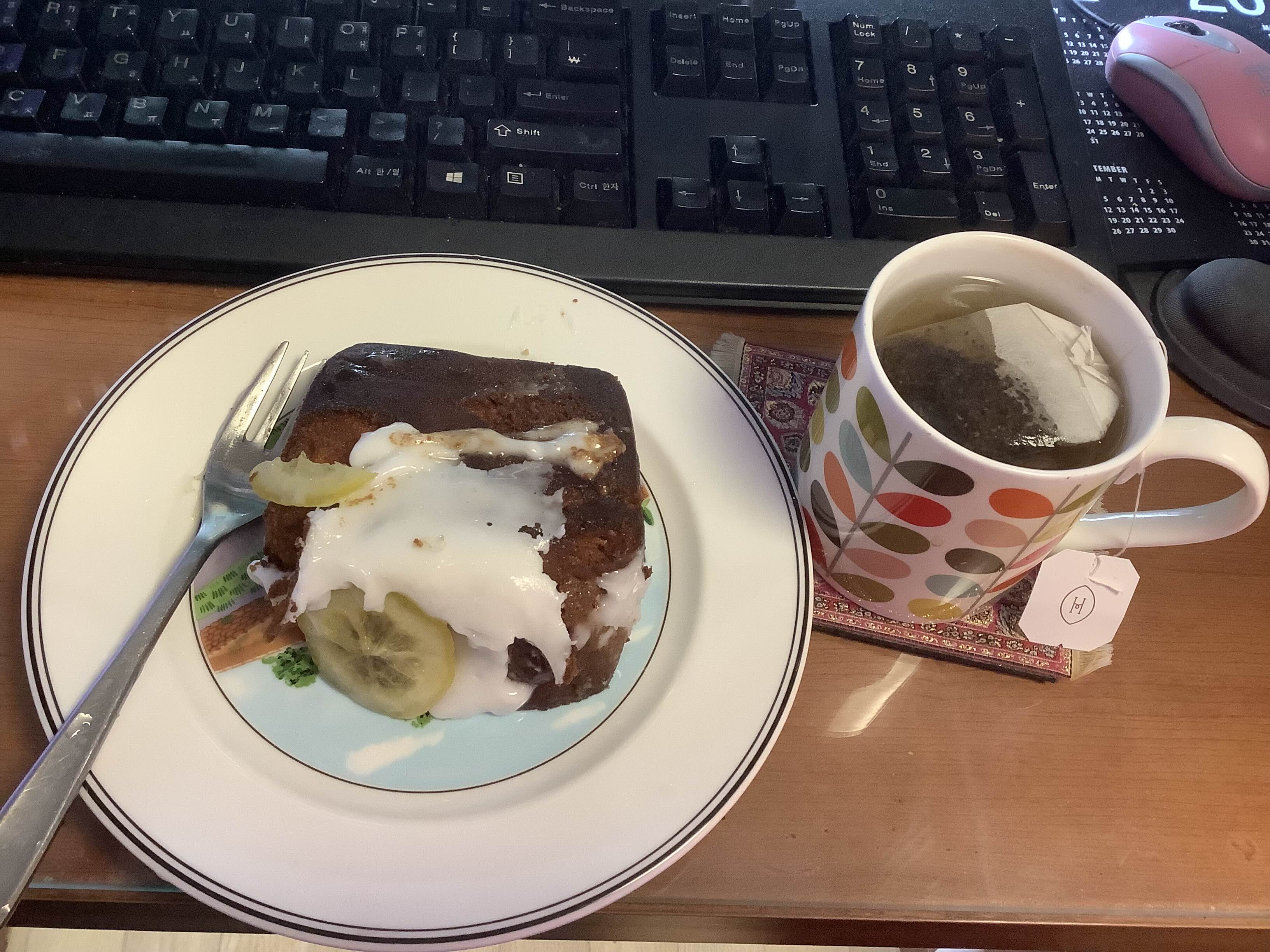같은 날 다른 간식인 밀도의 레몬 파운드와 해로즈 다즐링.