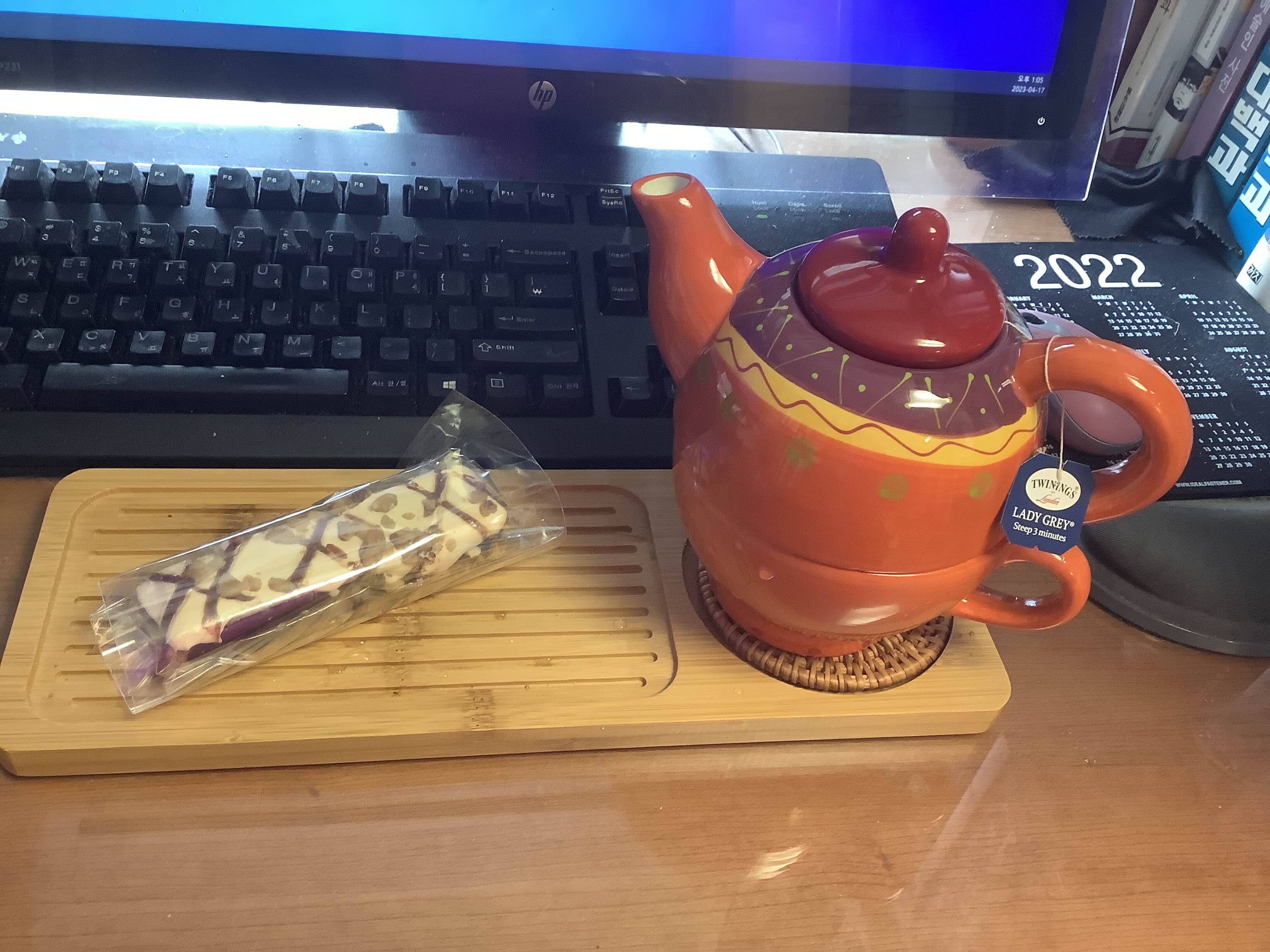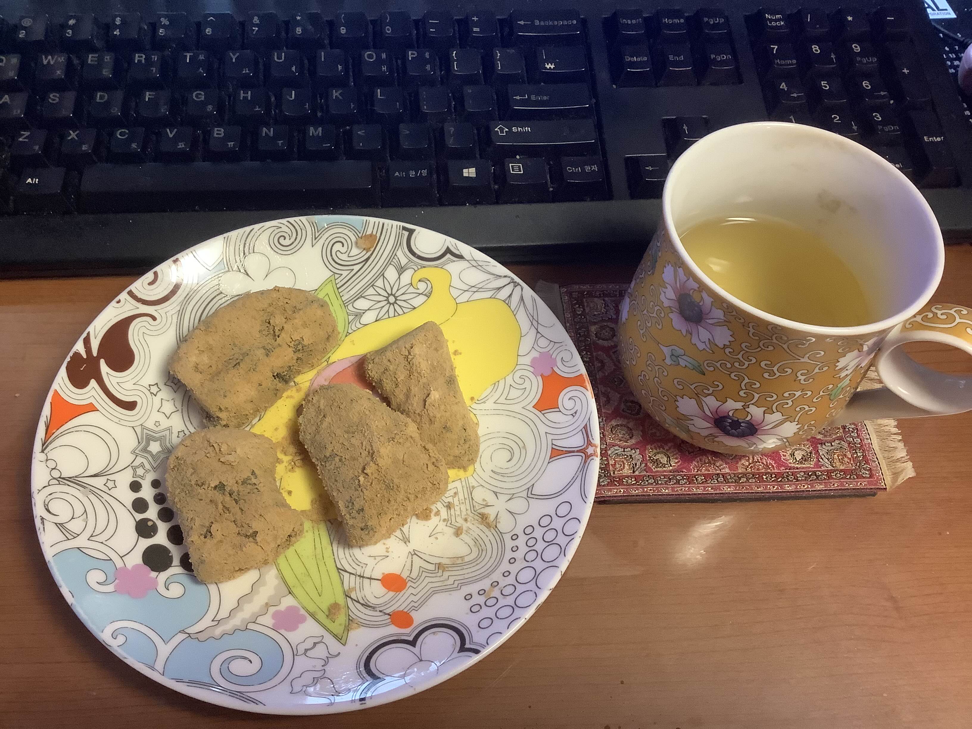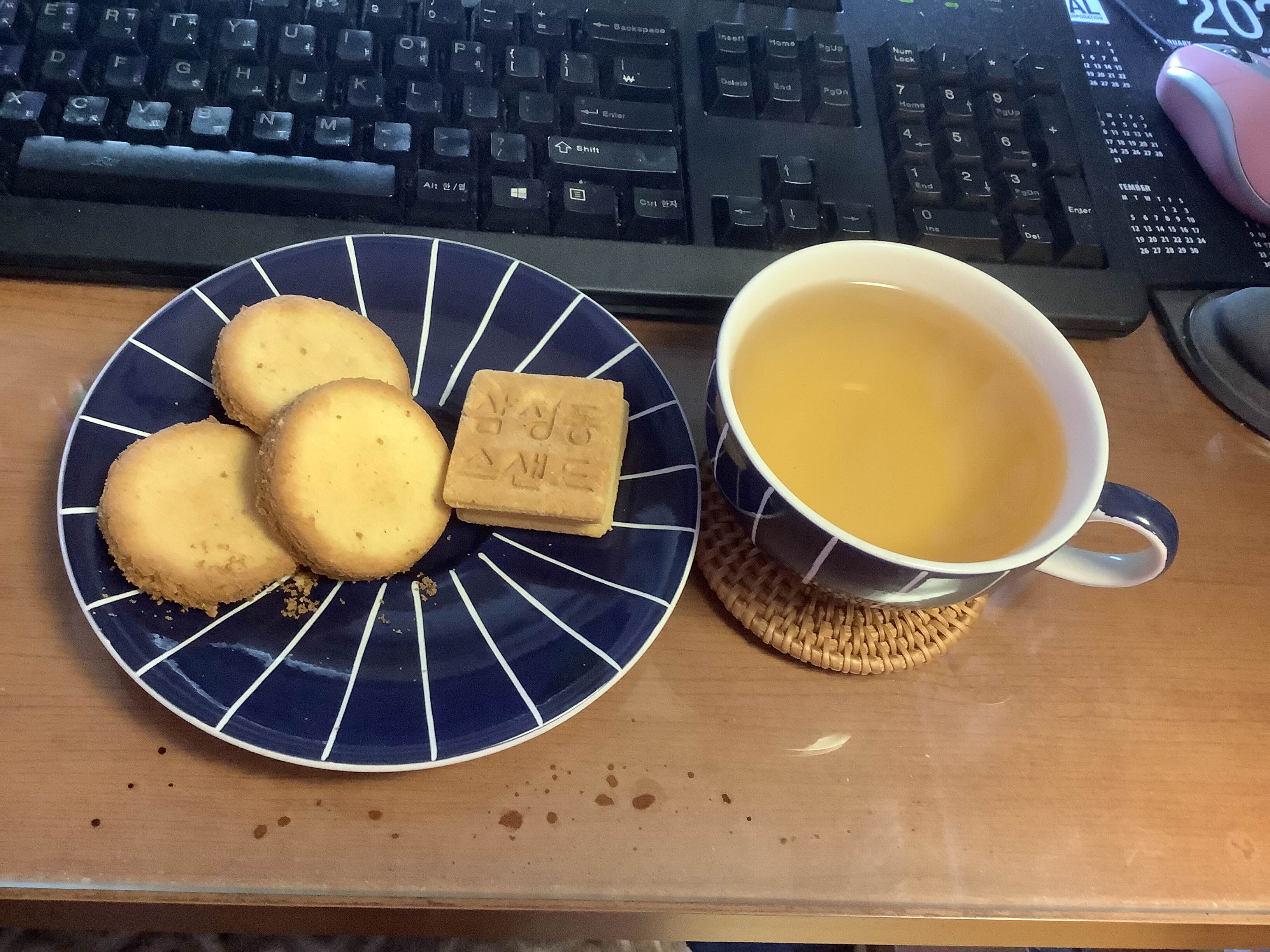 나폴레옹 제과점의 쿠키와 홍차. 정체불명의 홍차는 밀봉되어 있던 거 뜯었는데 냄새는 낙엽 직전에다 쿰쿰하니 보이차에 근접한 맛. 뭐 이거 마셨다고 죽진 않겠지. 😅