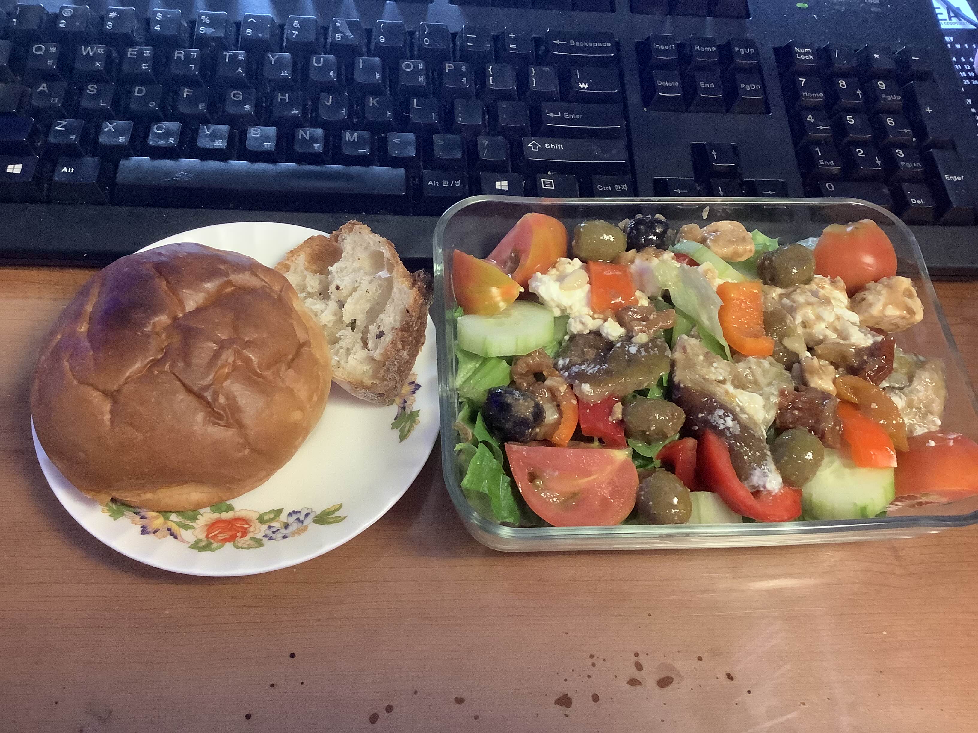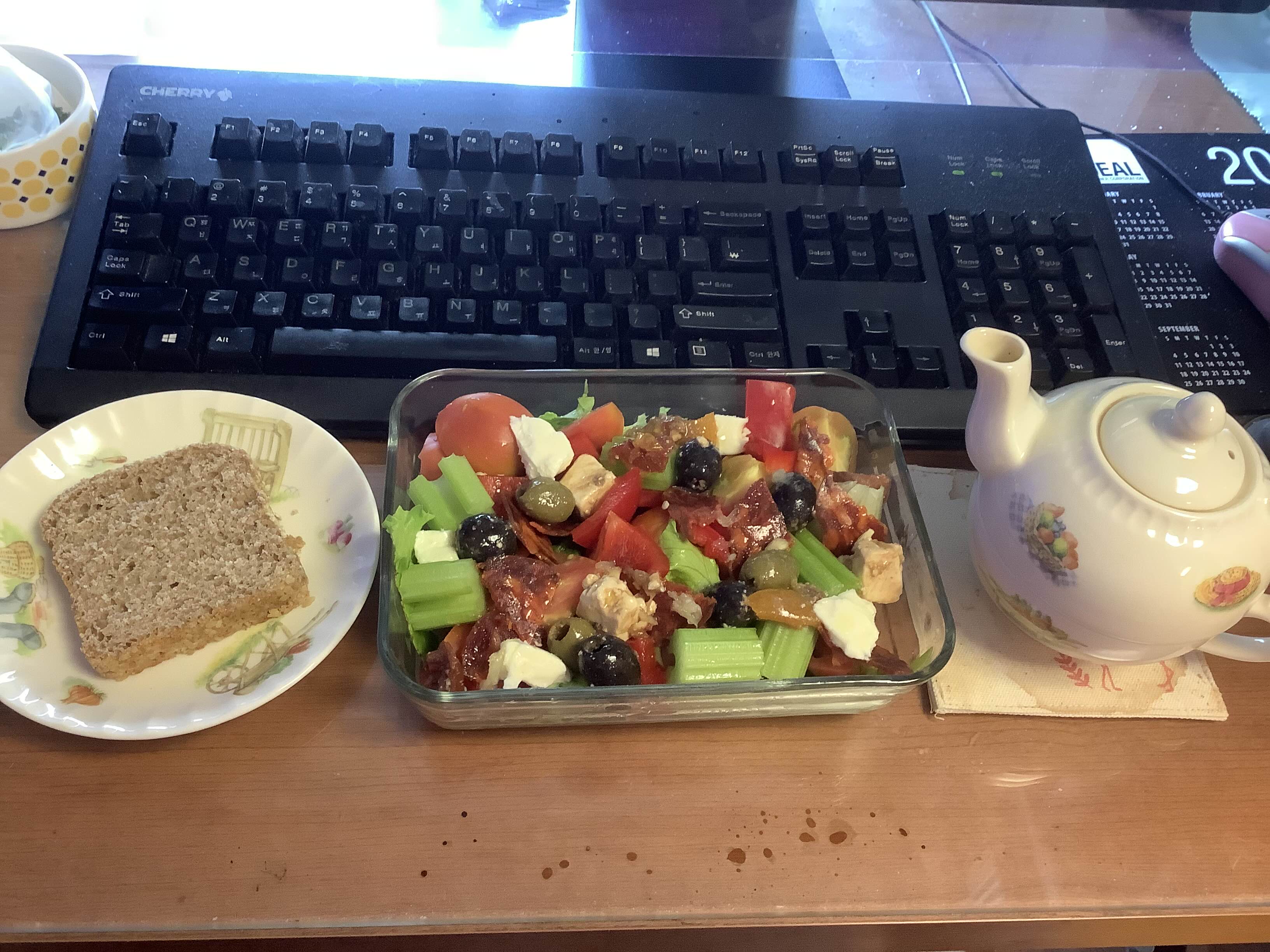 올리브 절임 먹고 싶어서 전날 씻어둔 채소 남은 것에 샐러리랑 토마토 등 추가해서 이날도 샐러드~ 호밀빵이나 잡곡빵 먹고 있으면 어릴 때 읽던 서양 동화에 버터 바르지 않은 빵과 맹물이 왜 벌 받을 때 식사로 등장하는지 알 것 같다. 18세기 때 독일에 포로로 잡힌 프랑스 병사들에게 호밀빵 줬더니 다음날 다 달아나버렸다는 괴테의 글이 떠오르네. 😅