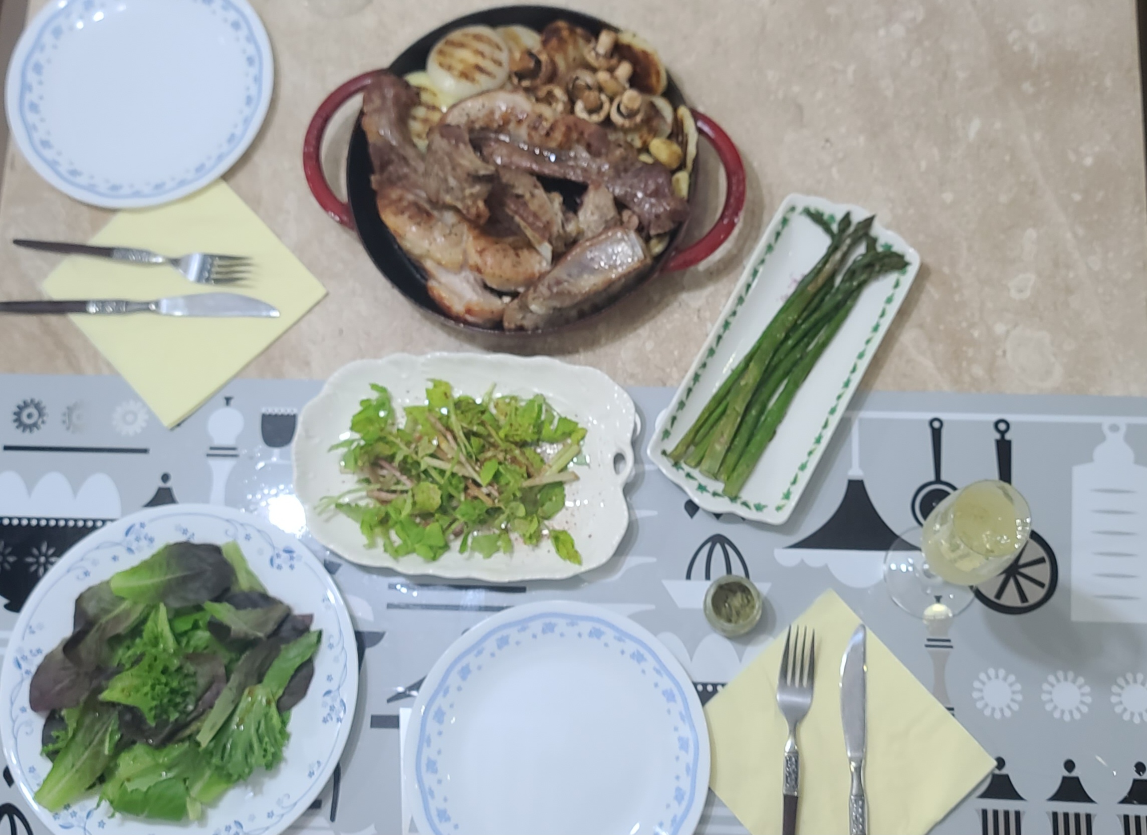 드라이에이징 돼지갈비에 어글리어스 아스파라거스에 스마트팜 무주원 ???의 샐러드 믹스. 이날 고기를 넘 많이 먹어서 이후 고기가 안 땡김.
