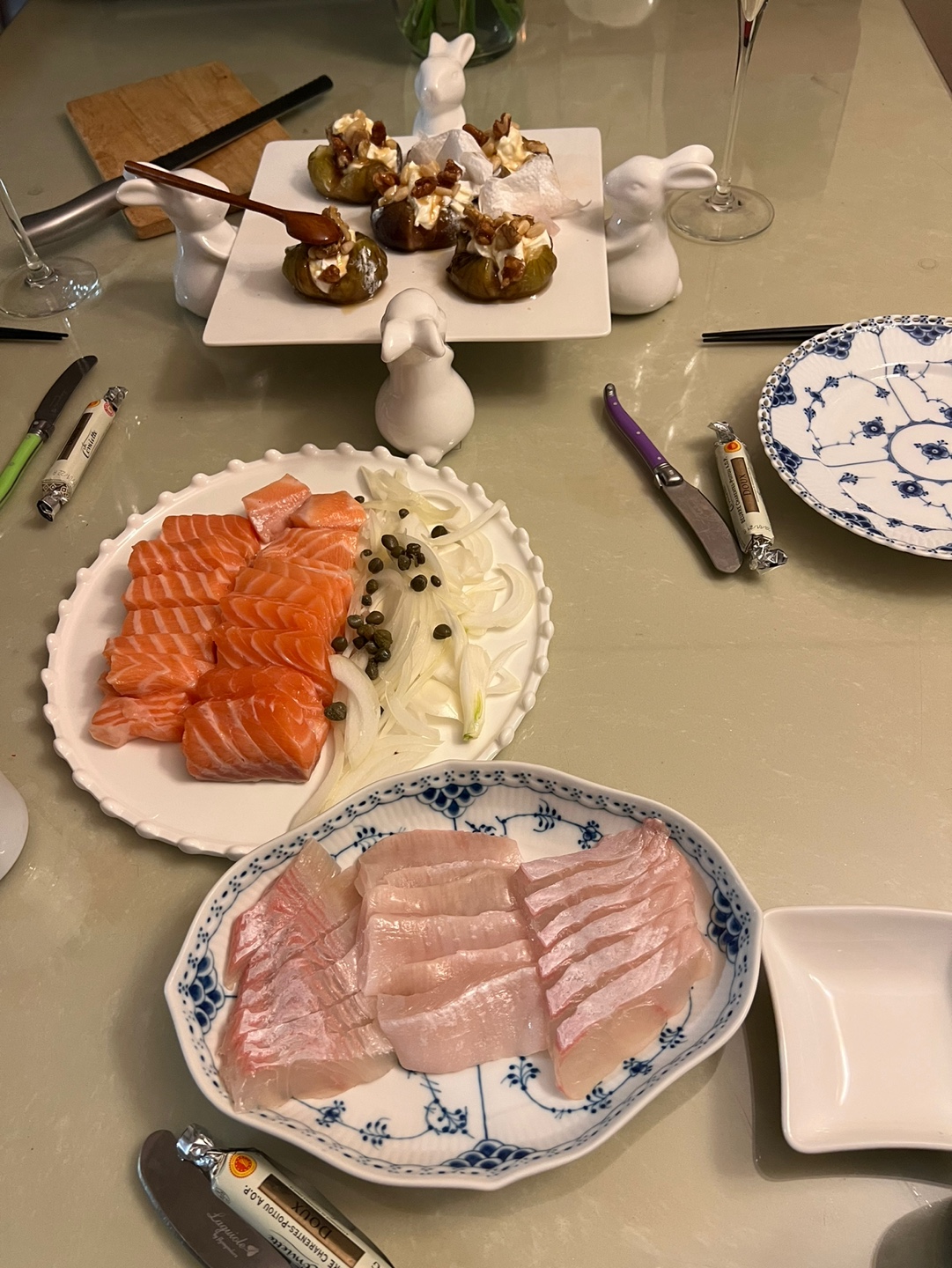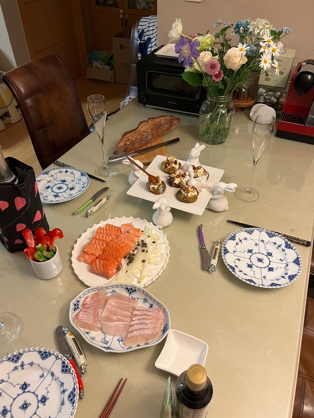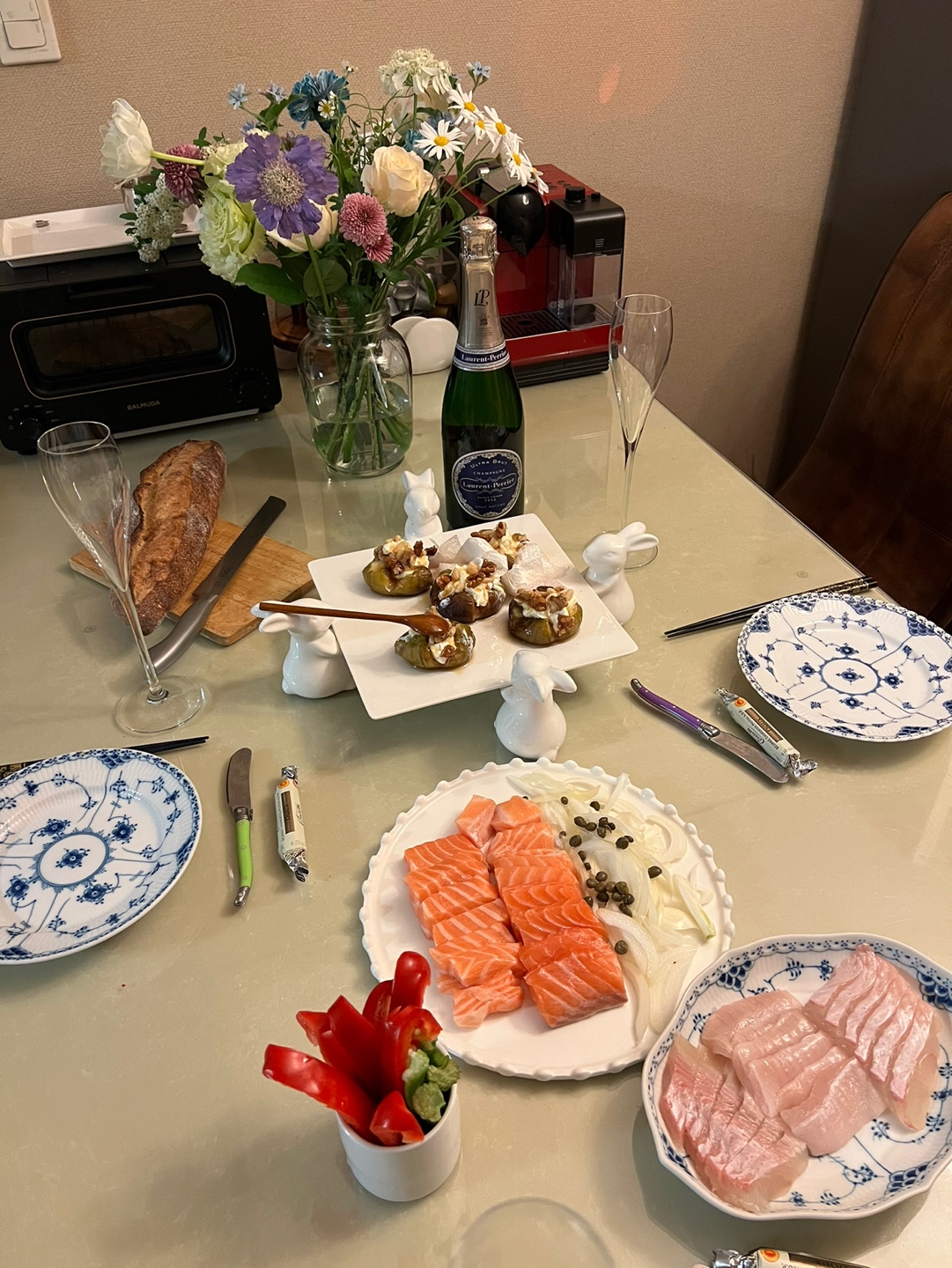 동생이 생일 선물로 받은 로랑 페리에 샴페인을 곁들인 저녁~ 정말 오랜만에 타르틴 바게뜨 구입 성공했다! 연어와 광어 회. 무화과 마스카포네 샐러드. 얼린 무화과는 먹기 직전에 꺼내 치즈를 채워야겠다. 녹아서 흥건하니 보기도 안 좋고 맛도 반감.