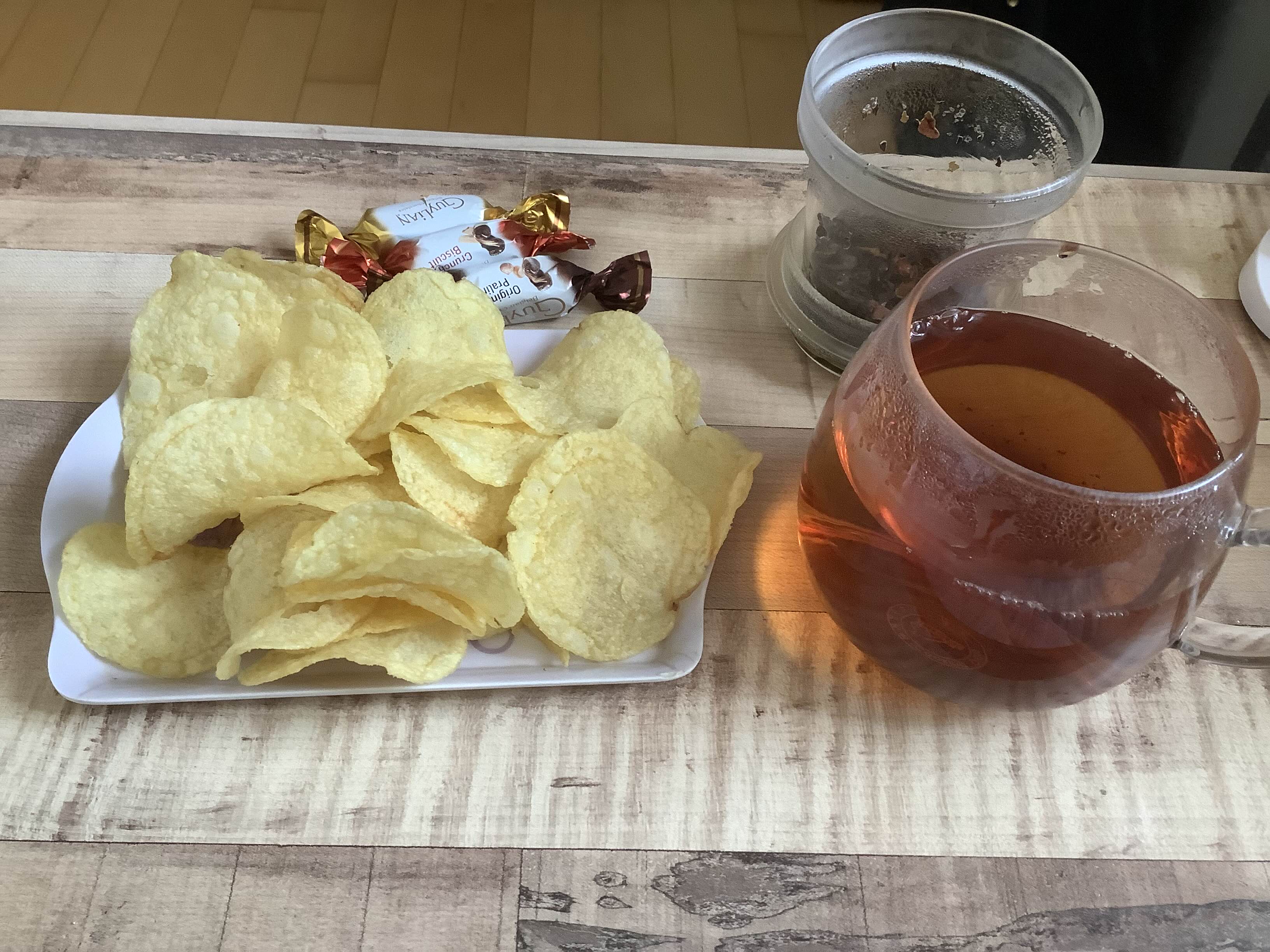 출출한 오후에 보닐라 감자칩과 길리안 초콜릿 & 포숑 마카롱 홍차.