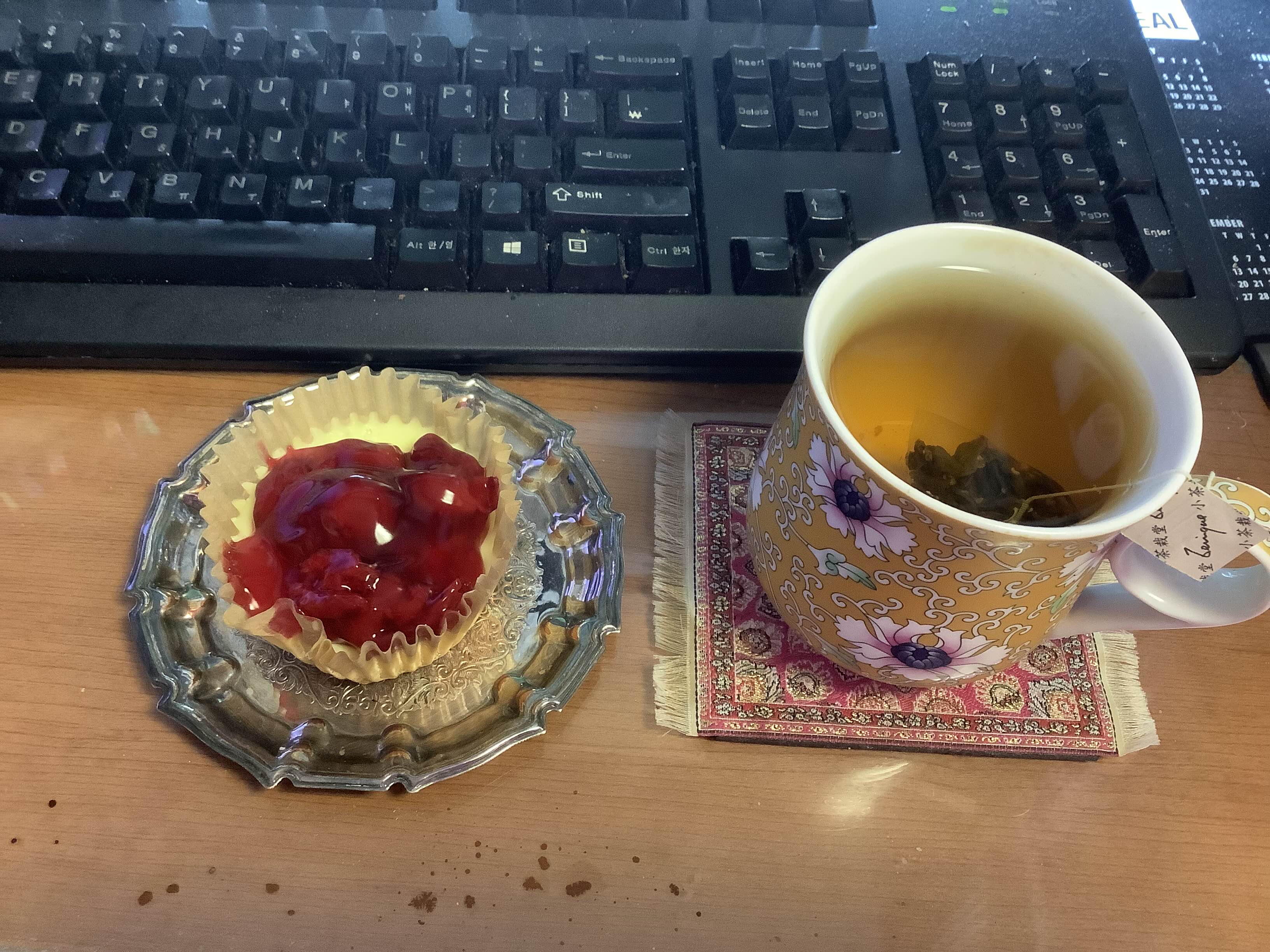 같은 날 오후의 간식으로 체리 필링 올린 치즈 케이크와 우롱차~