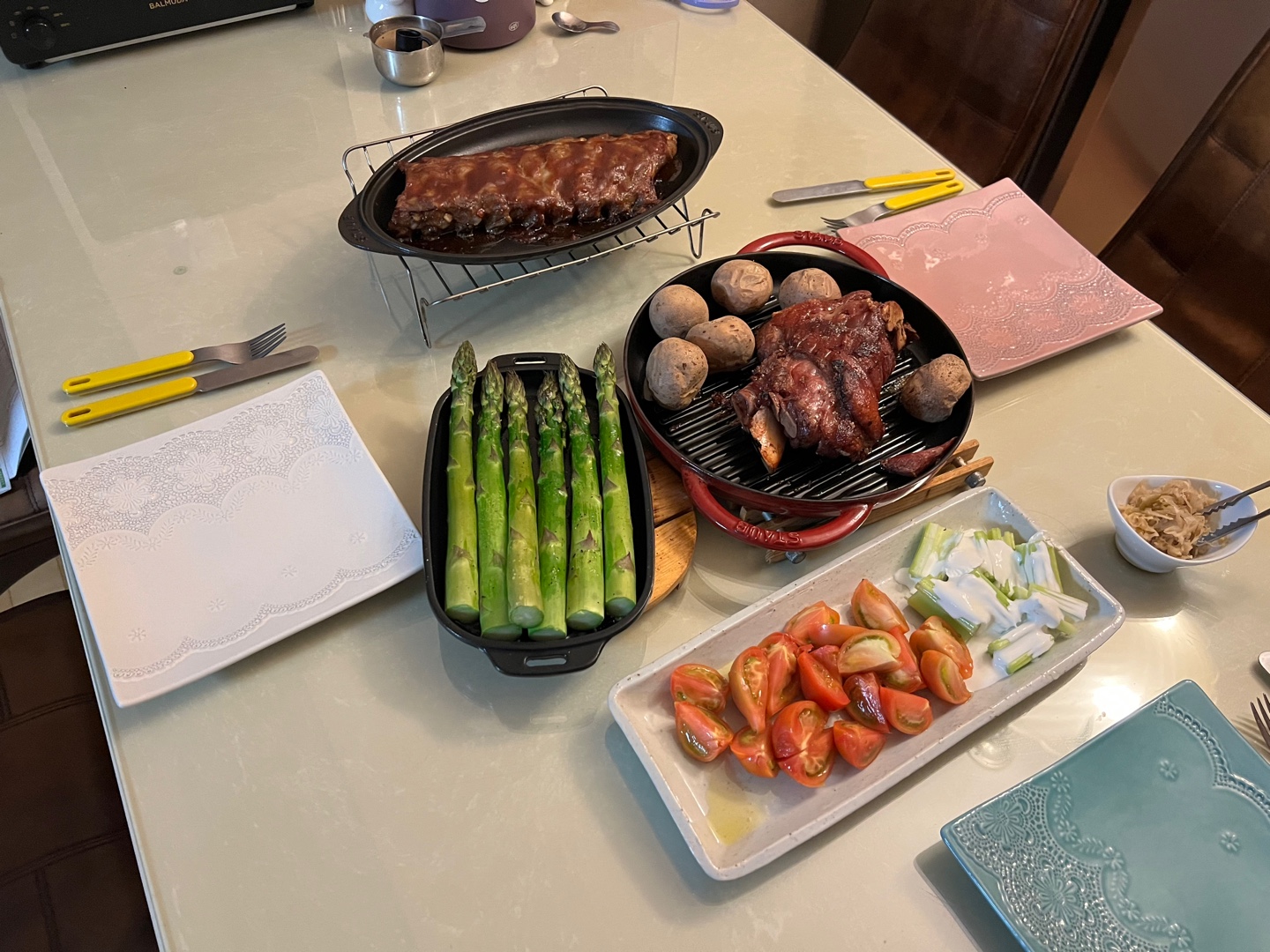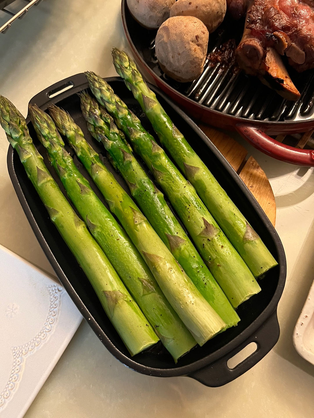 화린 농장인가??? 의 특대 사이즈 아스파라거스와 존 쿡 델리미트의 학센, 등갈비 저녁. 며칠 전 돼지 갈비로 고기에 좀 질린 데다가 백신 접종으로 술도 못 마시는 상태라 고기보다는 감자와 아스파라거스, 토마토에 더 집중한 저녁이었음. 사워크림 바른 뜨거운 감자는 역시 맛있다. 😋