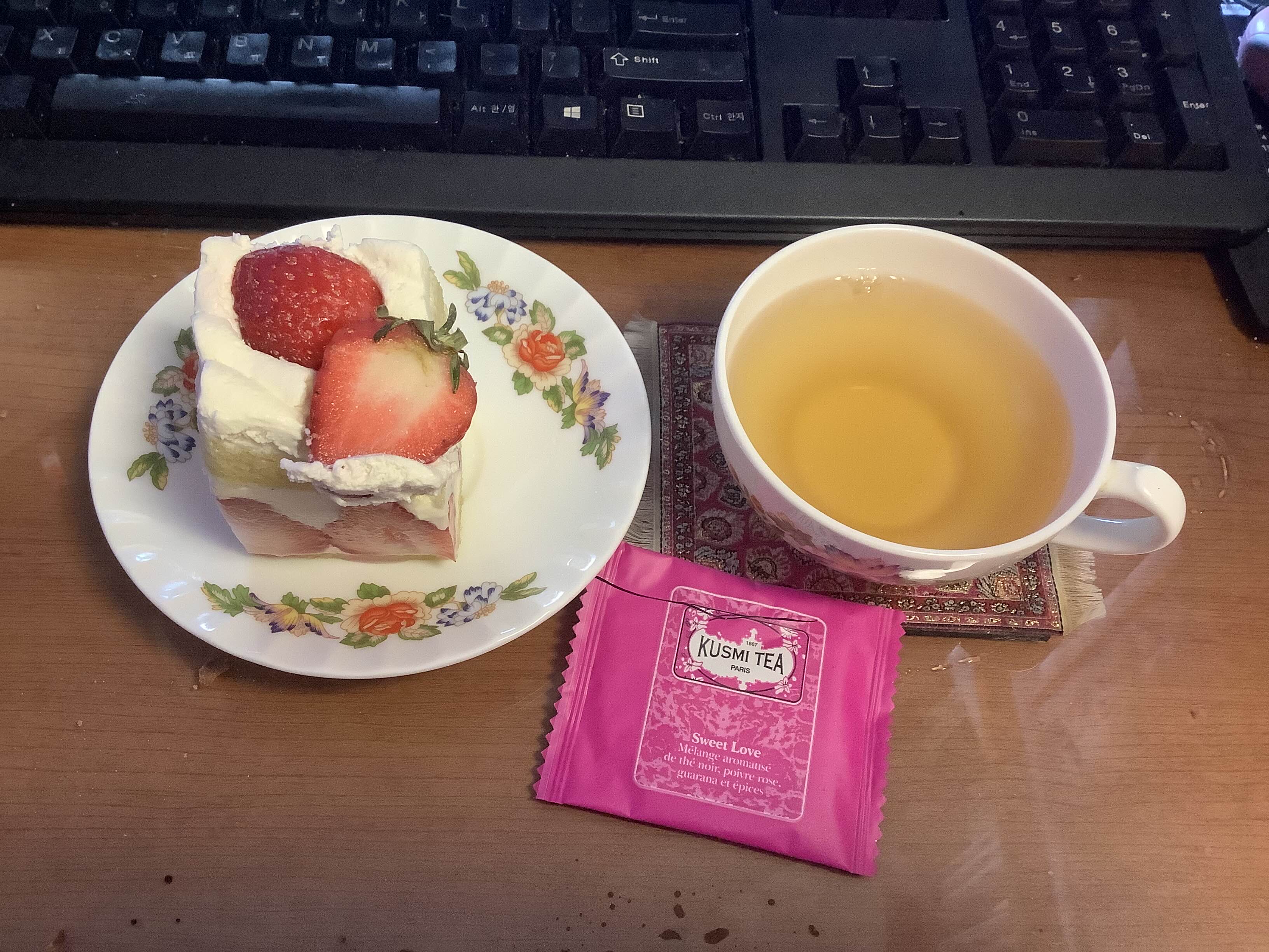 후식은 타르틴의 딸기 생크림 케이크에 쿠스미의 스위트 러브 홍차. 분홍후추, 과라나 외 각종 향신료가 들어갔다는데 순둥순둥하니 맛있었다.