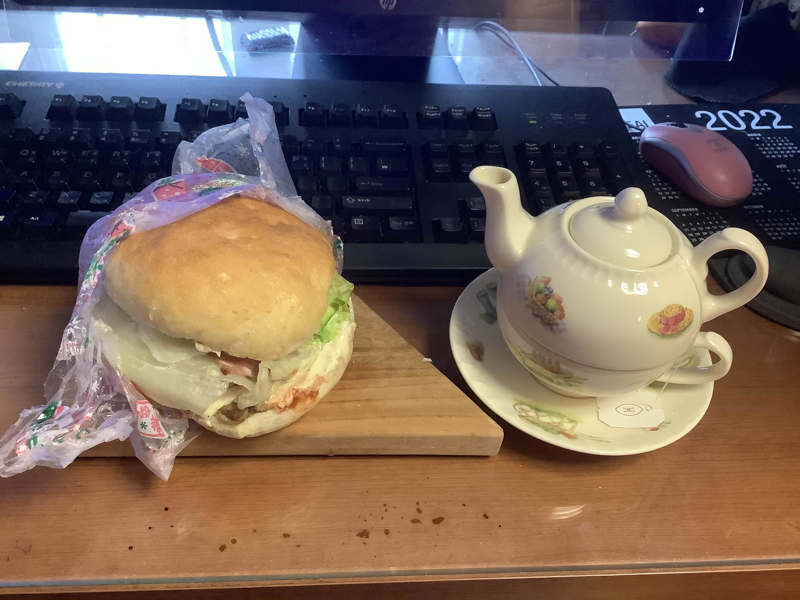 육전과 남은 베이컨 처치용 햄버그. 달걀후라이와 치즈, 토마토가 들어가서 든든하긴 한데 좀 느끼했음~ 육전을 샌드위치로 할 땐 양배추를 꼭 넣어야겠다고 결심. 차는 해로즈 아쌈.