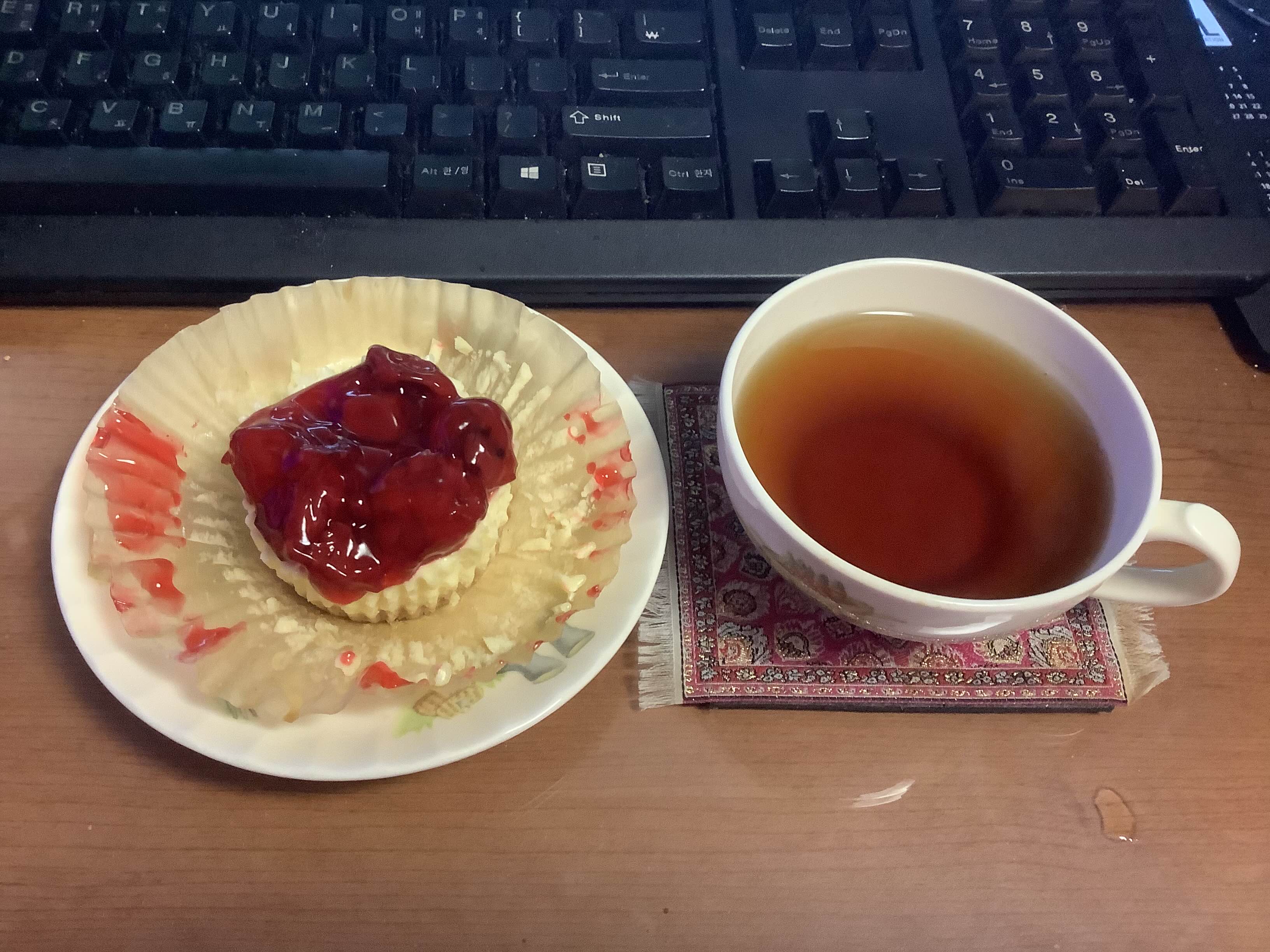 같은 날 오후의 간식으로 체리 필링 올린 치즈 케이크와 우롱차~