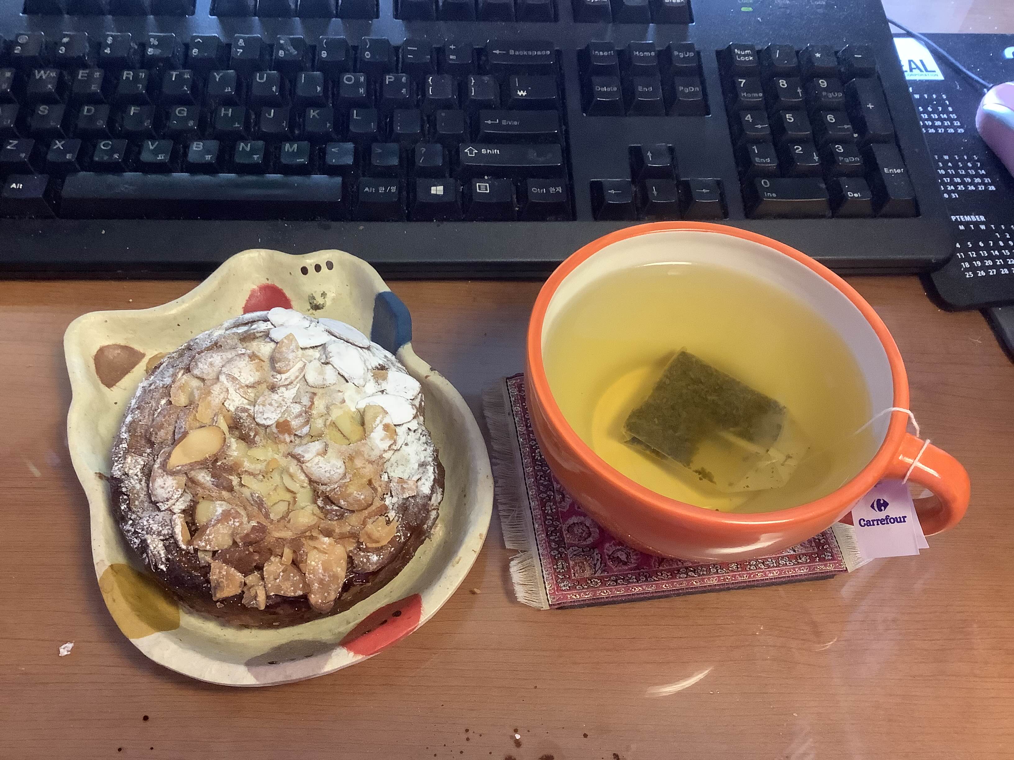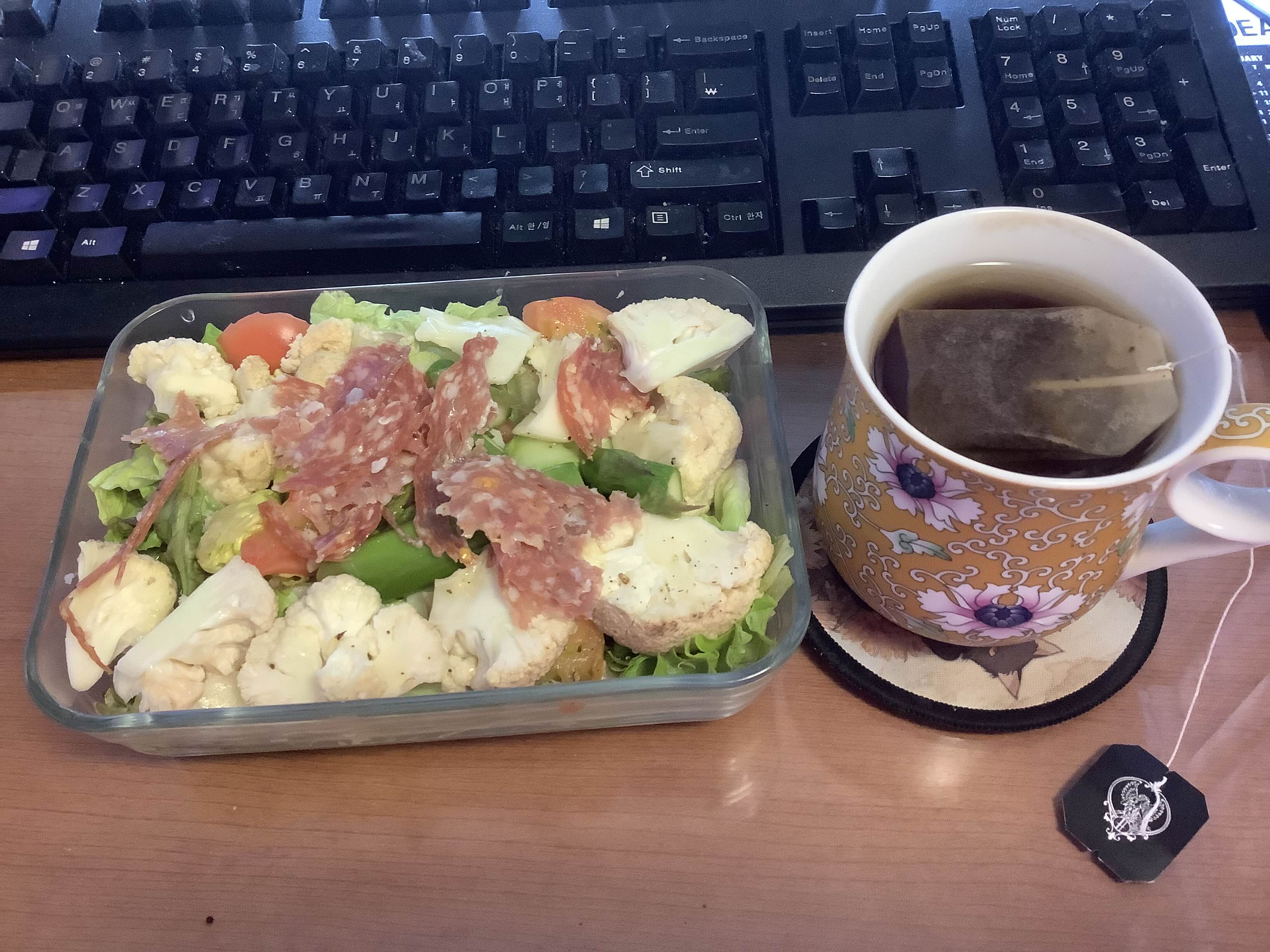 주말에 먹은 살라마와 아스파라거스, 컬리 플라워 처리용 샐러드~ 맛있었음~ 차는 뭐지? 티백 꽁다리를 좀 검색해 봐야겠다.