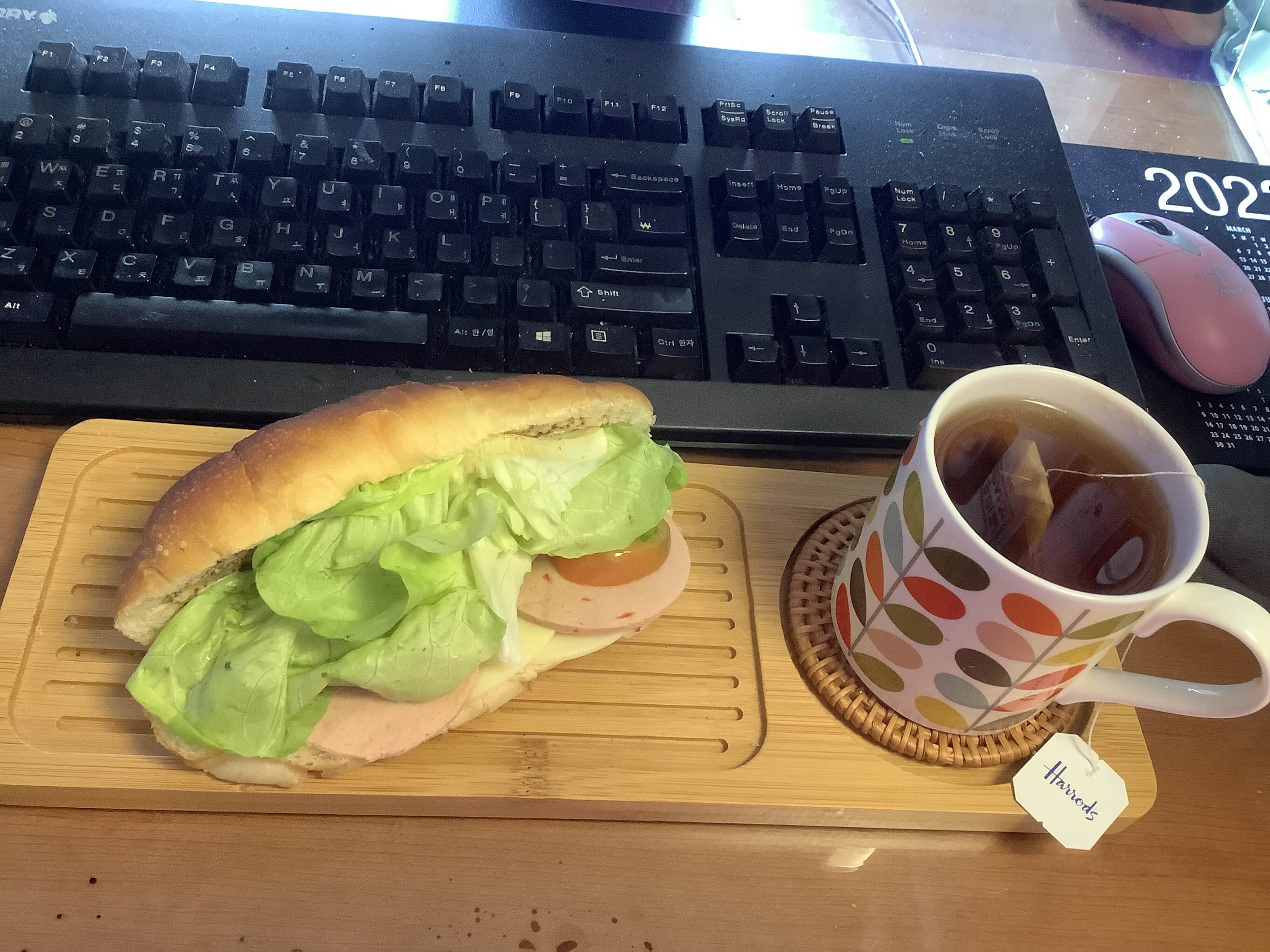비싼 분홍 소세지를 넣은 샌드위치인데... 어릴 때도 난 분홍소세지 좋아하지 않았어서 그냥 경험한 걸로 족함. 사진을 보니 차는 해로즈 잉블이나 아삼인듯.