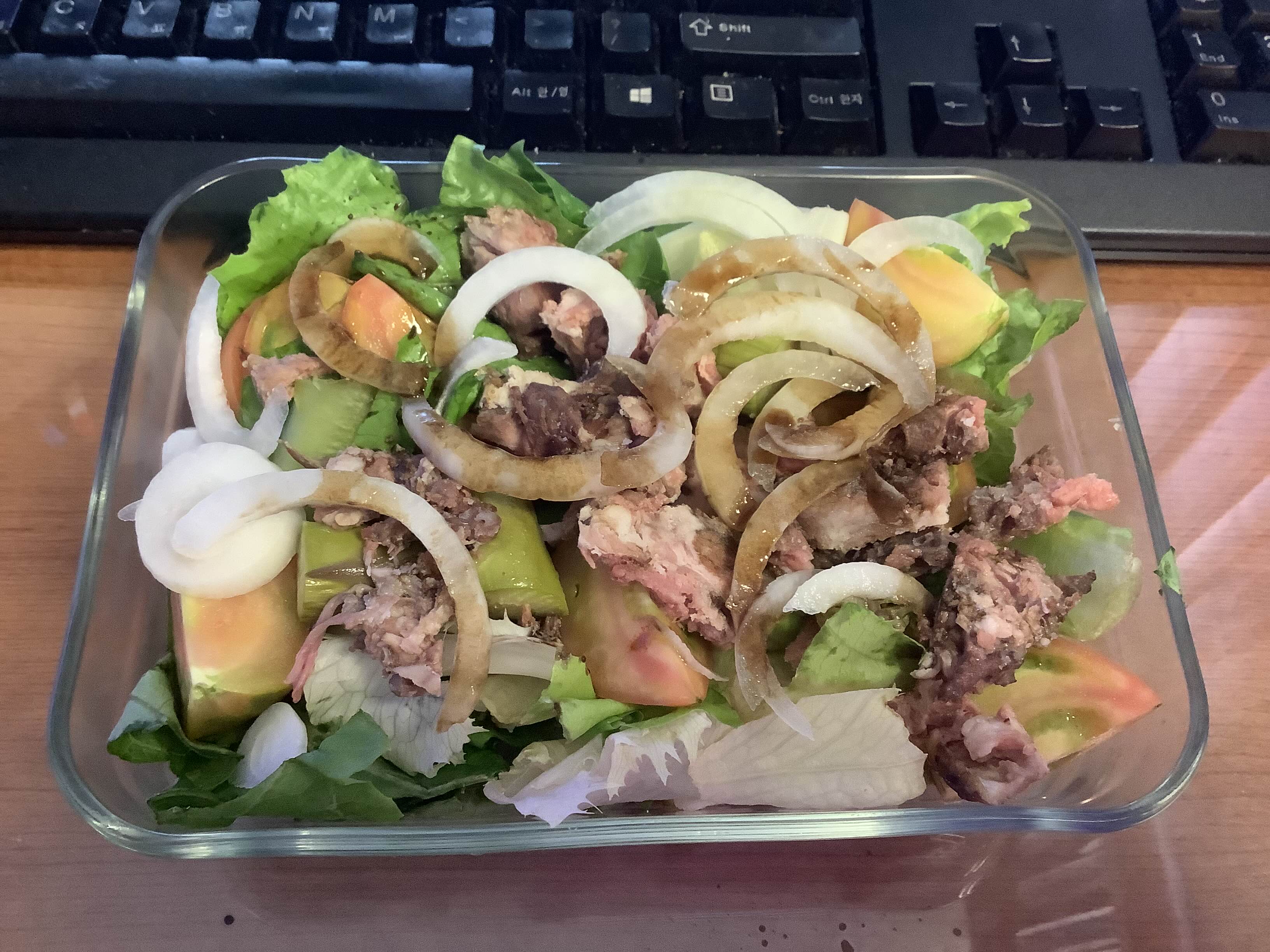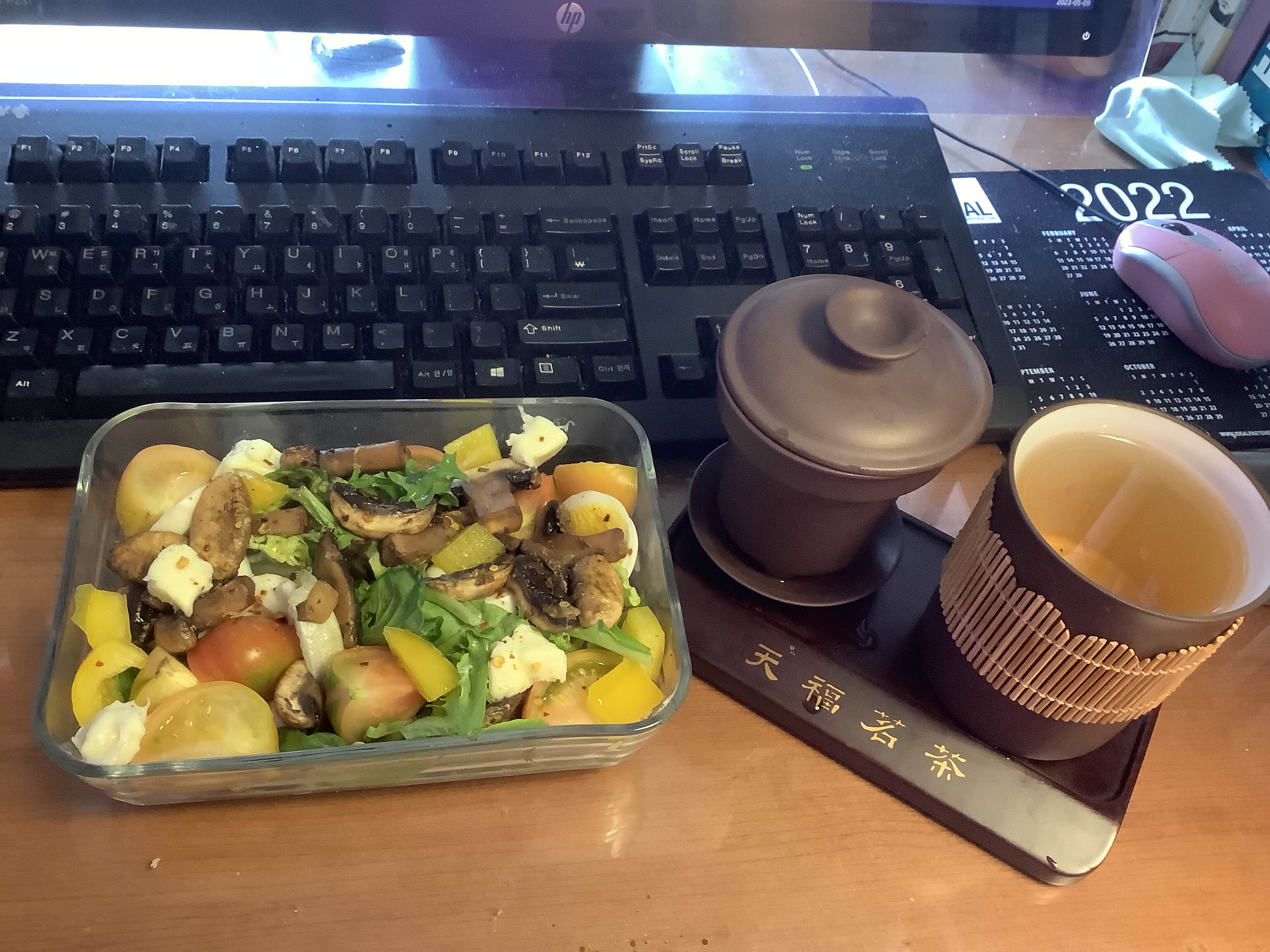 한참 샐러드 열심히 먹던 주간이었던듯. 기본 풀에 위에 얹는 건 그때그때 냉장고에 있는 걸로, 곁들인 건 언제 우리 집에 들어온지도 모르는 우롱차~ 다행히 아직 낙엽이 되진 않았다. ^^;