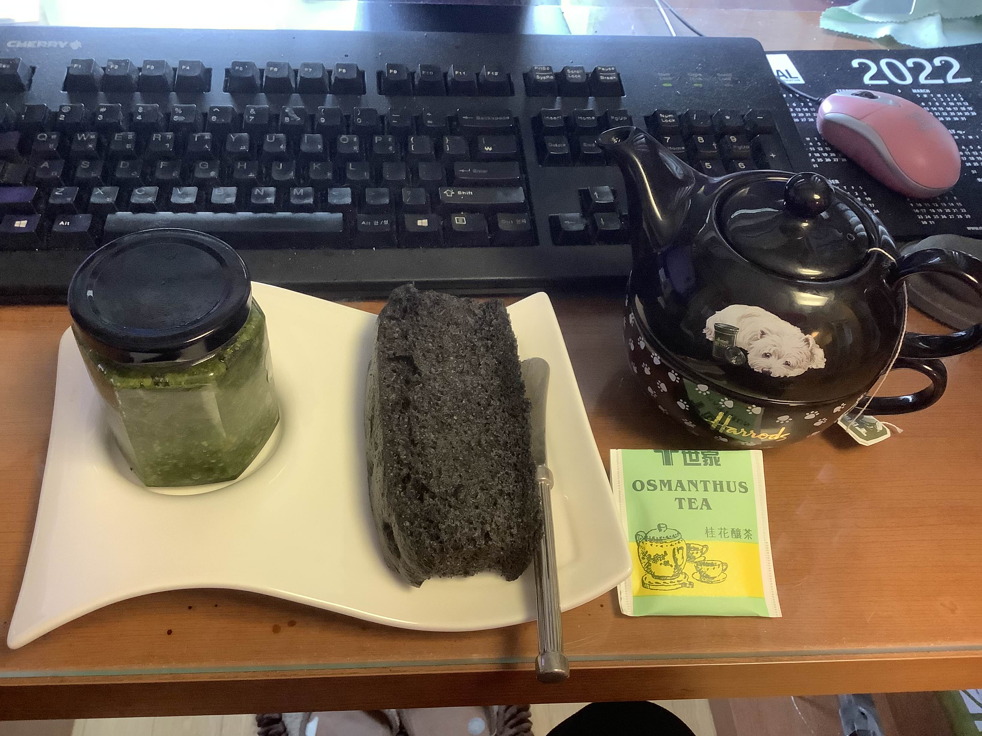 티본 스테이크 남은 것을 올린 샐러드. 역시 세일 때 집어온 오징어 먹물 포카치아에 바질 페스토 두툼하게 발라서 냠냠~ 차는 ㅌ님께 얻어온 계화정차. 계화향이 은은하니 예상대로 샐러드 + 빵 식사와 잘 어울렸다.