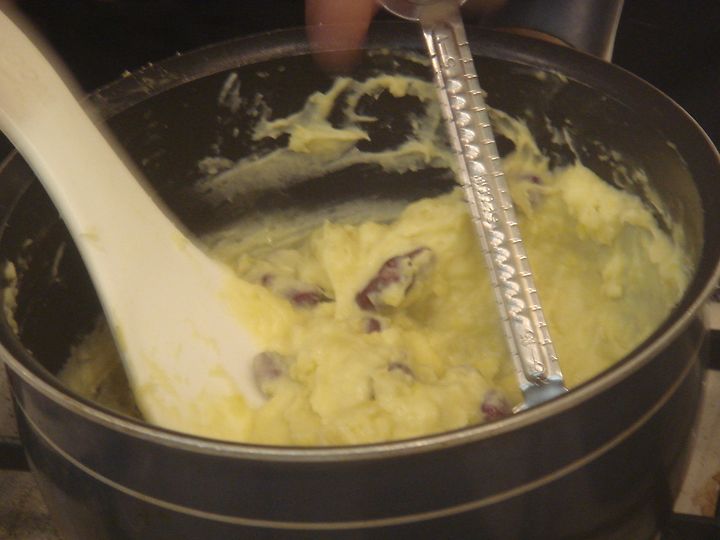 6. 푹 삶아서 냄비에서 으깬 다음 콩과 생크림을 조금 넣고 버무려준다.