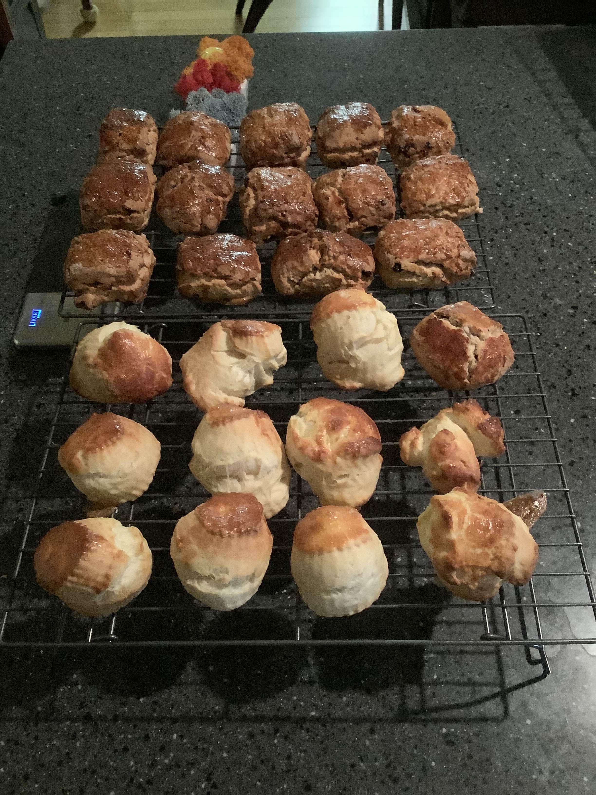 앞에 퐁신퐁신 동그란 애들은 스콘 주제에 2시간은 걸리는 런던식=리츠식 스콘. 그래도 써머믹스가 반죽을 해줘서 편하게 했고 제대로 했다. 반죽을 제대로 해주니 너무 잘 부풀어서 오히려 좀 실패한 것들이 있음. 담에는 확 부풀 거 계산해서 너무 두껍게 밀지 말고 적당한 두께로 만들어야겠다.