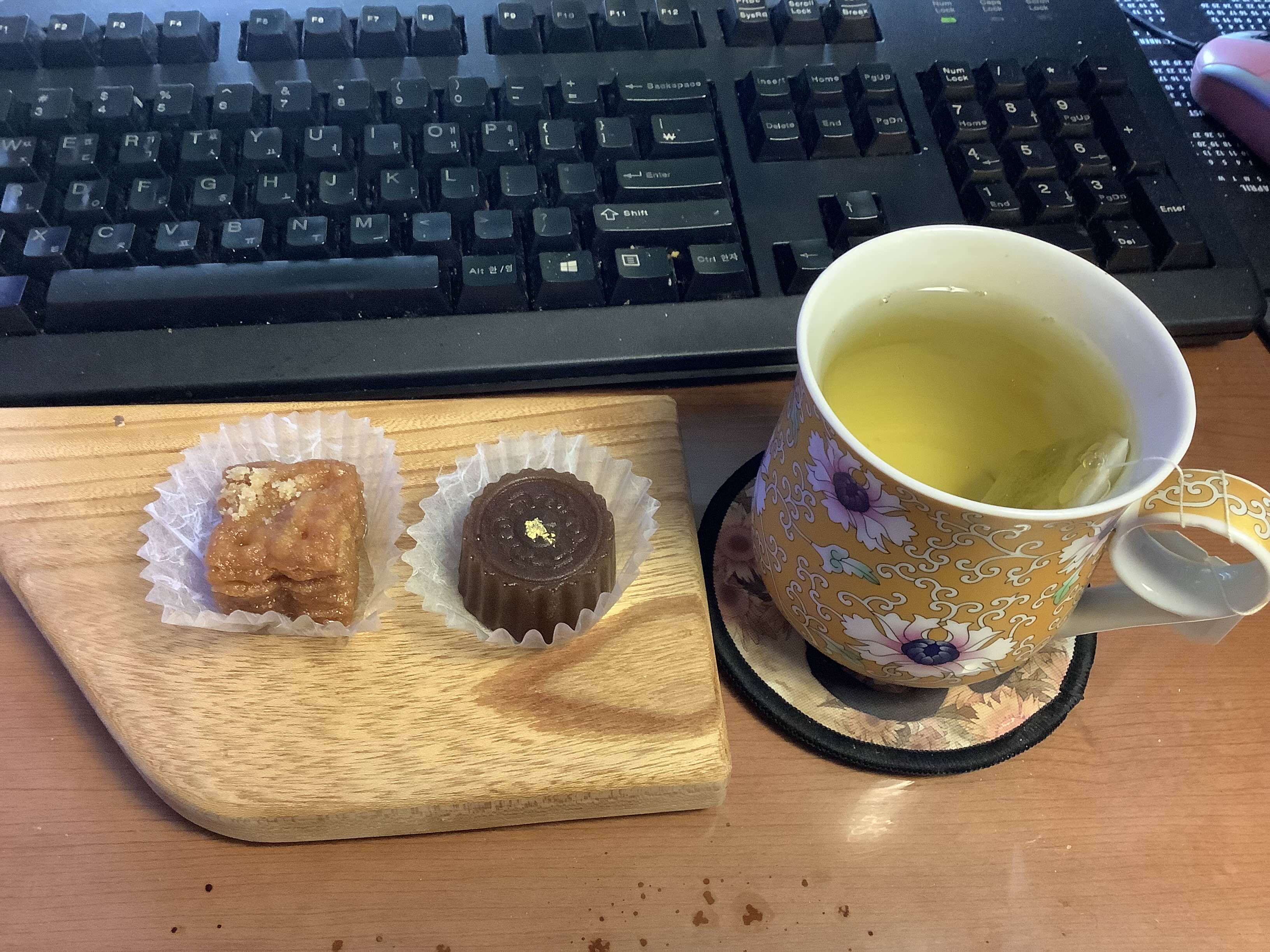 동생의 켜약과와 내가 만든 도라지대추청 넣은 양갱에 녹차. 아는 안정적인 맛~