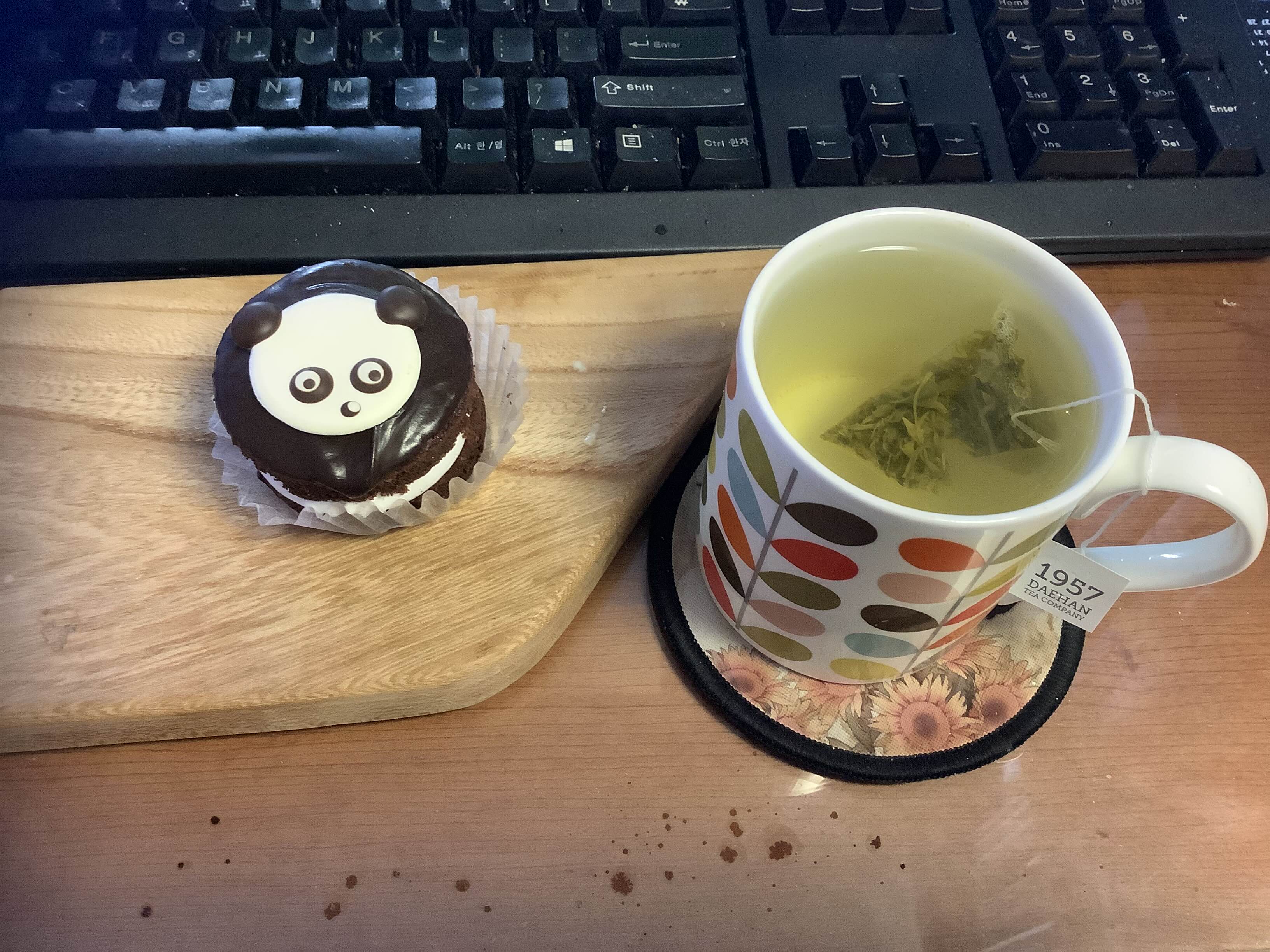 이건 오늘 티타임. 동생의 초코파이와 지난 가을에 다녀온 보성의 녹차밭에서 사온 우전녹차 티백 마지막 하나 남은 것. 저 초코파이 위에 얹은 팬더 머리 하나가 자그마치 500원!!!! 직접 만든 바닐라 마시멜로를 넣어 쫀득하니 아주 맛있음. 팬더가 없는 다른 종류의 초코파이에는 커피 마시멜로인데 그것도 또 독특하니 근사함~