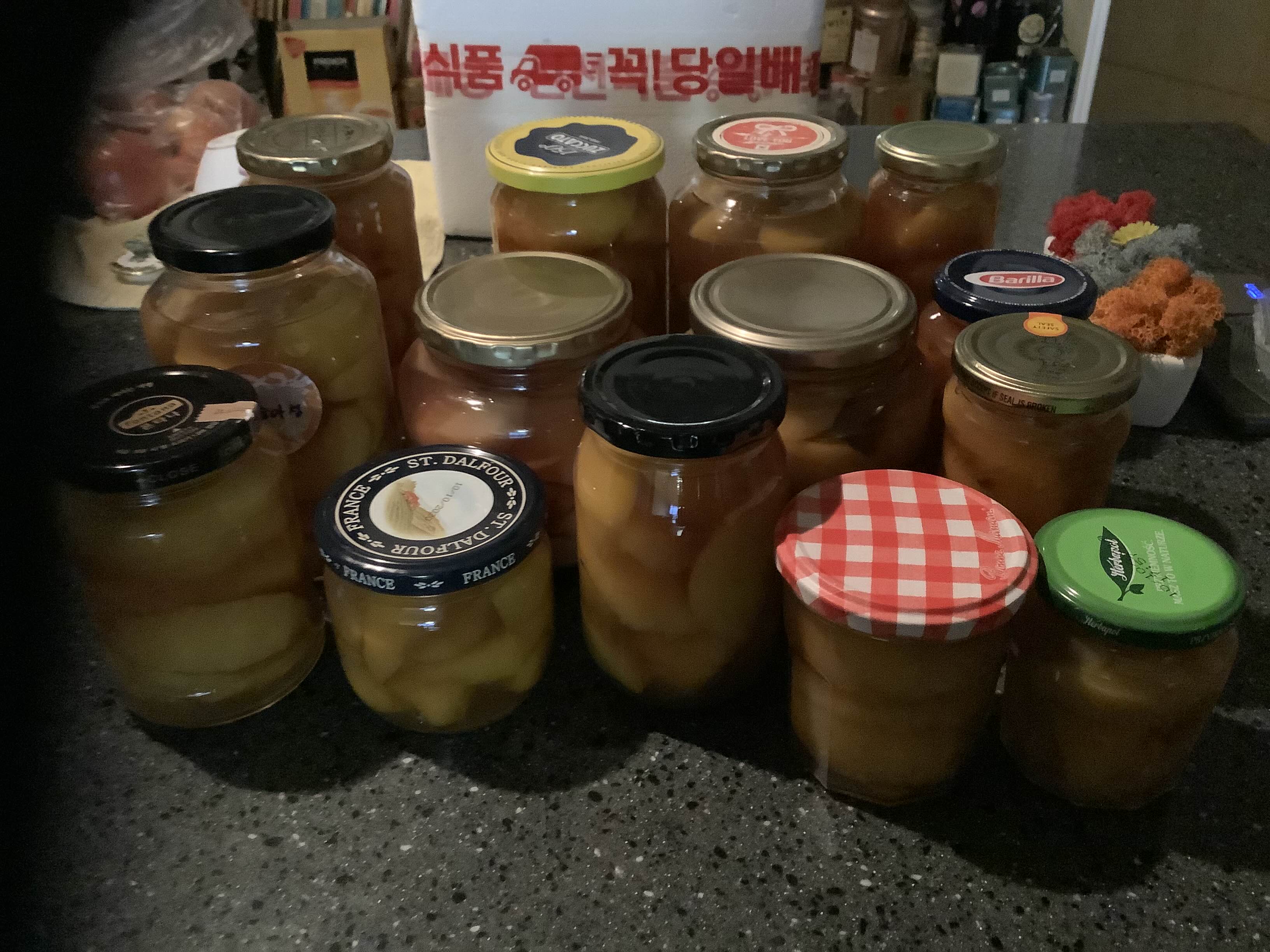 동네 가게에서 싸게 파는 거 1상자 10알, 동생이 오아시스에서 역시 세일하는 거 12알 황도에 + 집 냉장고에서 숙성 중인 맛이 좀 별로인 딱복 3알까지 다 병조림으로~ 붉게 물든 딱복은 병조림을 하고 하루이틀 지나니까 붉은 색이 절임물에 전체적으로 들어서 엄청 예뻐졌다.
