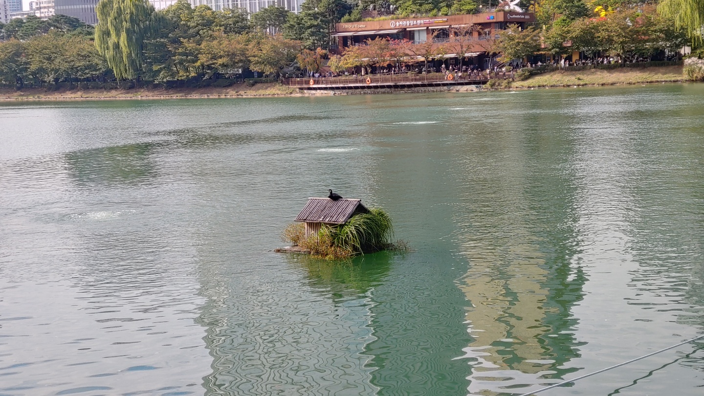 호수공원의 오리 집. 오리 집이라는 걸 표시하기 위한 인형인 줄 알았더니 정말 오리였음.