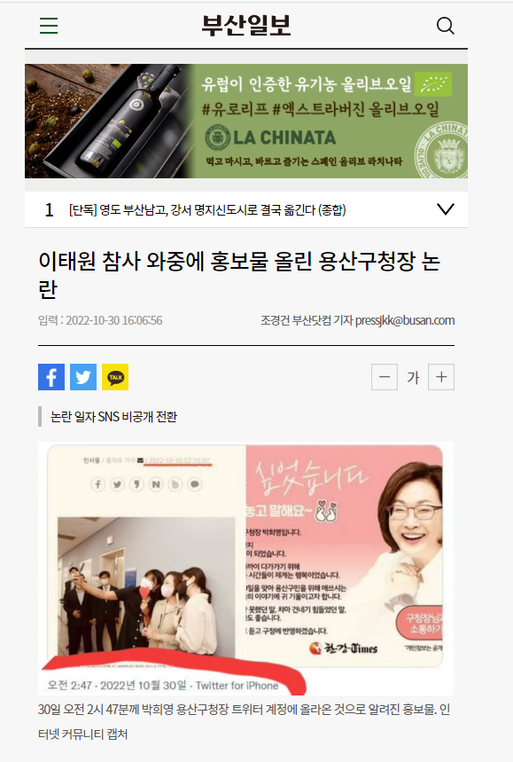저 부산일보 기사도 용산구청 공보팀이 무슨 광고로 딜을 했는지 지금은 삭제되고 없음. 트위터, 인스타며 다 지우고 유튜브는 닫고 잠수한 다음에 애도하는 척, 일하는 척 열심히 보도자료 뿌리고 있던데 기록은 기억보다 우월하다는 걸 남겨두기 위해서 포스팅함.