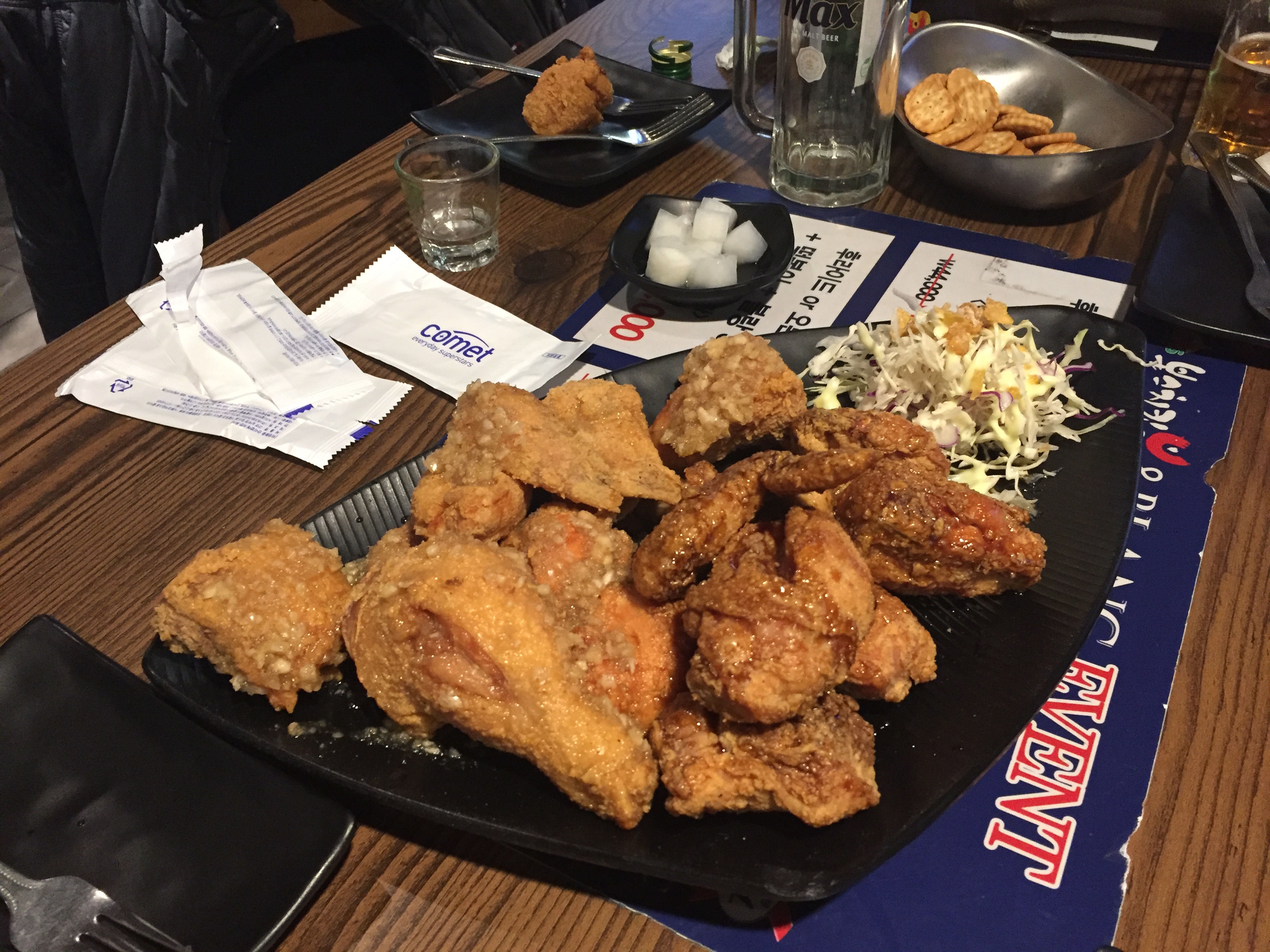 근처 치킨 & 호프집으로~ 주말 시청인데 엄청 복작. 촛불집회 사회본 양반들도 여기 온 거 보니 여기가 촛불 집회 특수가 좀 있는듯. 생맥주는 물을 많이 탔는지 좀 맹맹하지만 술이 약한 애들은 순하다고 좋아하고 추천하는 마늘 치킨 맛있었다. 간장 치킨은 배불러서 눈으로만 구경.