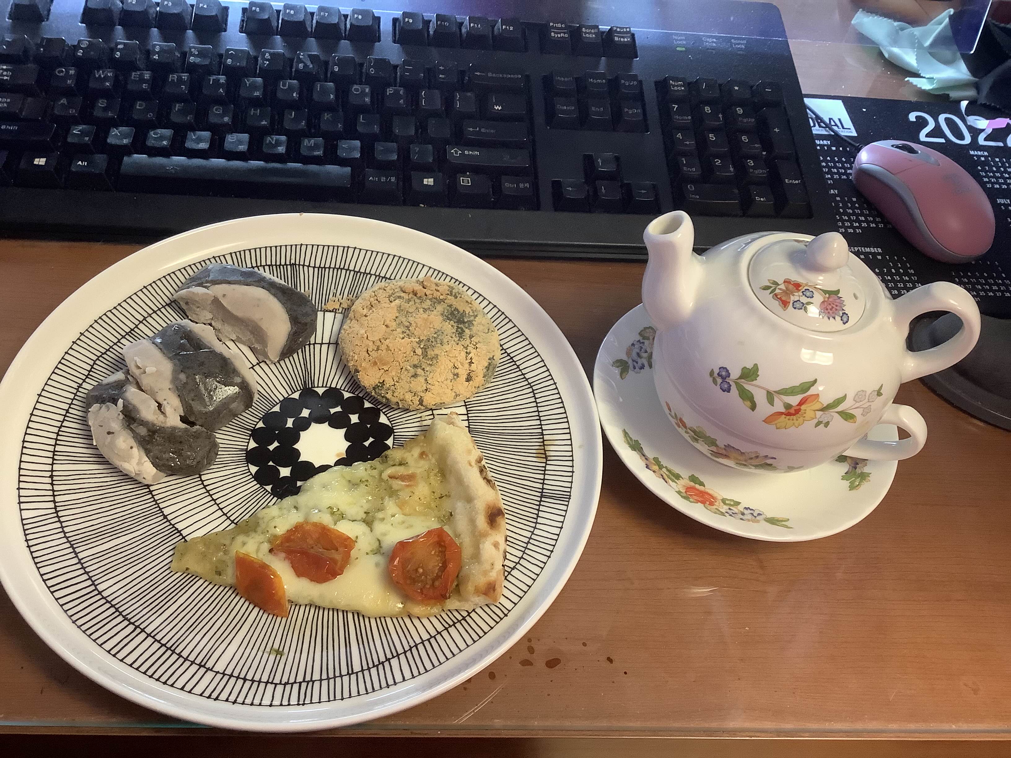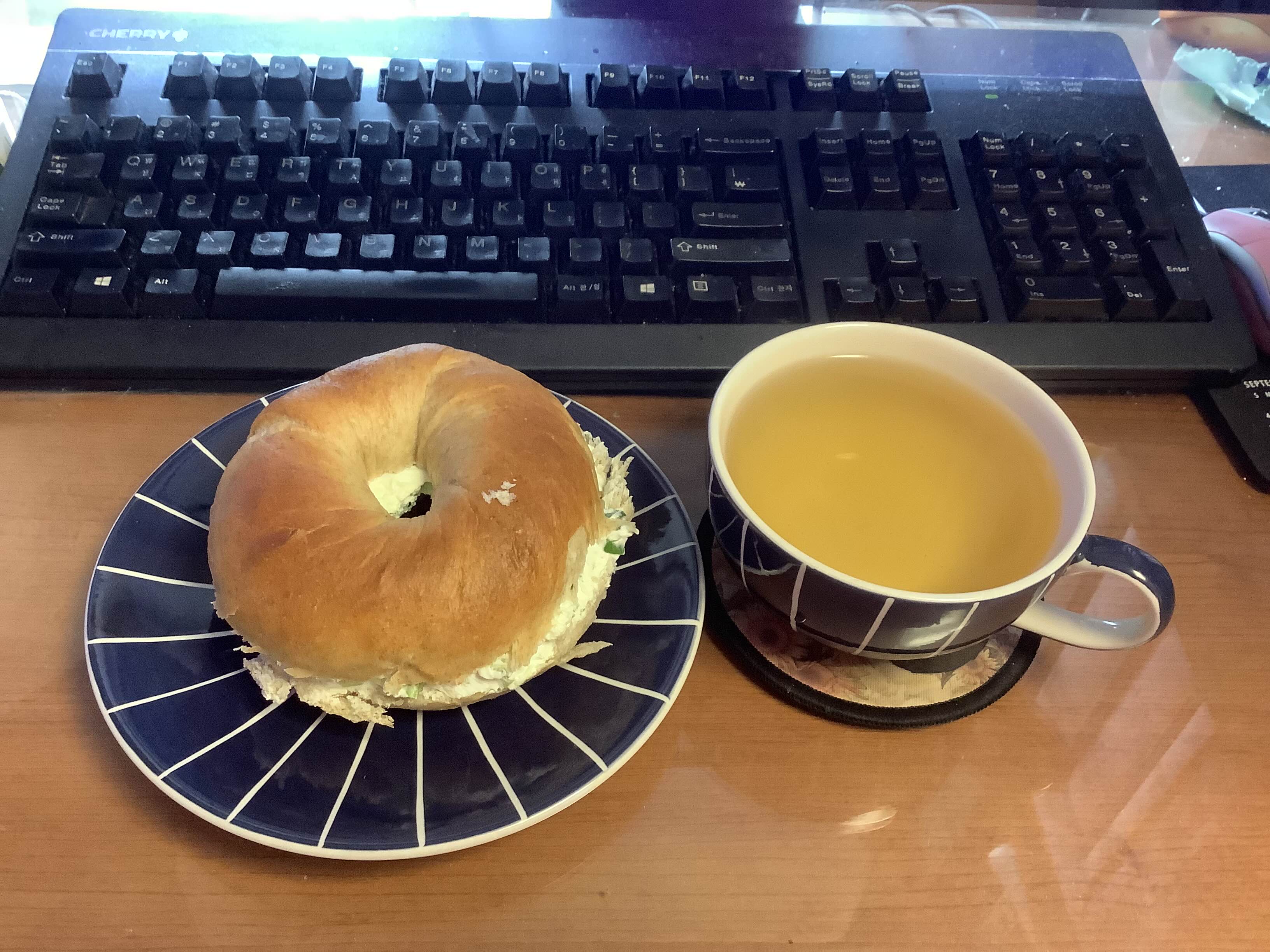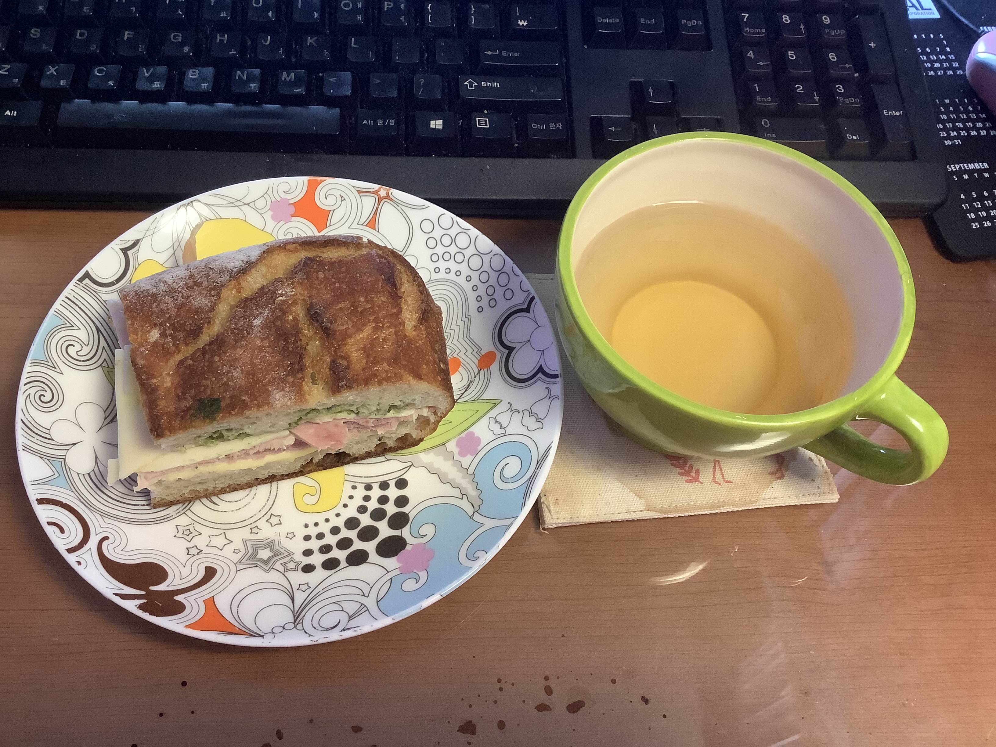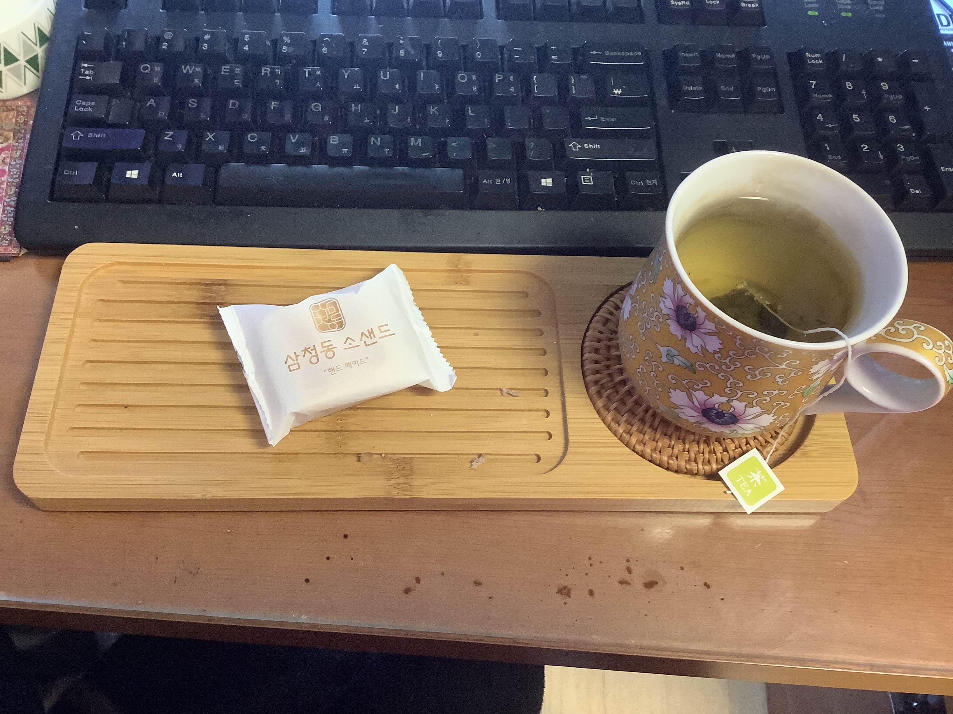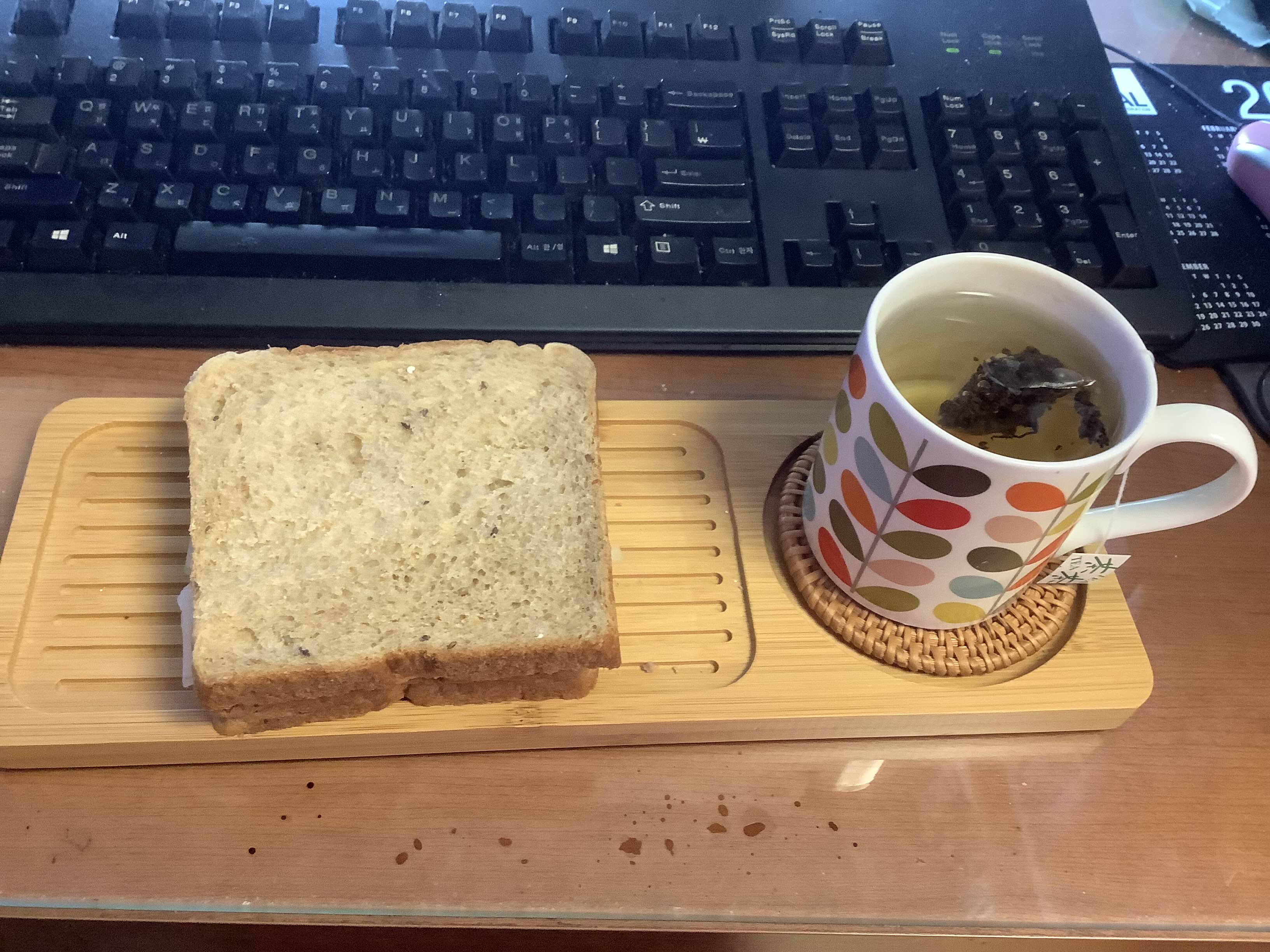 전날 베이글에 넣고 남은 쪽파 크림치즈를 달달 긁고 얇게 썬 오이를 켜켜이 얹은 오이 샌드위치에 중국 홍차. 이날 바로 위에 있는 토토로 볼과 유리 잔까지 한꺼번에 해먹은 터라 몸 사리는 의미로 대만에서 사온 대나무 접시를 꺼냈다. 저거 보니까 대만 가고 싶네...