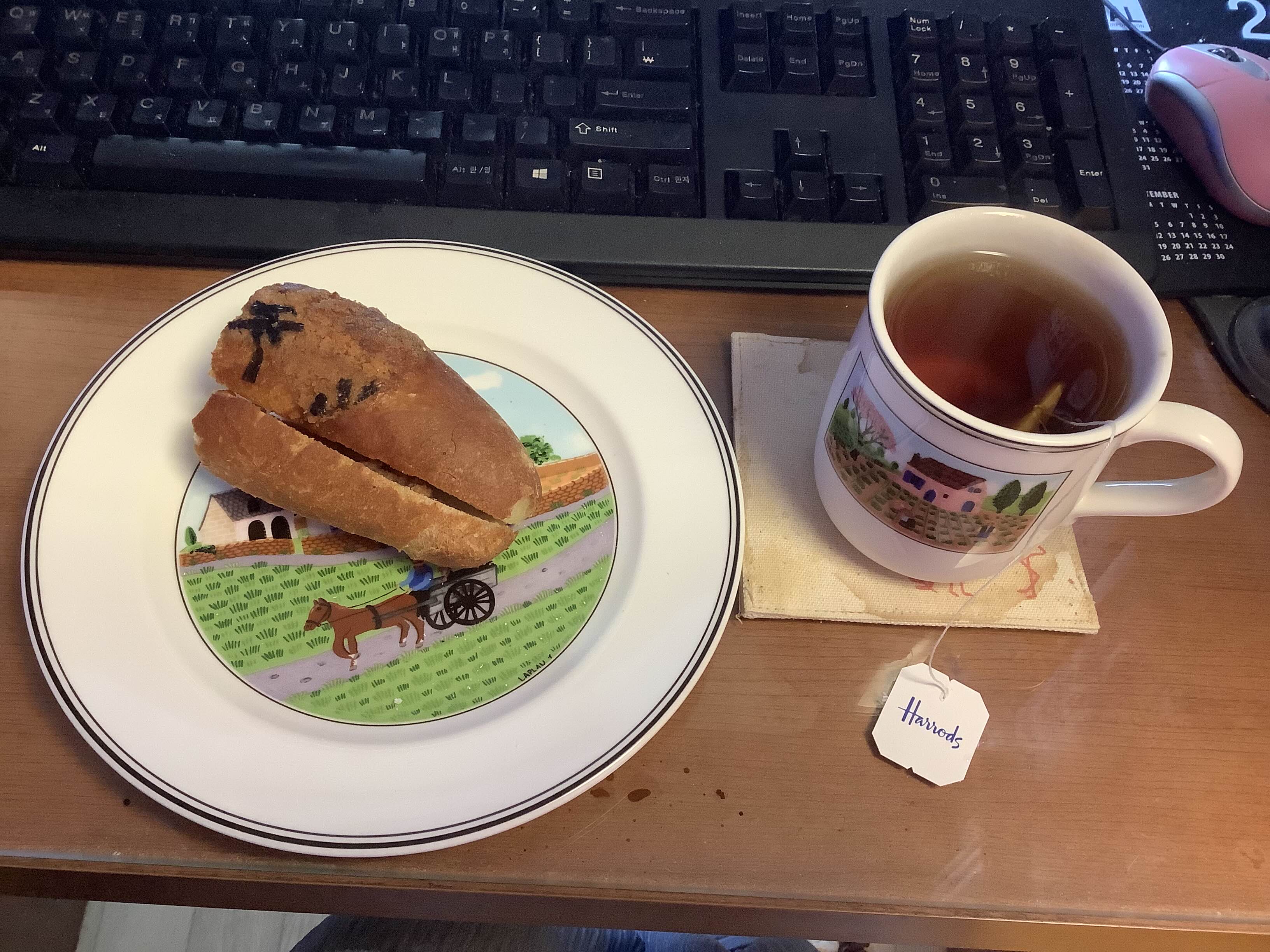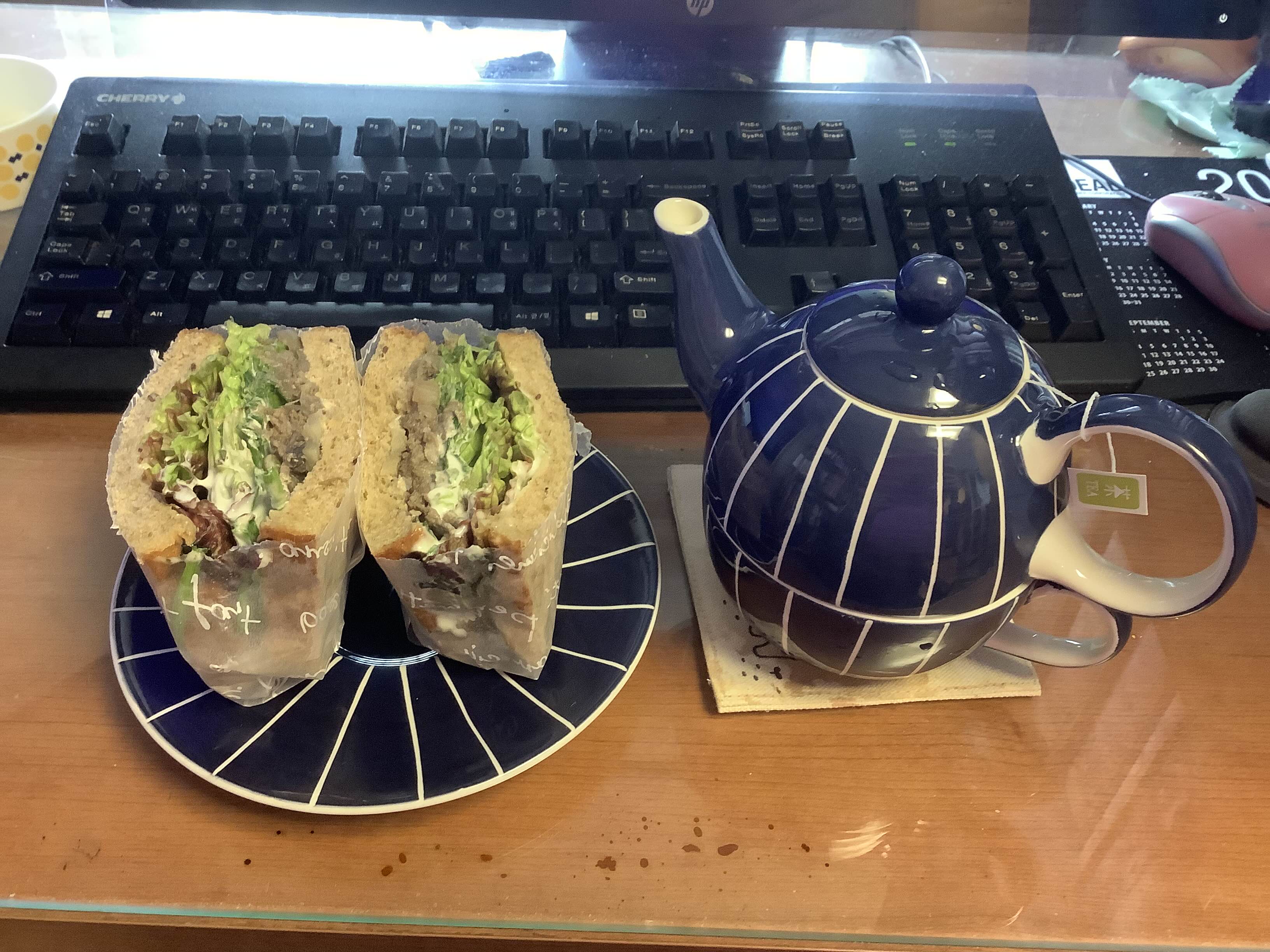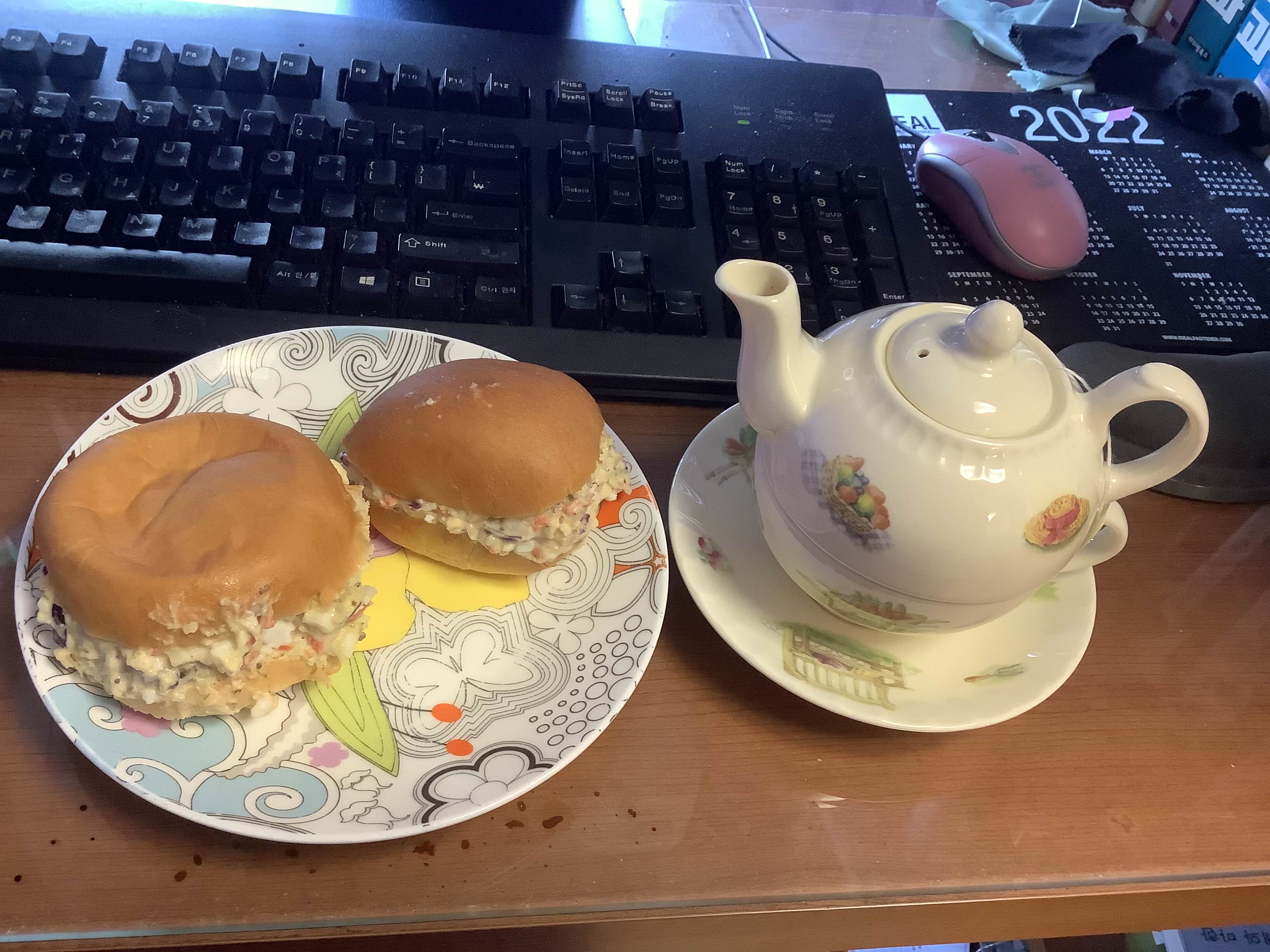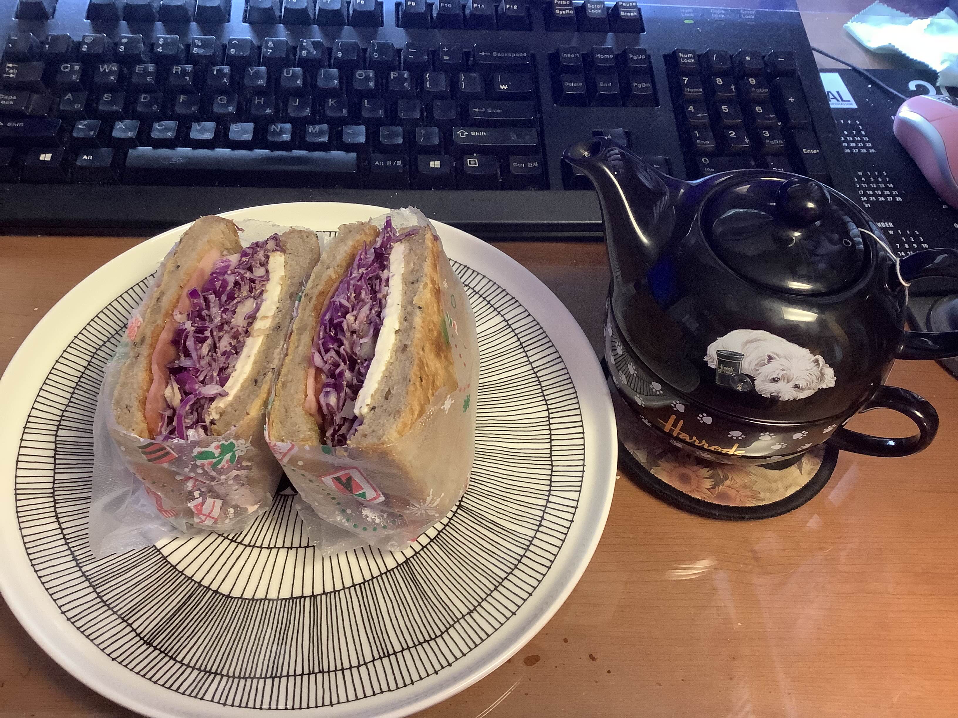 보라 양배추를 열심히 먹는 계획의 일환으로 누마상 샌드위치. 내 나름으론 빵빵하게 양배추를 채우는데 완성하고 보면 항상 뭔가 빈약해 보인다. 배가 뽈록하게 채우는 것도 기술이 필요한 모양. 곁들인 홍차는 해로즈 다즐링. 티포원도 해로즈 멍멍이~