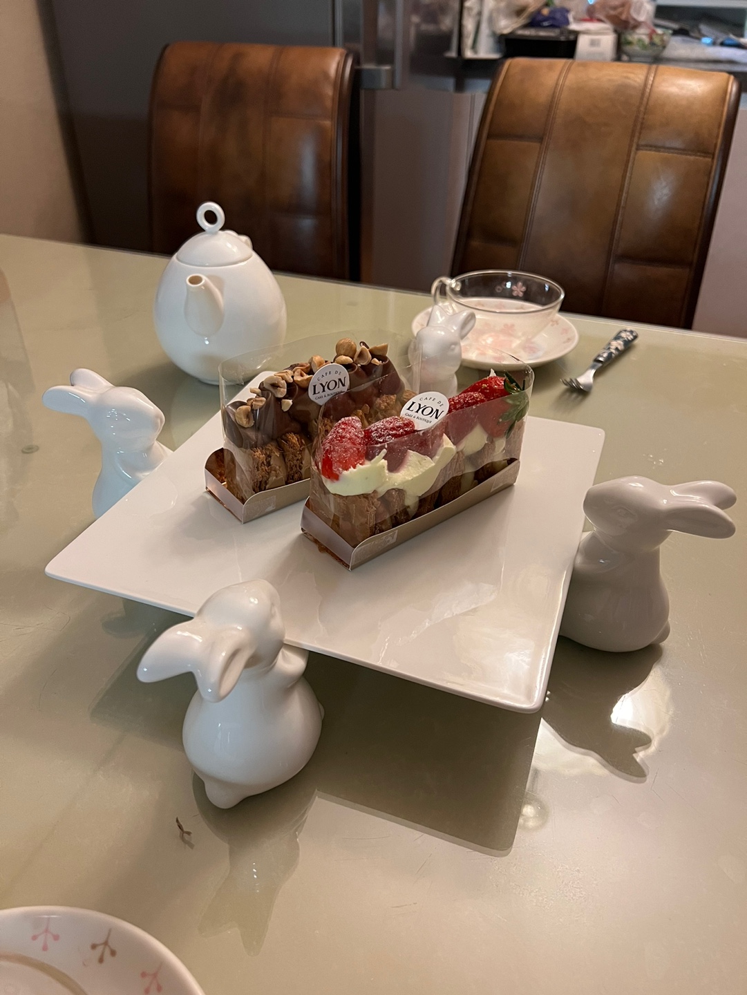 토끼 해를 맞아서란 핑계로 들인 토끼 받침접시에 카페 드 리옹의 밀푀유. 토끼와 접시는 분리 가능해 보관하기 좋음. 배가 너무 불러서 딸기 밀푀유만 먹고 잠발라는 냉장고로~ 곁들인 티는 마리아쥬의 마르코폴로 루즈. 문제가 생겨서 이제 마르코폴로 대신 폴로 클럽이라고 한다는데 뭔가 딱딱하고 풍취가 사라짐.
