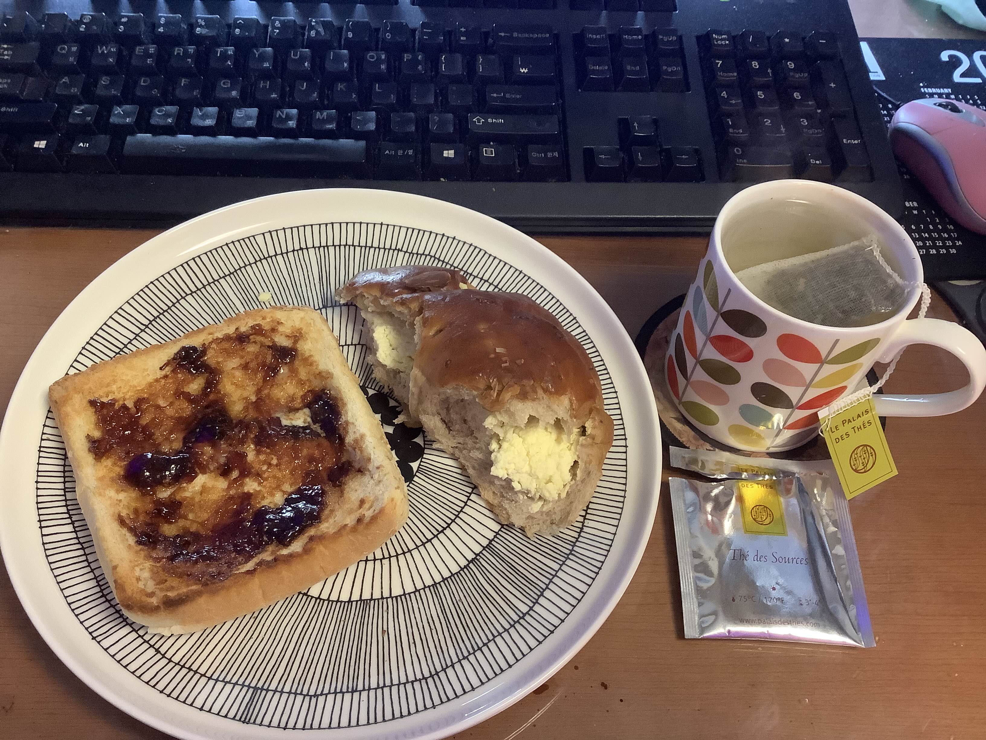 성심당 크림치즈빵. 달지 않은 건 좋은데 좀 심심. 호두가 들어갔다면 좋았을 것 같다. 자가제조 딸기잼토스트는 밀도 식빵. 팔레 드 떼의 The des Sources. 향긋~